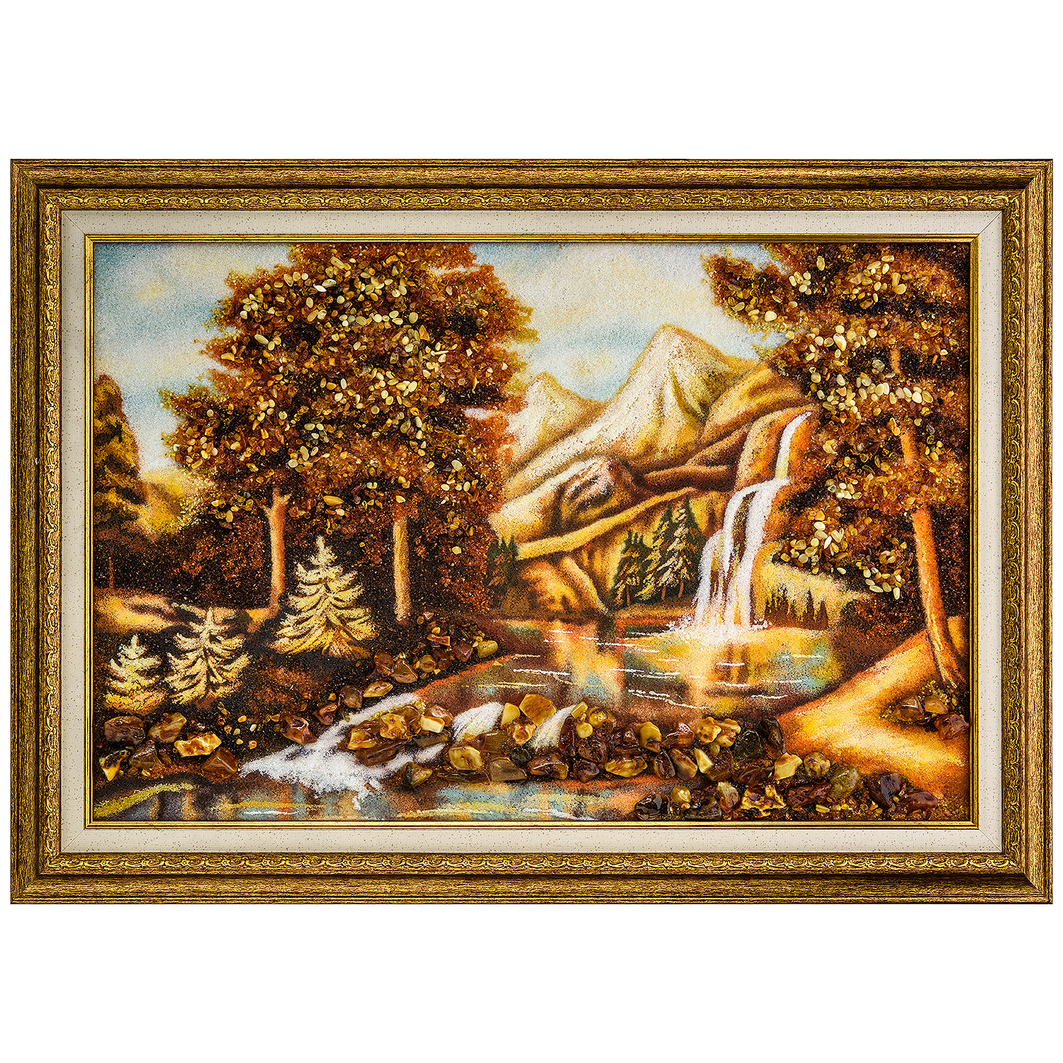 Русские подарки и сувениры → Интерьерные изделия → Картины → Картина янтарная "Водопад в лесу" 60х40 см
