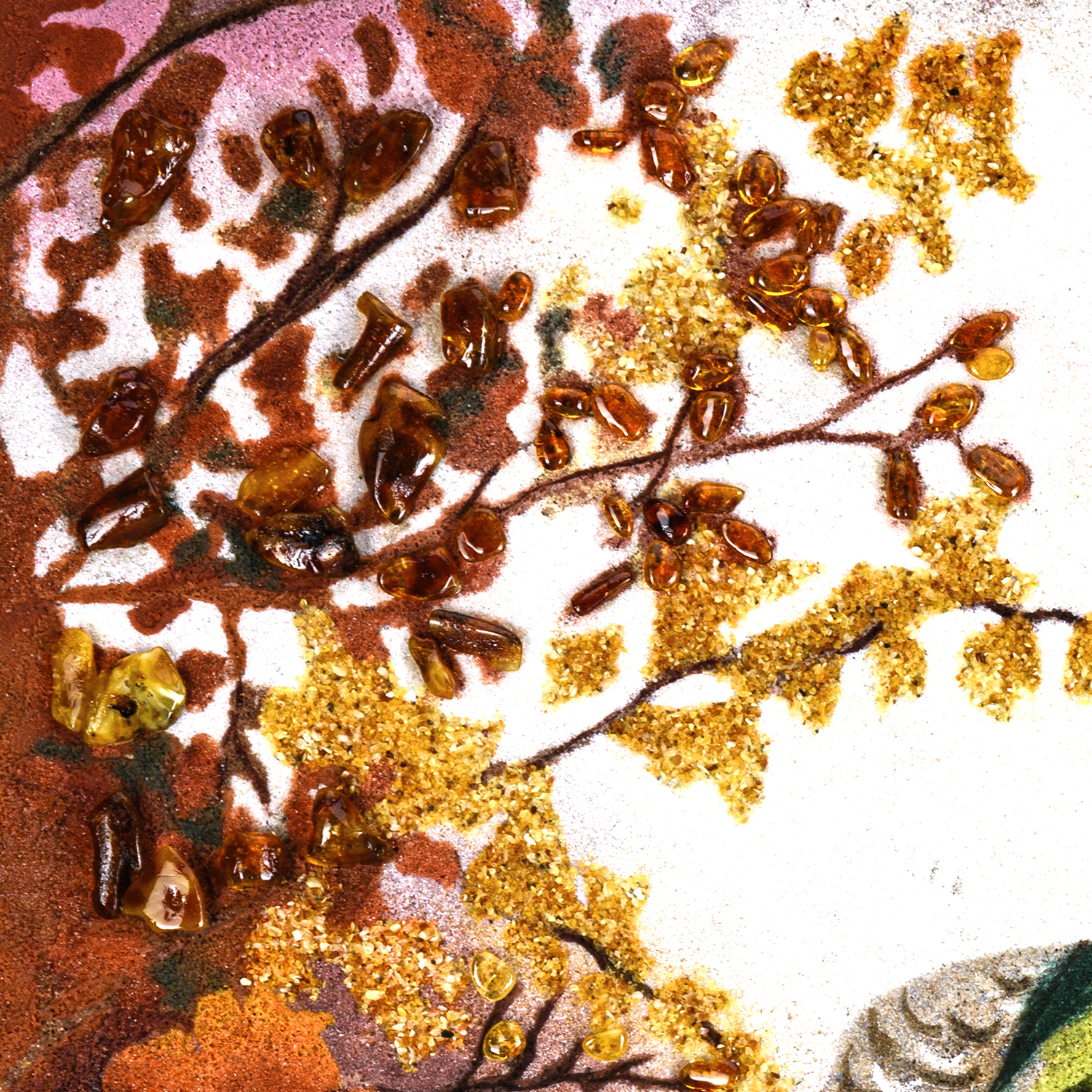 Картина янтарная "Павлин".Материалы: фанера, краски, янтарь.
