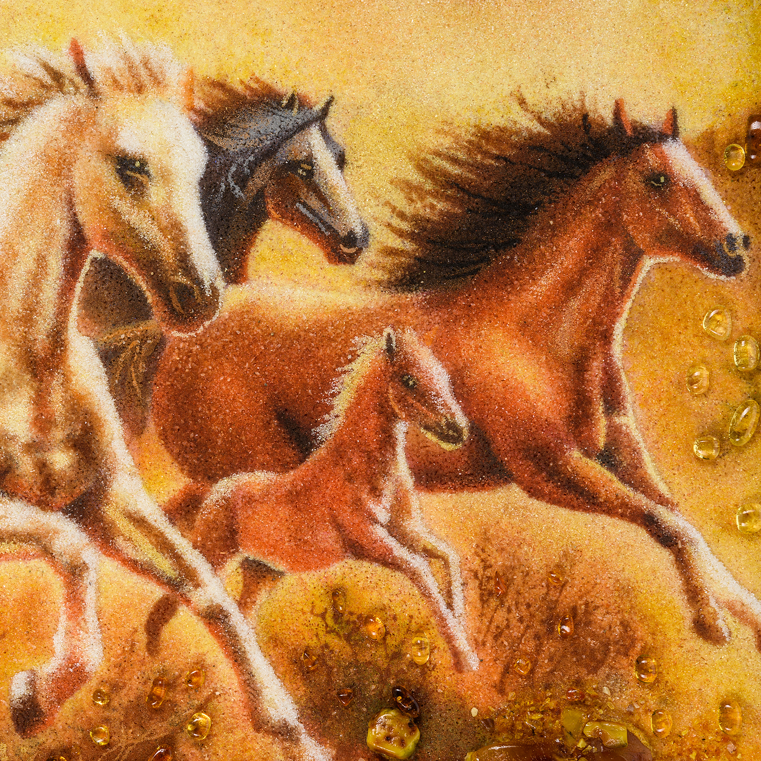 Картина янтарная "Кони с жеребенком".Размер холста: 60х40 см