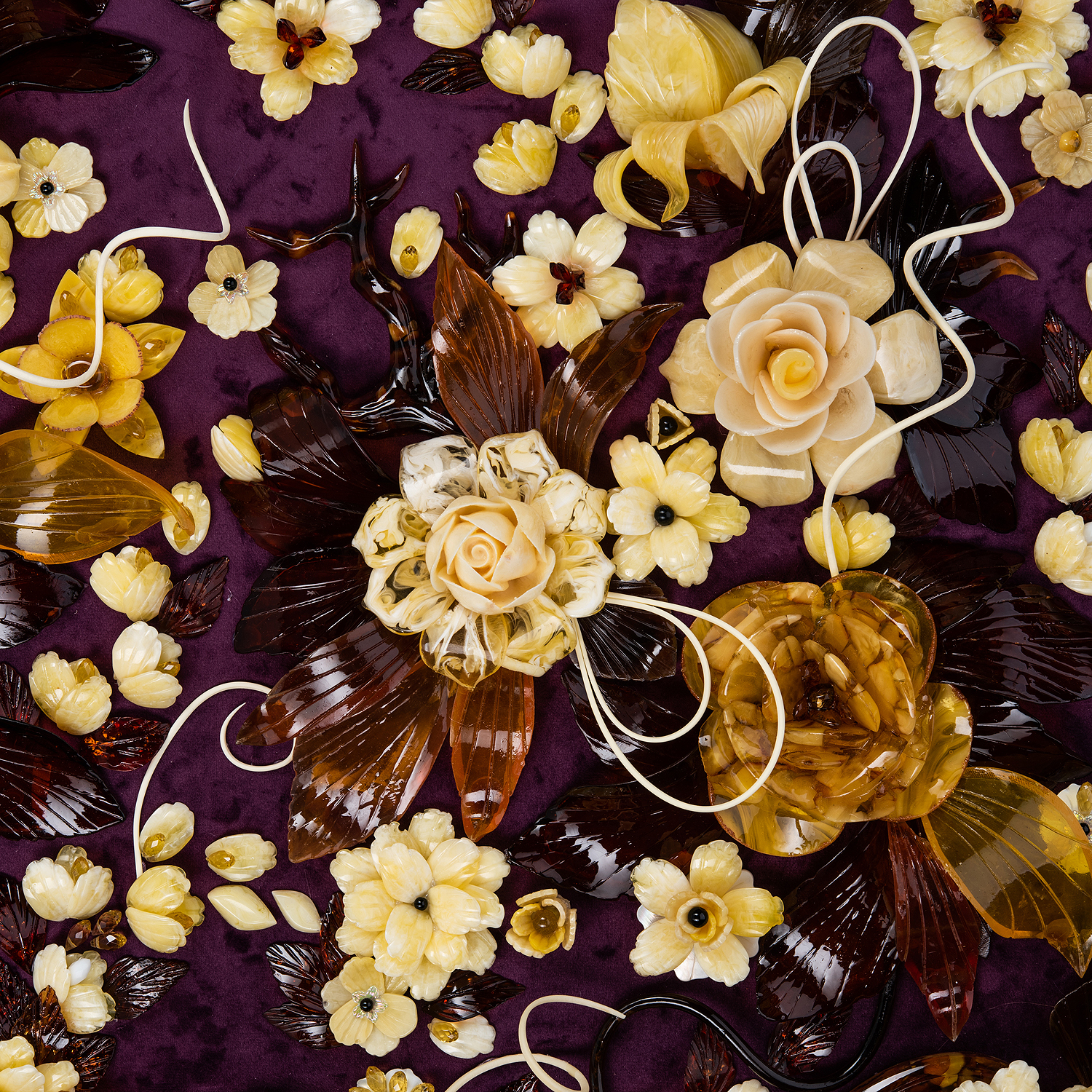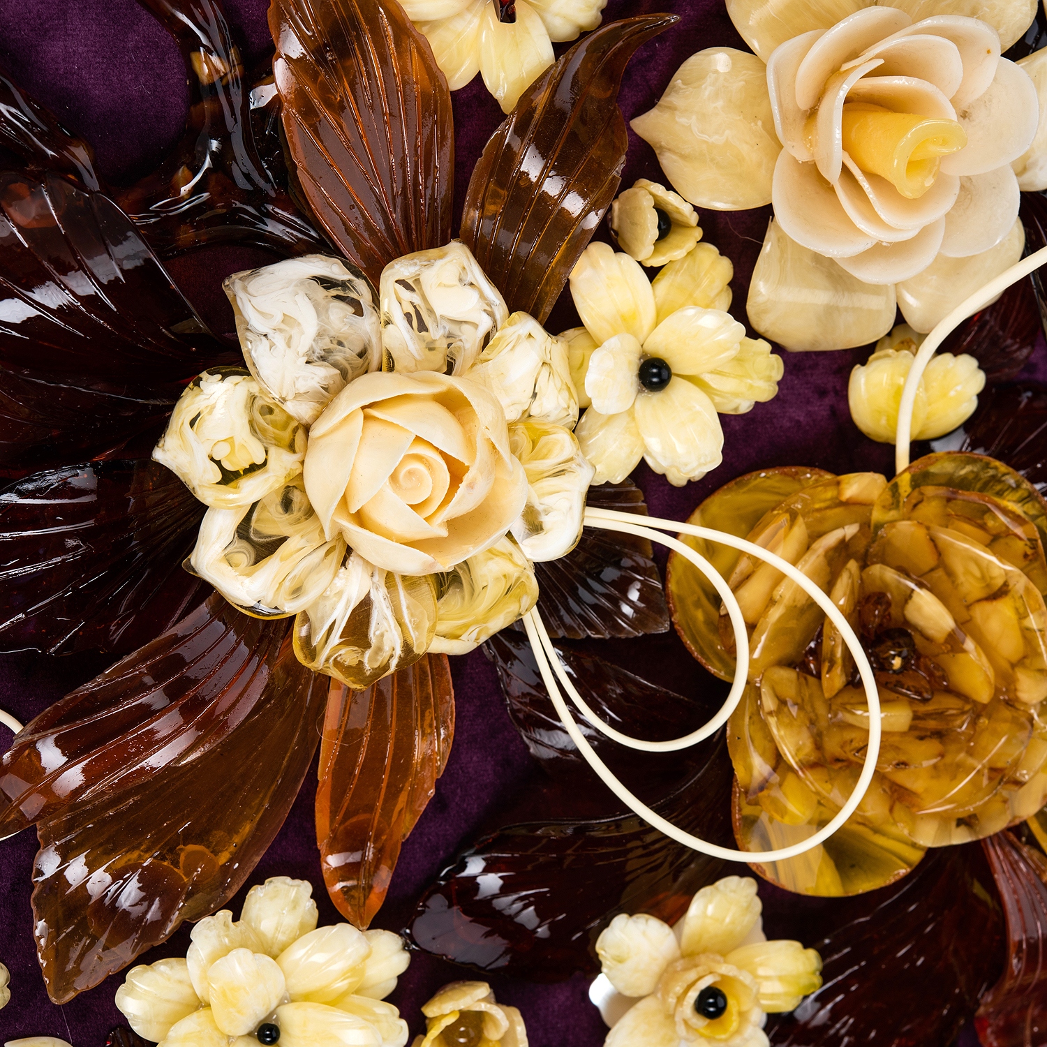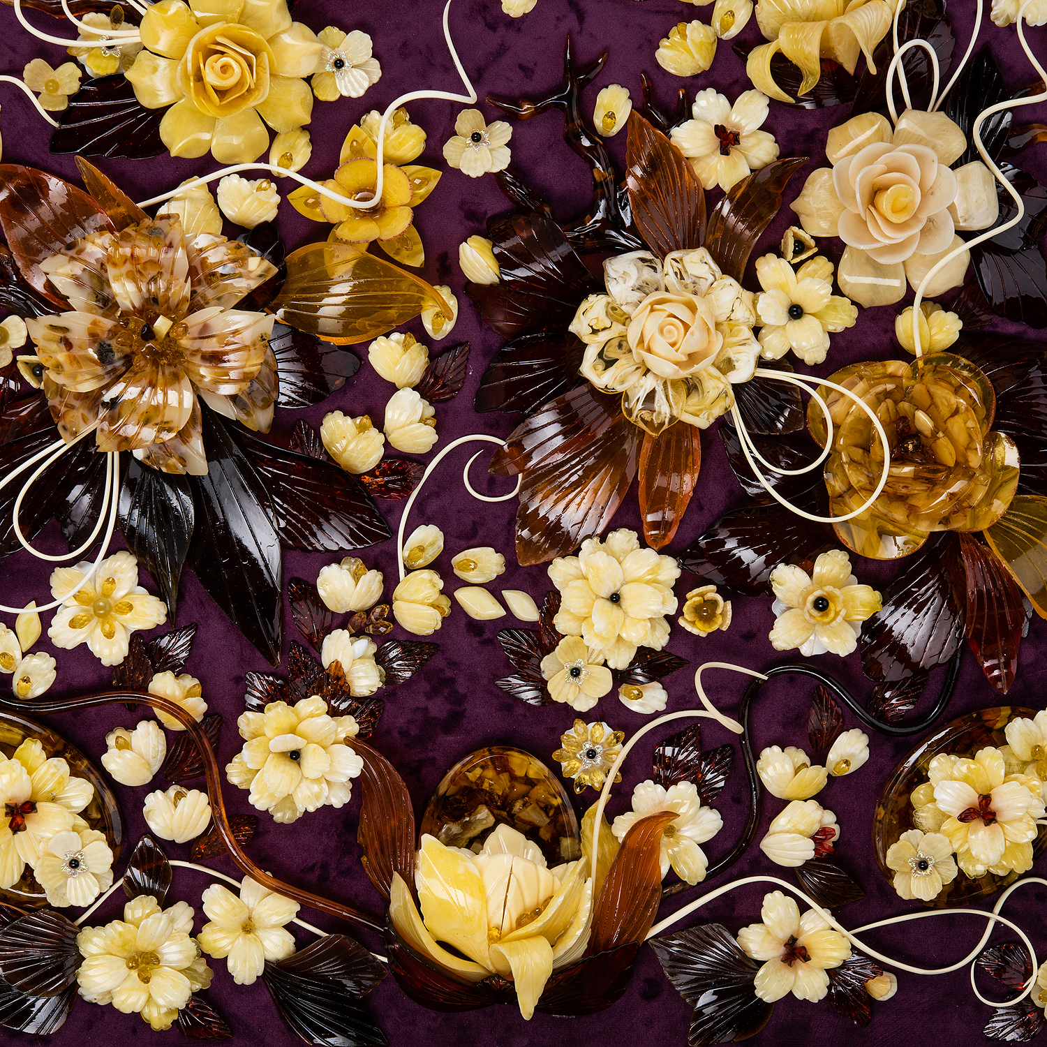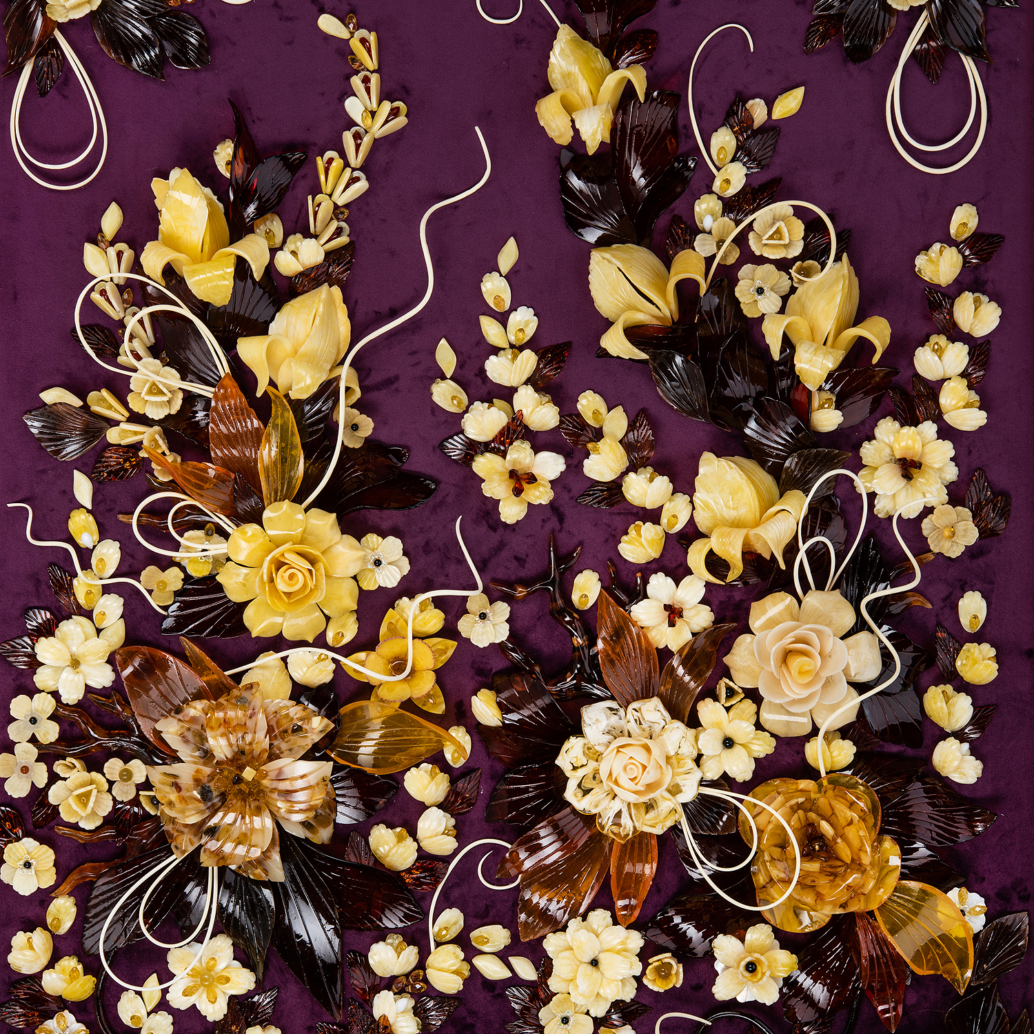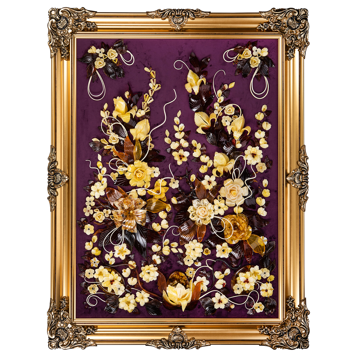 Картина янтарная "Версальский букет".Материалы: янтарь, бархат, багетная рама.