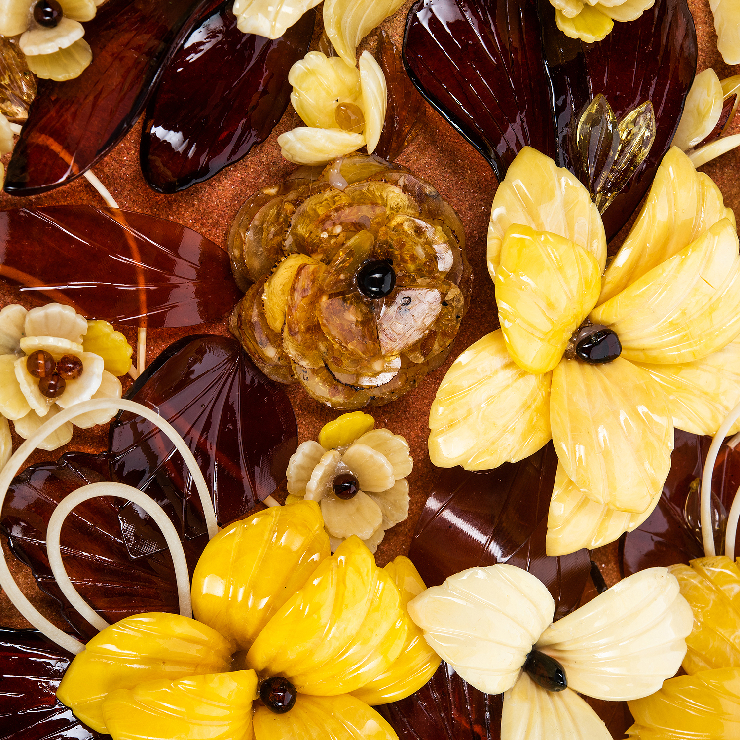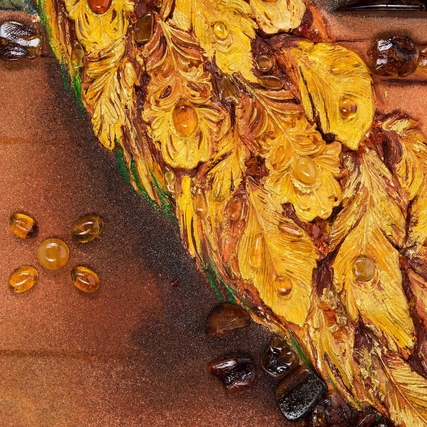 Материалы: фанера, гипс, краски, янтарь, жемчуг, багетная рама.