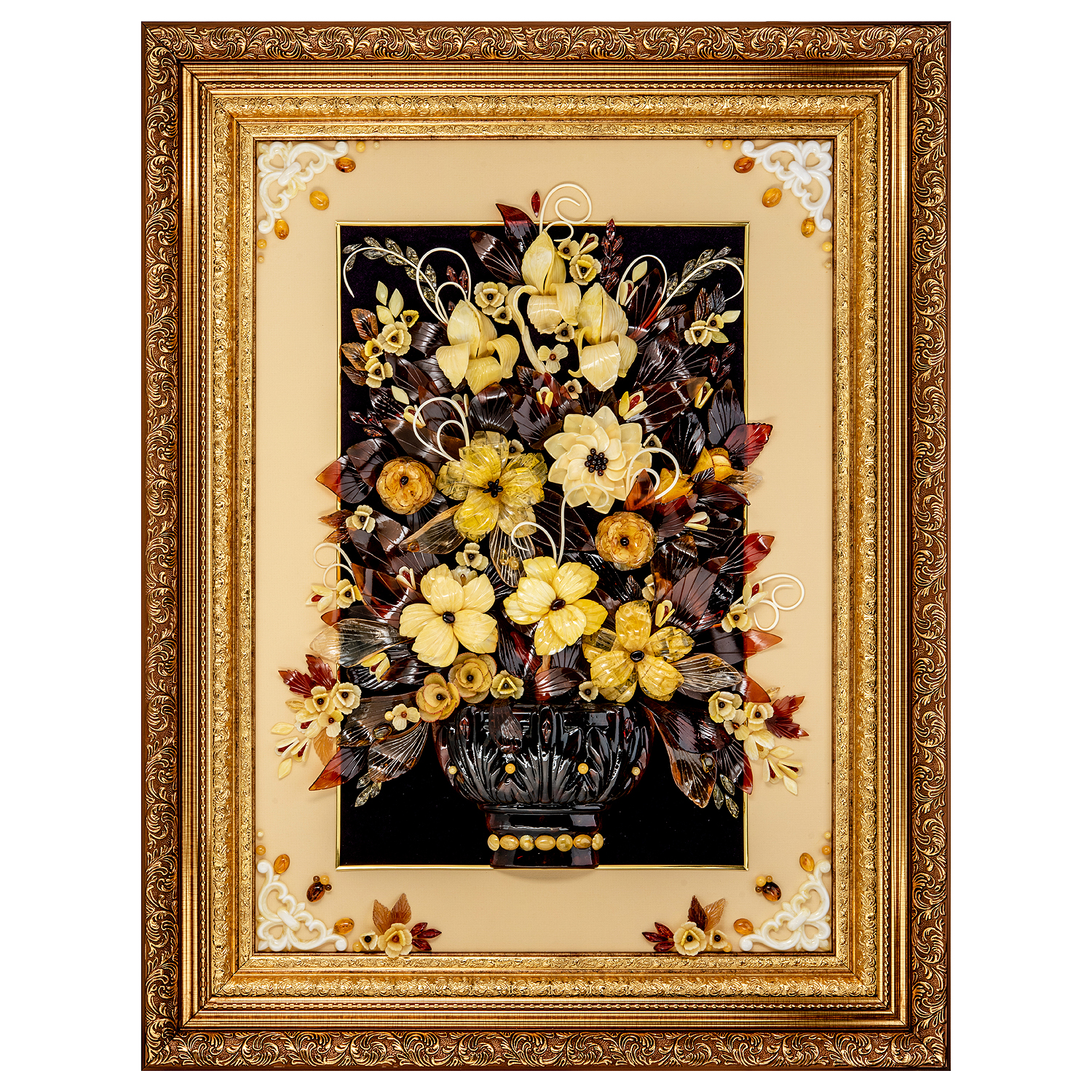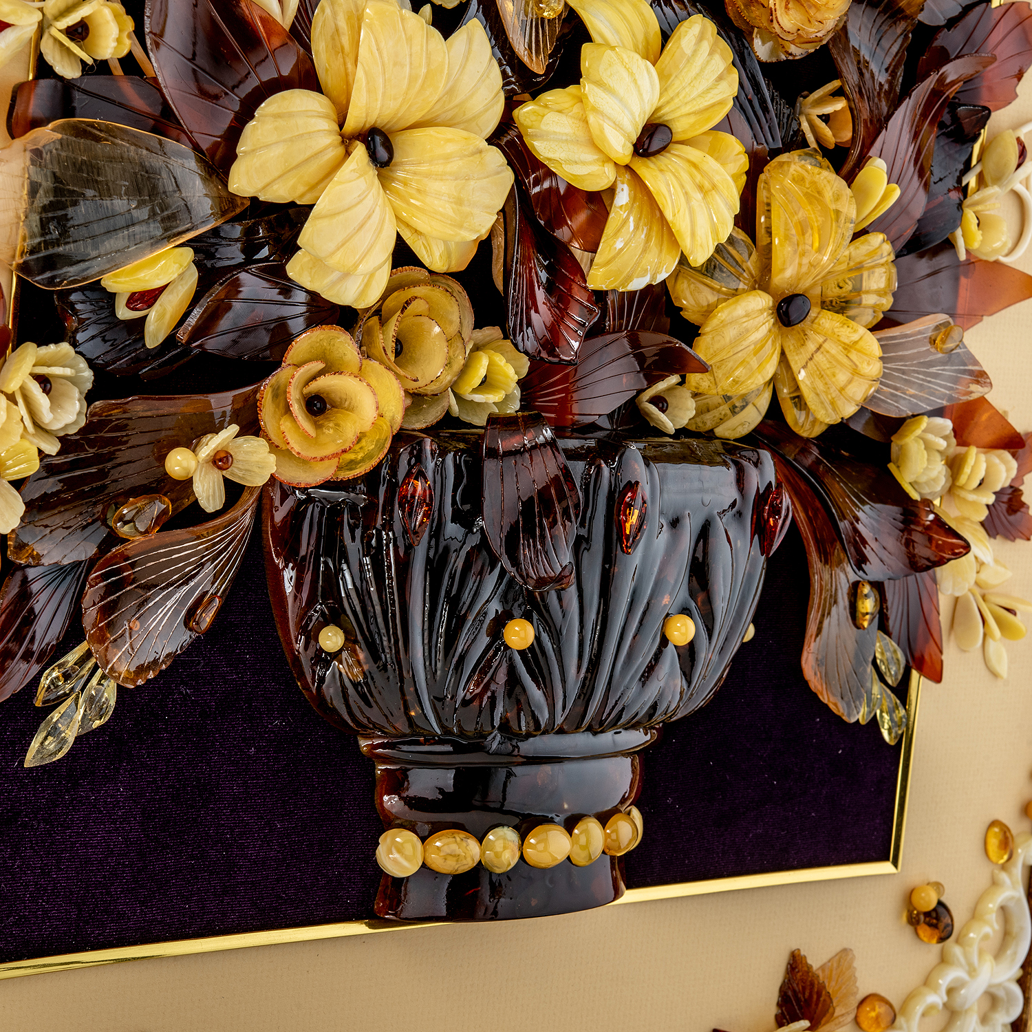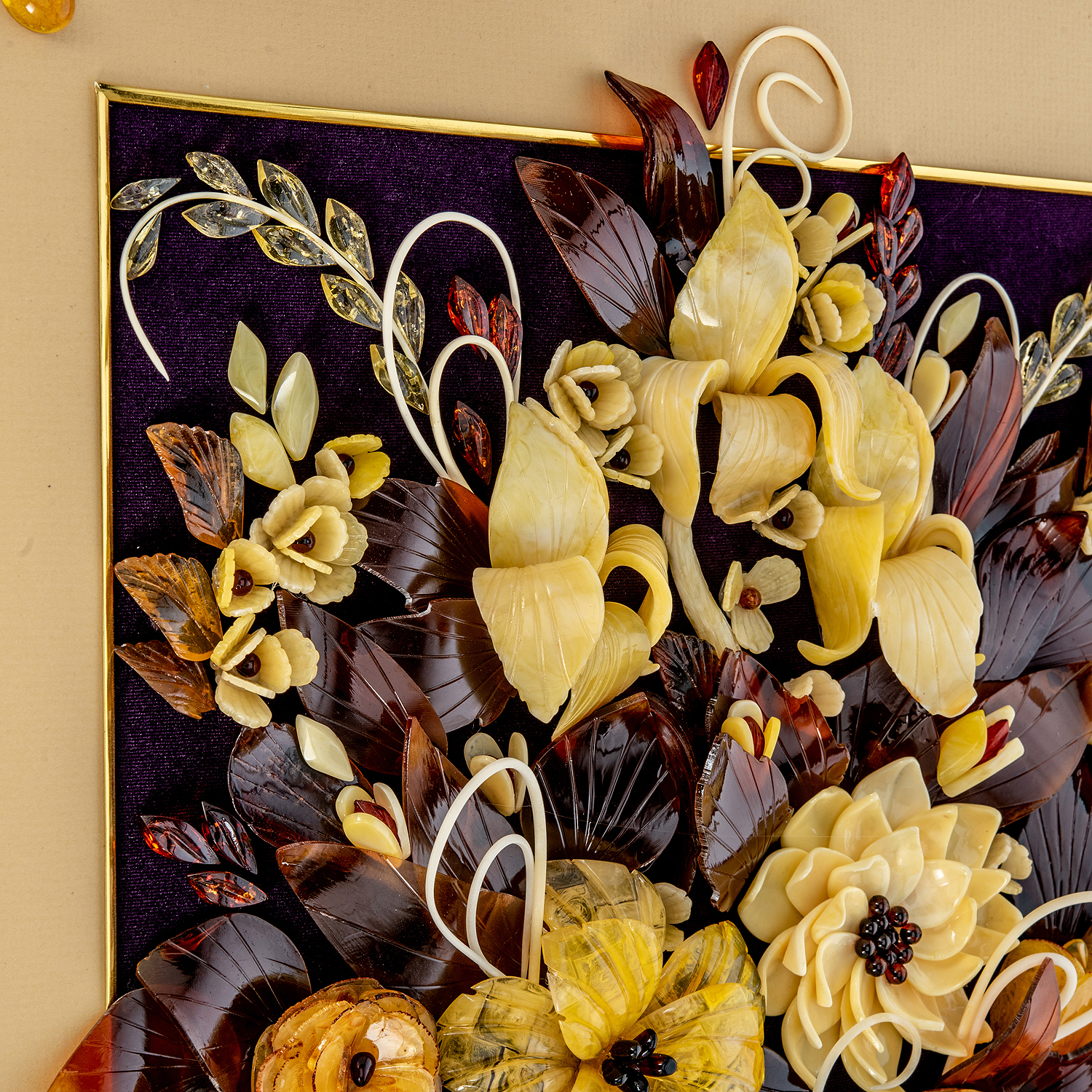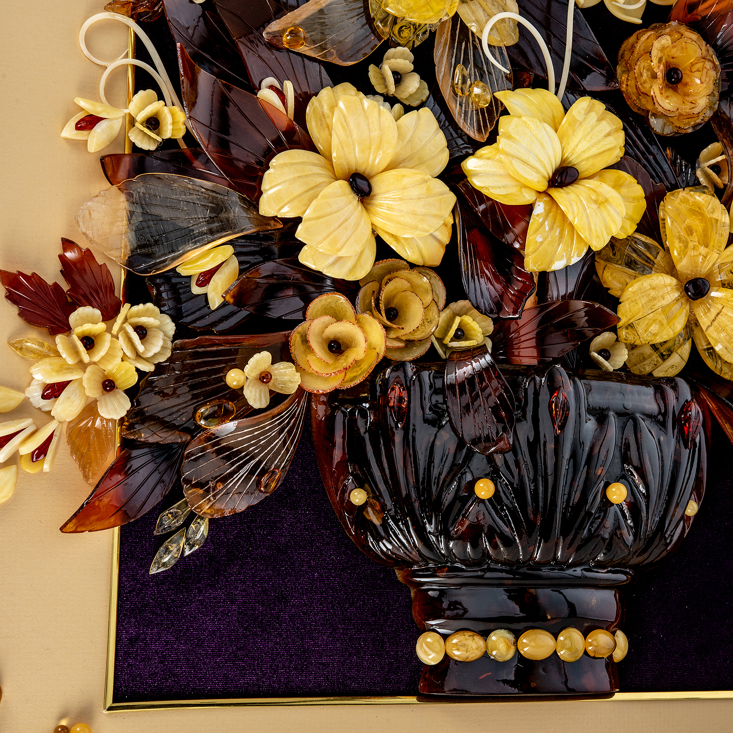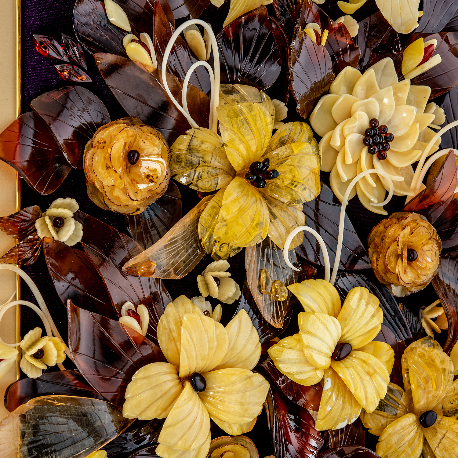 Картина янтарная "Букет цветов".Материалы: бархат, янтарь, багетная рама.