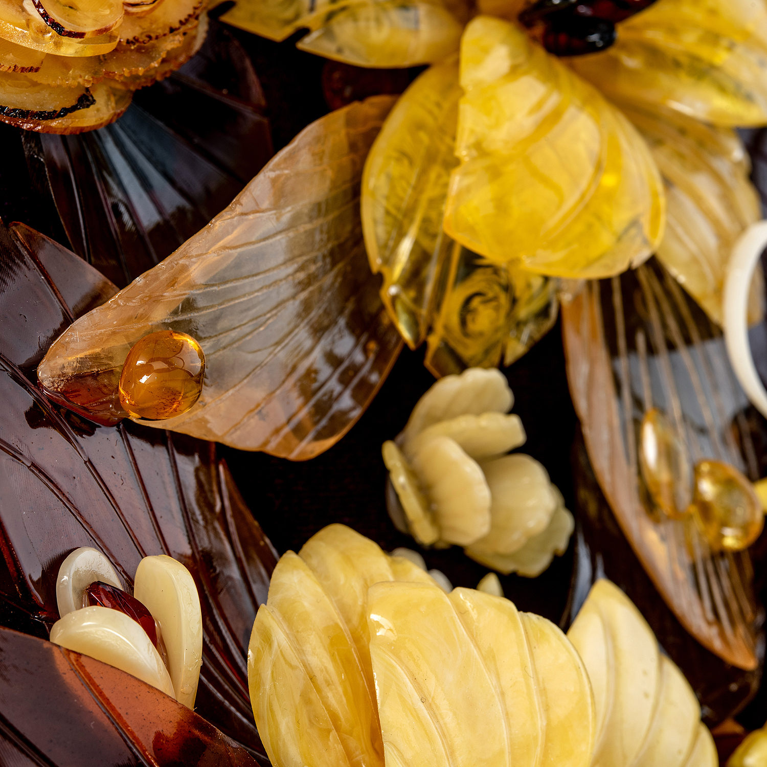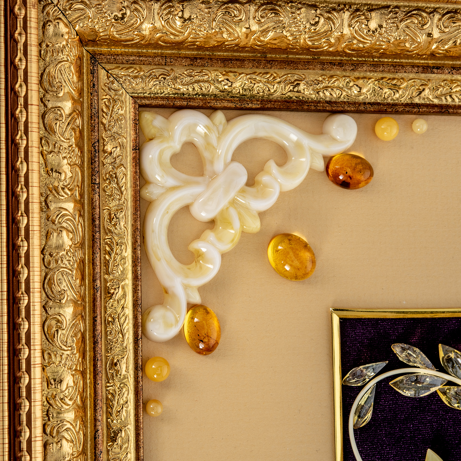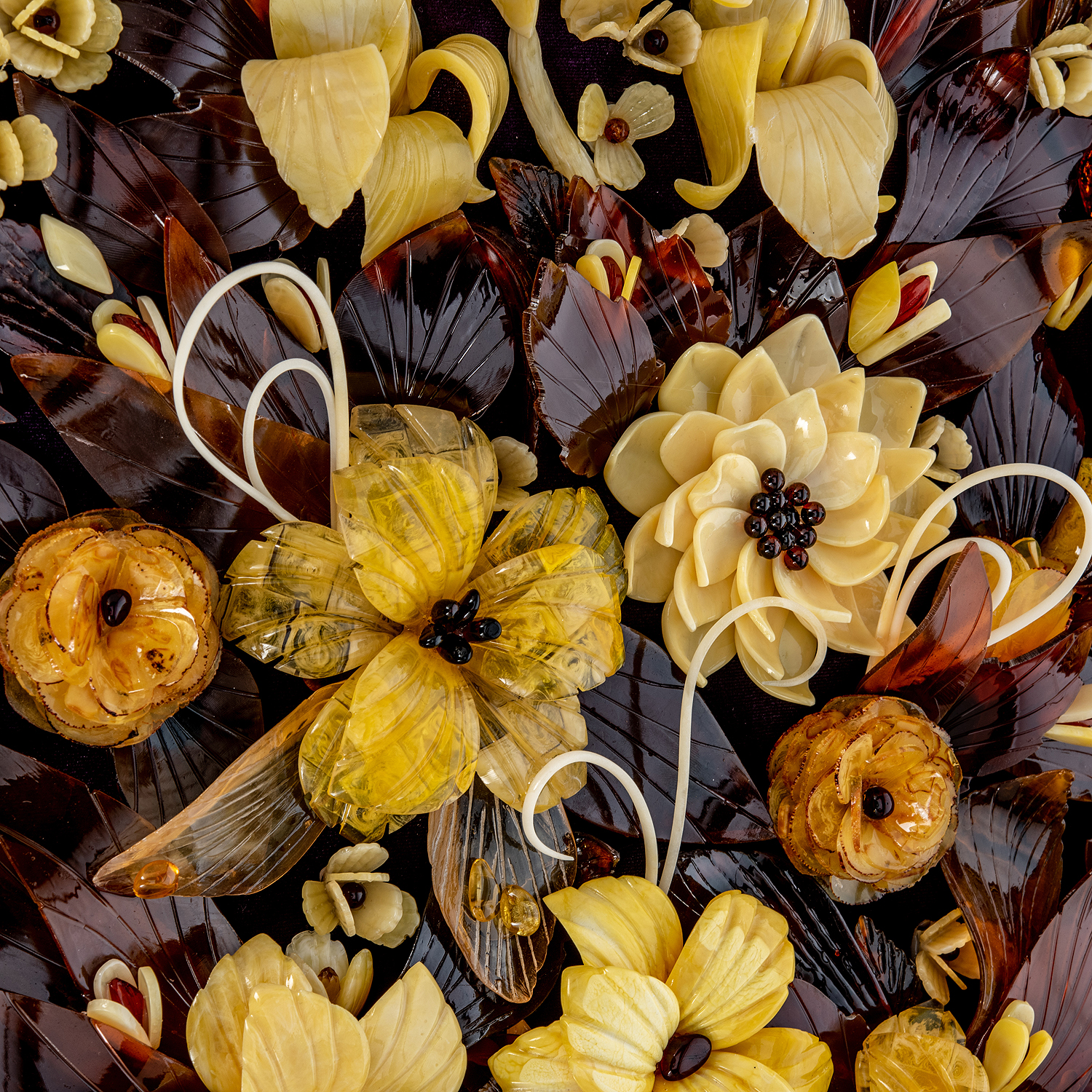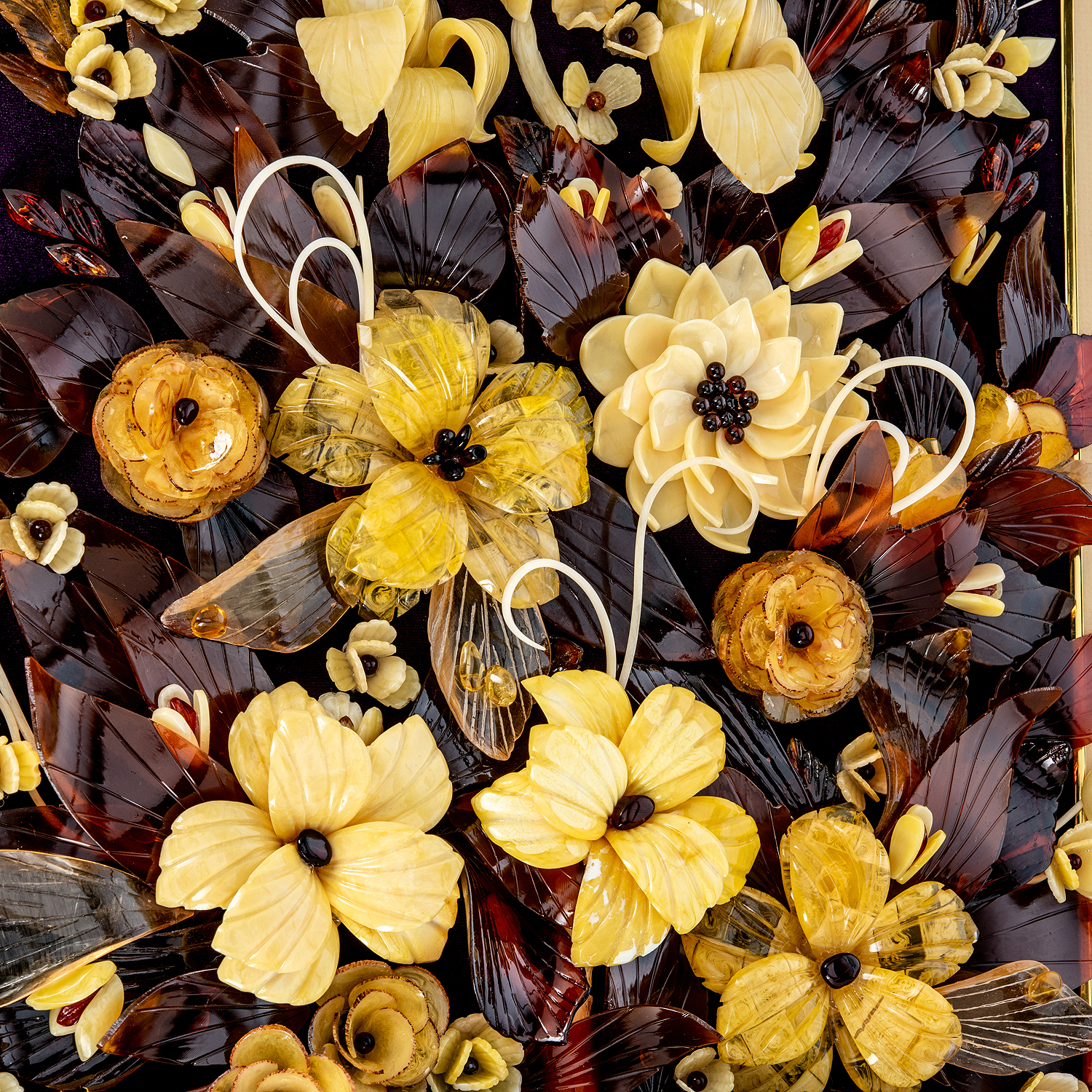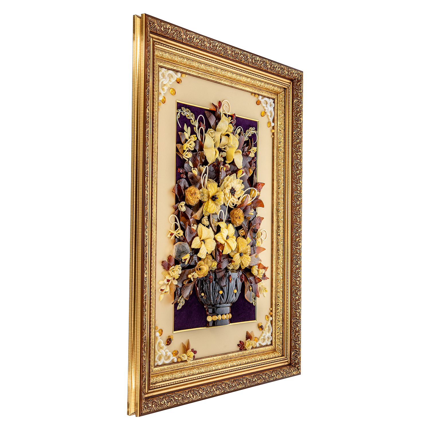 Картина янтарная "Букет цветов".Материалы: бархат, янтарь, багетная рама.