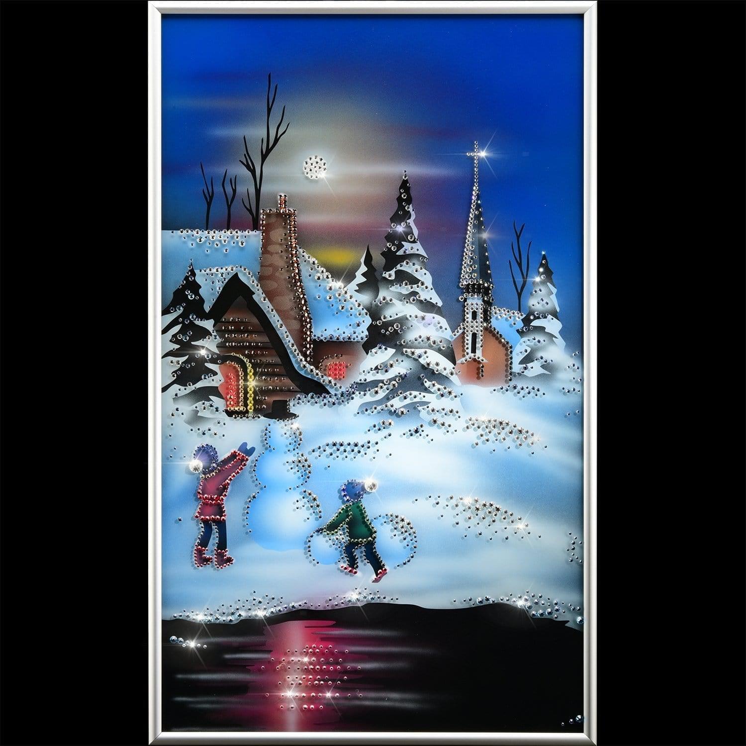 Картина "Лепит детвора снеговика". Сваровски Swarovski 30 х 50 см