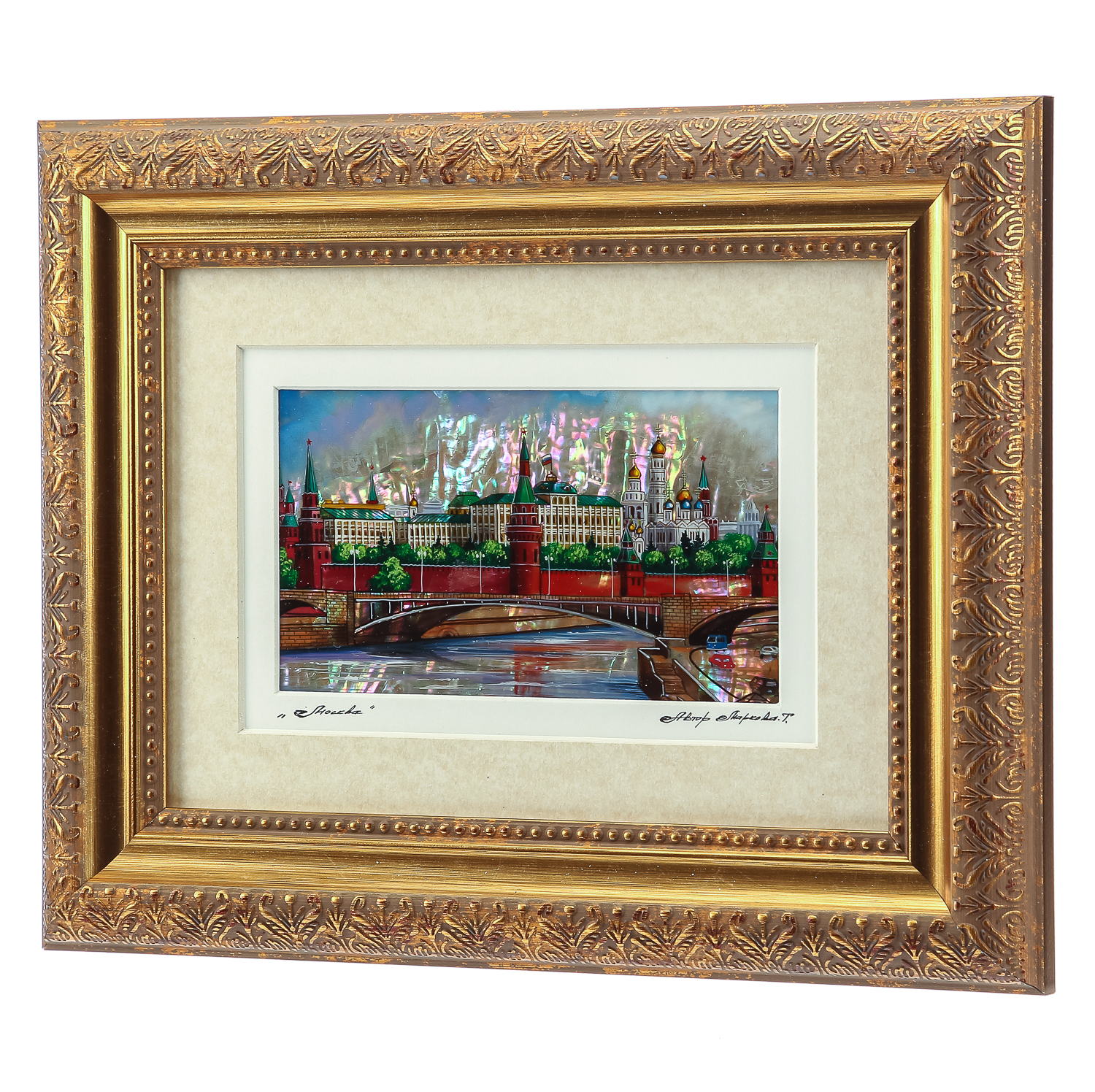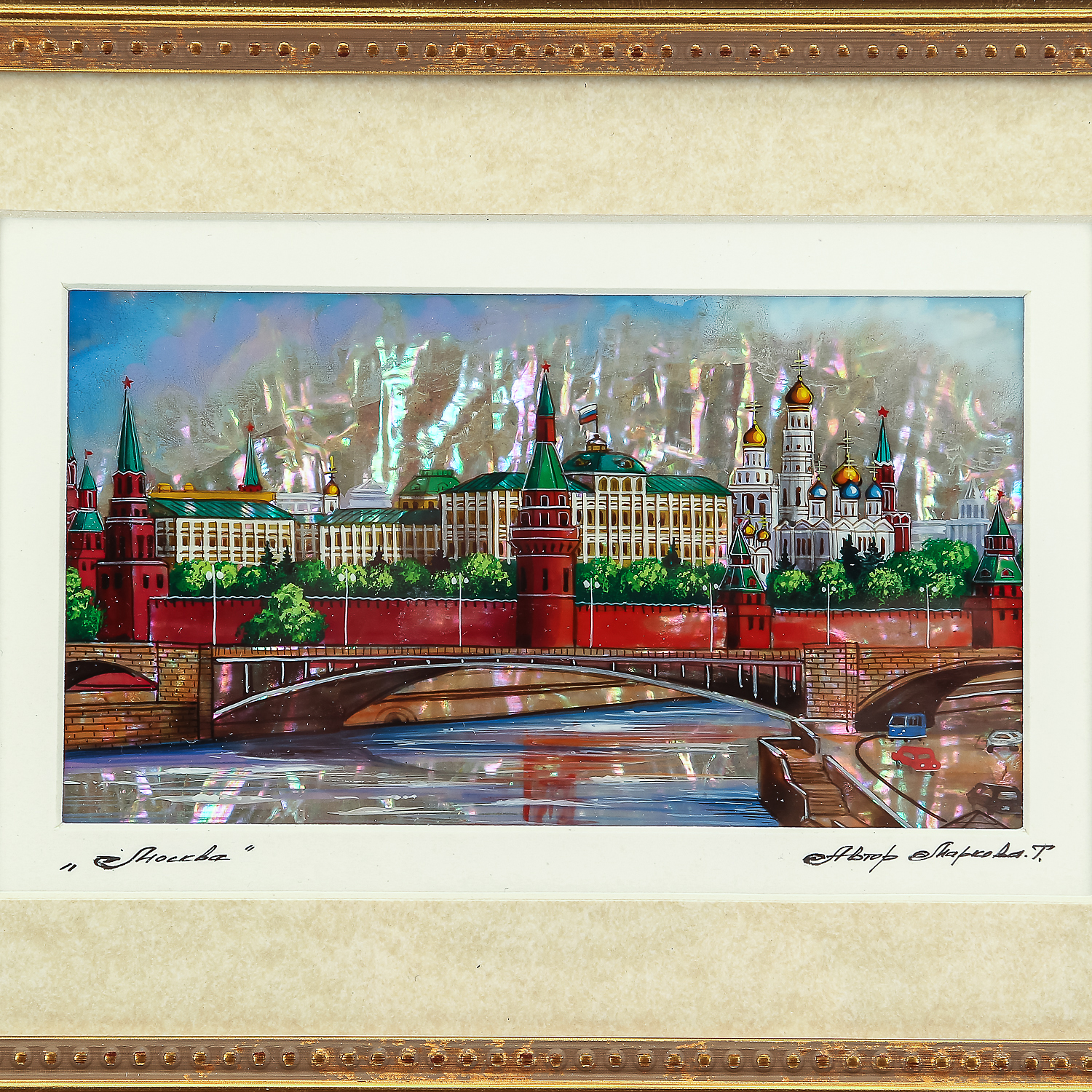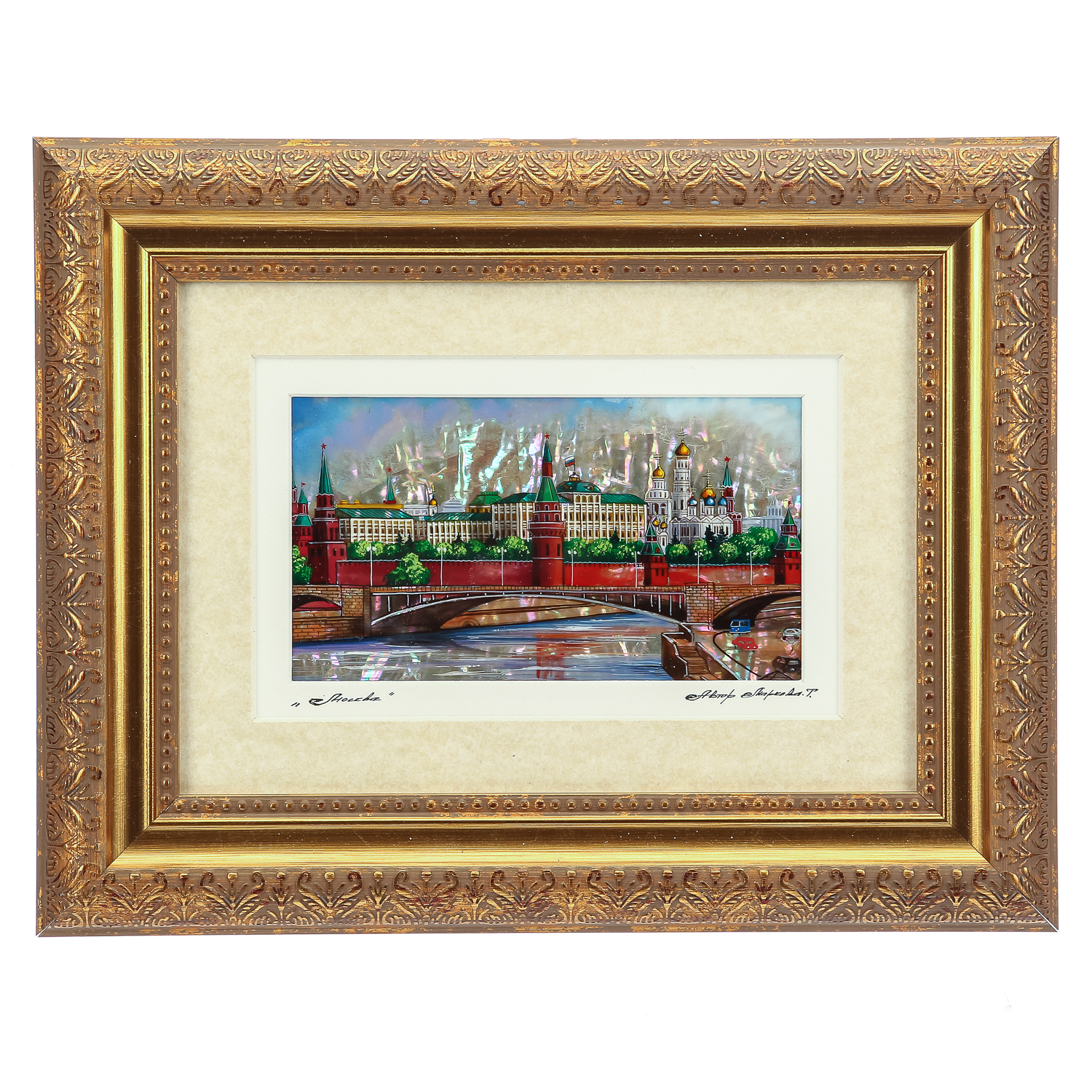 Картина перламутровая "Москва. Вид на Кремль".Материалы: перламутр, краски, паспарту, стекло, деревянный багет.