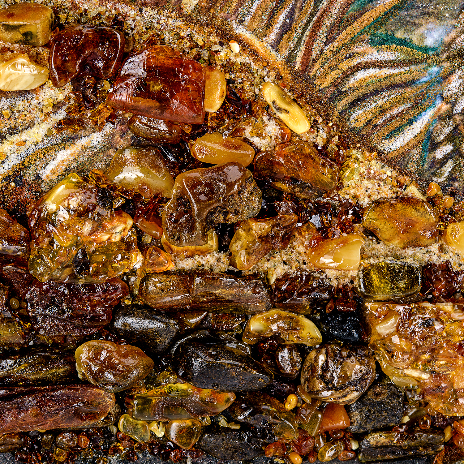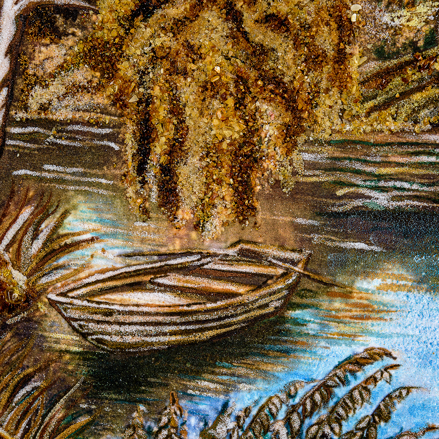 Картина янтарная "Лодка у берега".Материалы: холст, янтарь, кварцевый песок, каменная крошка, деревянный багет.