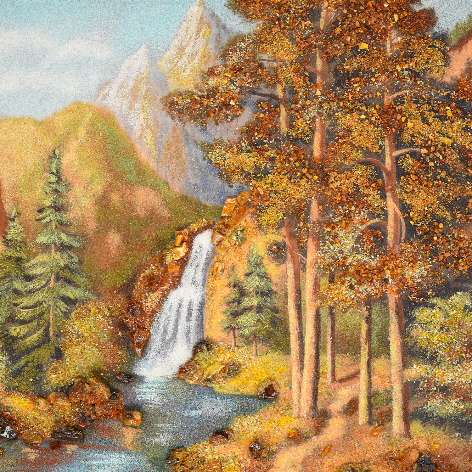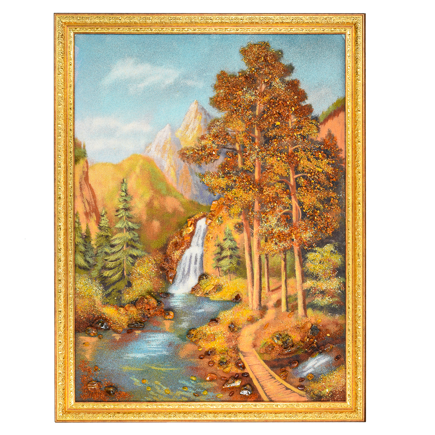Картина янтарная "У лесного водопада".Размер холста: 60х80 см