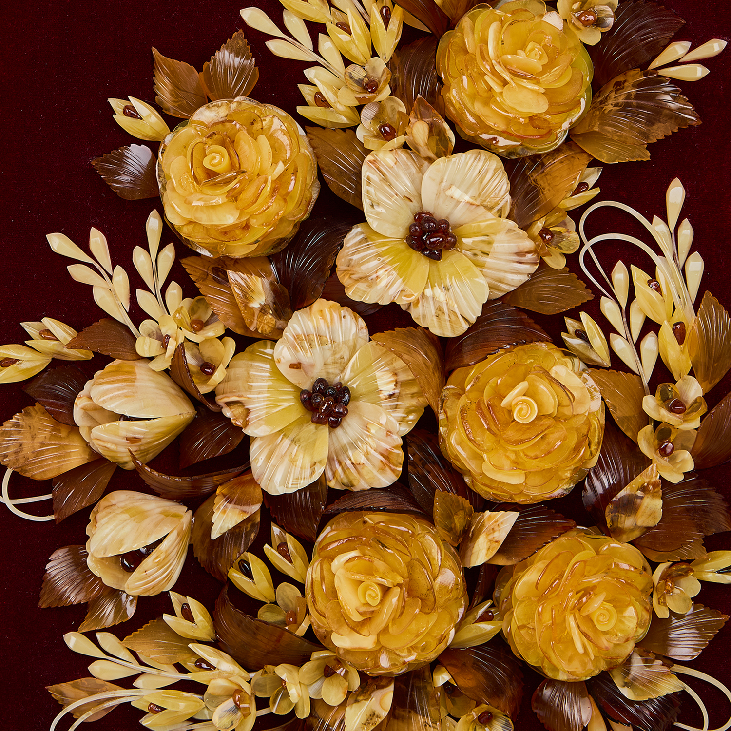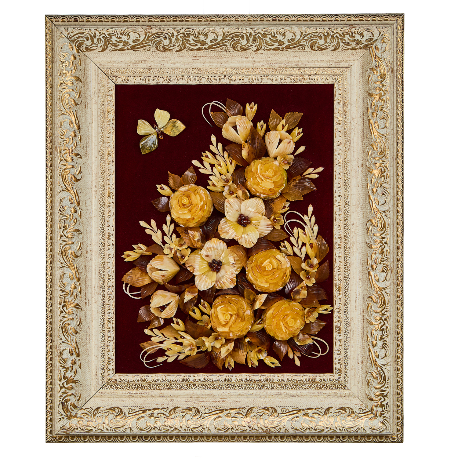 Картина янтарная "Цветы".Материалы: янтарь, барат, багетная рама.