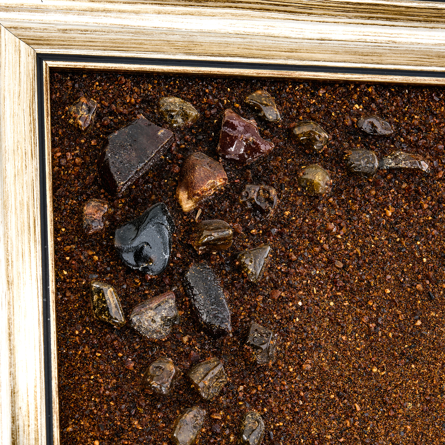 На холсте представлена художественная аппликация из камней и мелких частиц балтийского янтаря - чудодейственного натурального камня, называемого в народе "даром солнца". Природный минерал янтарь является отвердевший за десятки тысяч лет смолой хвойных деревьев. На формирование янтаря природа тратит более 40 тысячелетий. Энергия этого камня облагораживает интерьер.