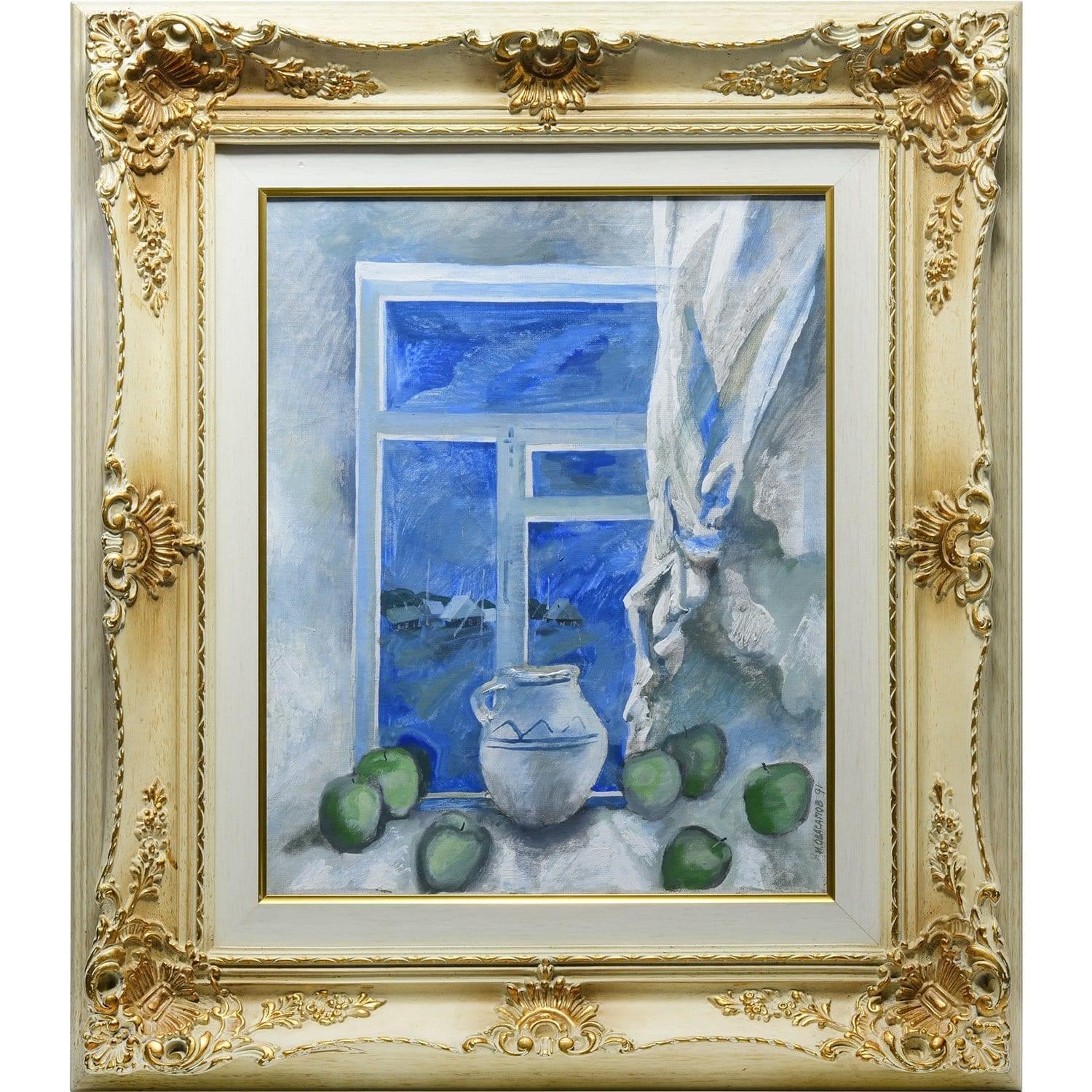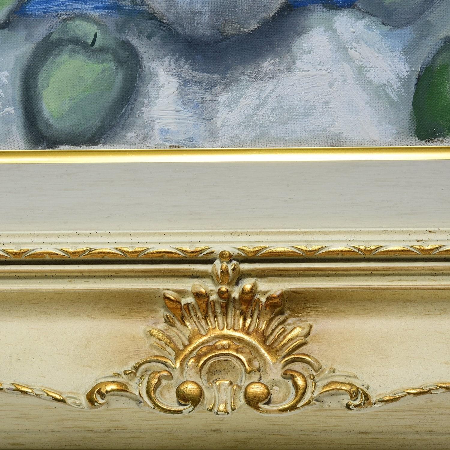 Картина обрамлена в широкую раму из классического багета с позолоченным рельефным орнаментом. Эксклюзивная авторская работа именитого российского художника, картина, написанная в конце 20 века, "Зеленые яблоки" - это вариант дорогого vip-подарка для собирателя образцов современного искусства на Свадьбу, Юбилей, Новый год, Новоселье, Новый год и Рождество, общий или личный праздник.