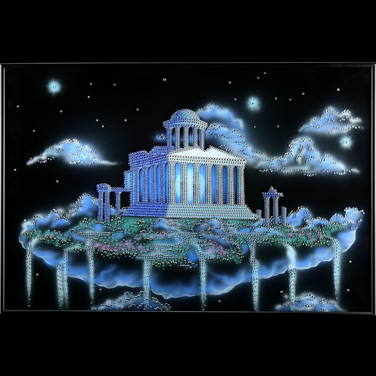 В уголке Вселенной есть уютная земля обетованная - затерянный в невесомости мир с большим домом, цитаделью. Ее верхушка утопает в веренице космических облаков, а фундамент зиждется на просторном облаке. Космический пейзаж с атмосферой вселенской идиллии воссоздан художником на иссиня-черном фоне этой более чем полуметровой картины, которая инкрустирована кристаллами Сваровски.В качестве декоративного материала для инкрустации художественного изображения с многочисленными элементами использовались легендарные сияющие стразы - кристаллы Swarovski. Они идеально подходят для отображения мистической атмосферы поднебесного царства, обособленного от планет и звезд Солнечной системы.