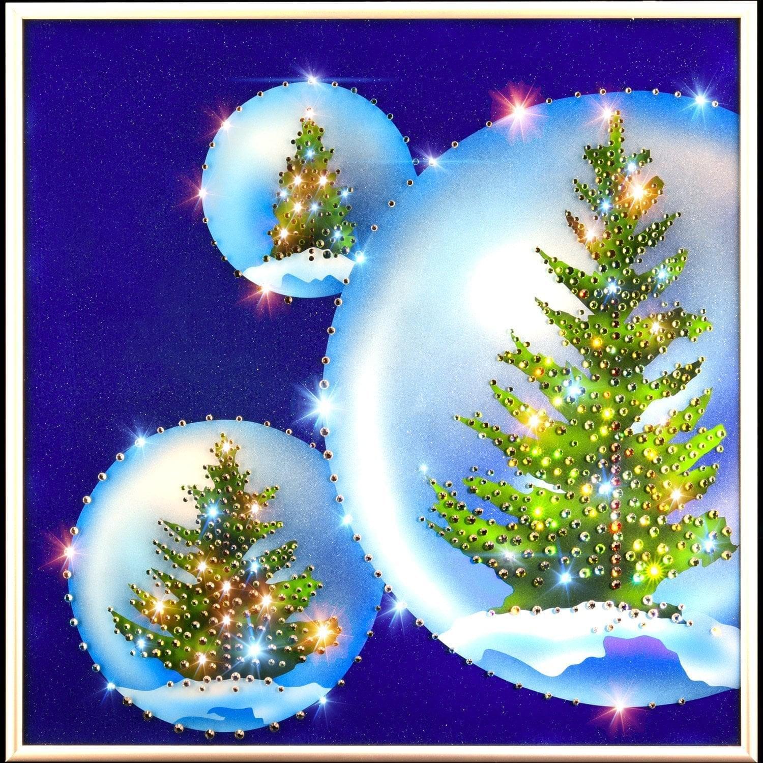 Зима - сезон мечтаний, новогодняя ночь - пора загадывания желания. Перед Вами - идеальный вариант подарка на Новый год для мечтателя и романтика. Согласно канонам цветотерапии, оттенки синего и индиго - высокоэнергетические оттенки, которые символизируют магию и мистицизм, пробуждают вдохновение и способствуют развитию творческого потенциала, а также привлечению в жизнь успеха.Оригинальная картина с изображением новогодних елок и шаров инкрустирована стразами Сваровски. В интерьере гостиной и детской комнаты она создает атмосферу волшебства и праздника.