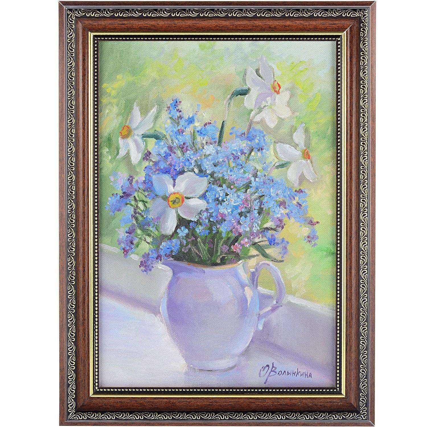 Нарциссы - символы победы и плодородия. А прелестные незабудки - символы постоянства и верности. Картина с цветочным букетом, обрамленная в изящную раму из классического багета, - это вечная классика женского подарка, а также подарка на Свадьбу и Рождение. Предлагаемый интерьерный аксессуар станет приятным украшением любого интерьера, добавит цветовой акцент и привлекательности антуражу.Картина отличается насыщенной цветовой палитрой с нежными зефирными оттенками, которые подходит для декора интерьеров гостиной, спальни и создания красивого цветового акцента. Отметим, что живописцу, мастерски владеющему нюансами письма масляными красками, удалось добиться выразительности и особой "свежести", которую редко можно уловить на картине.