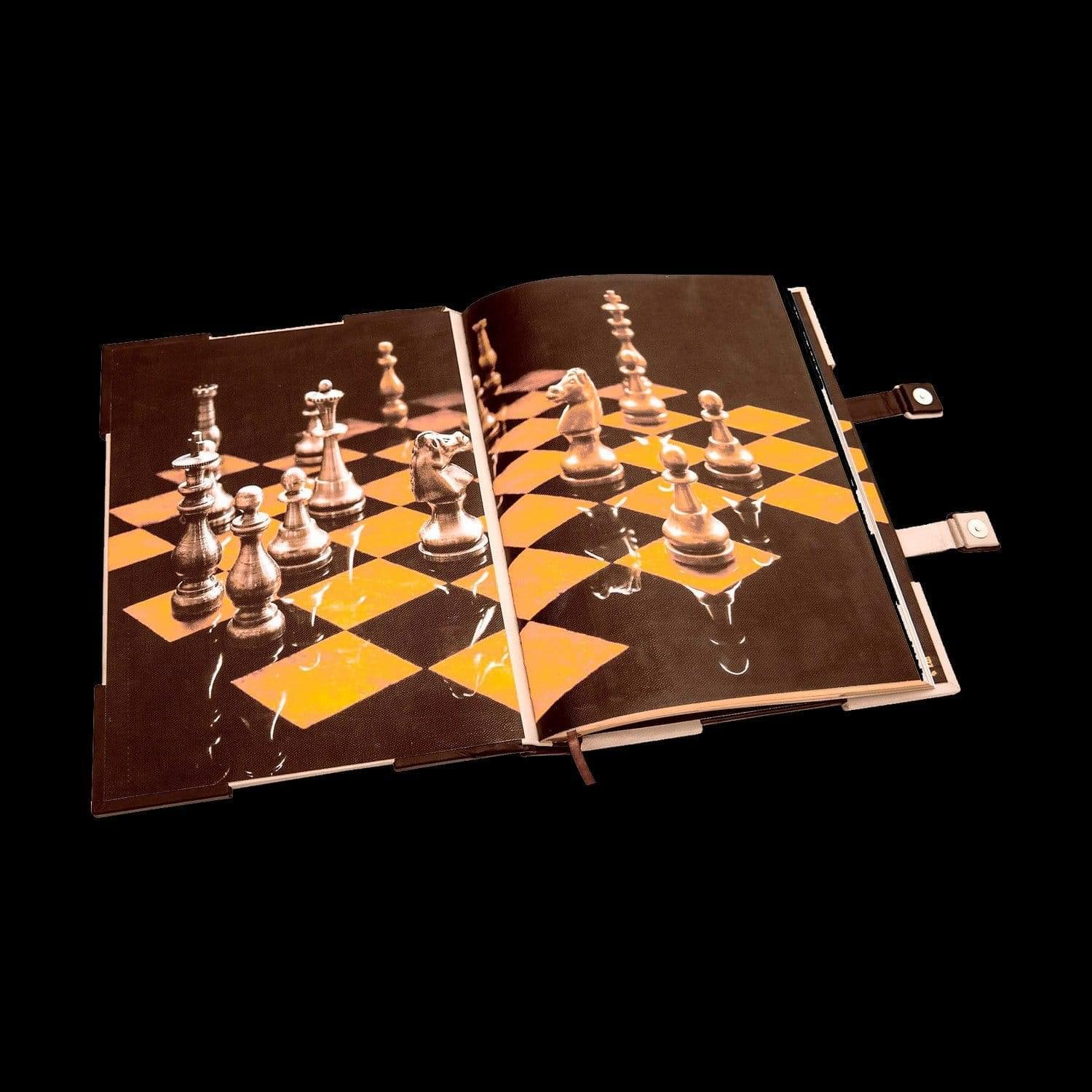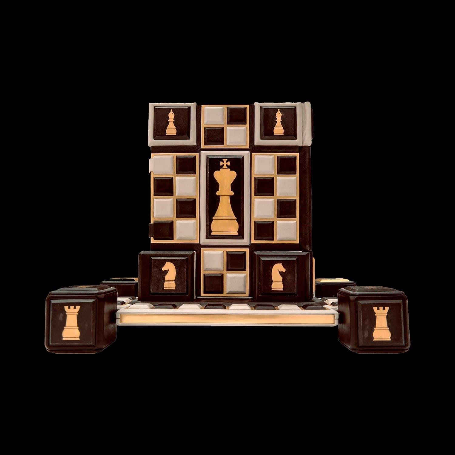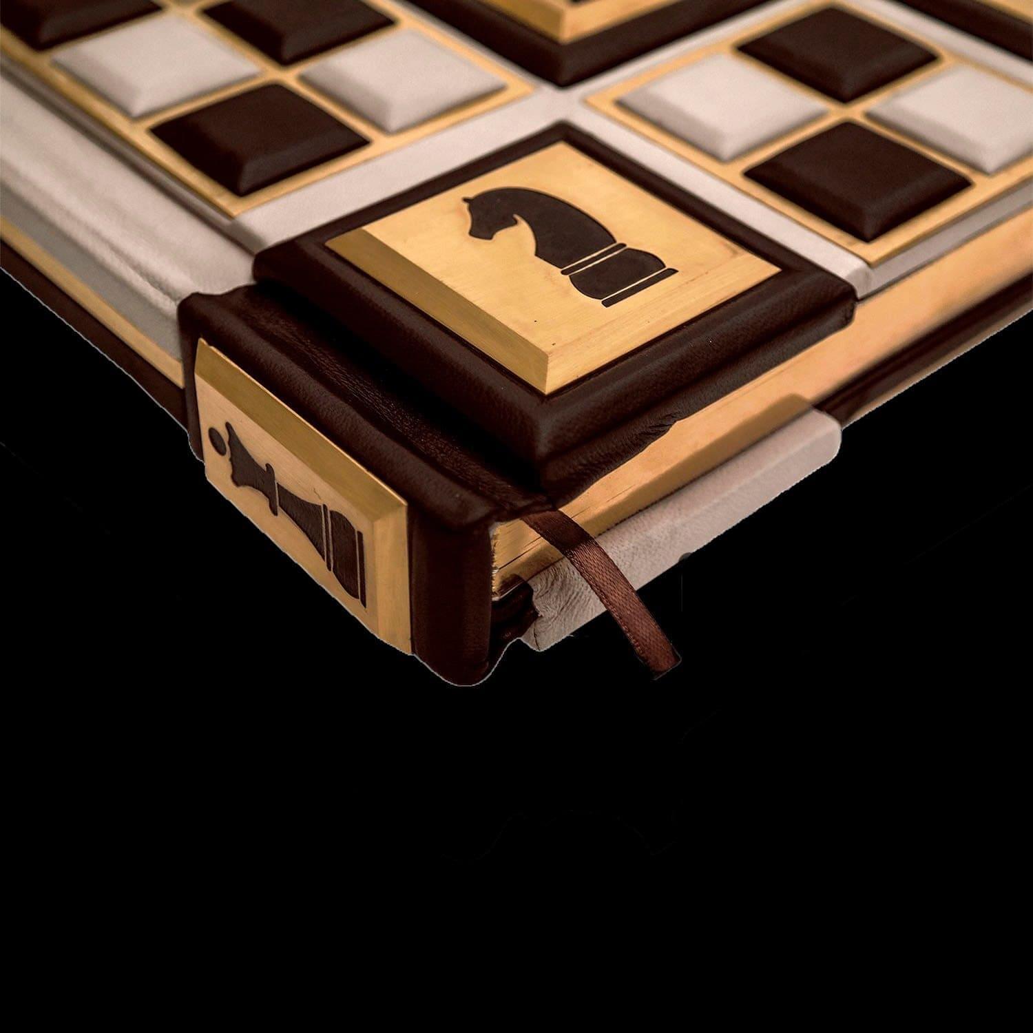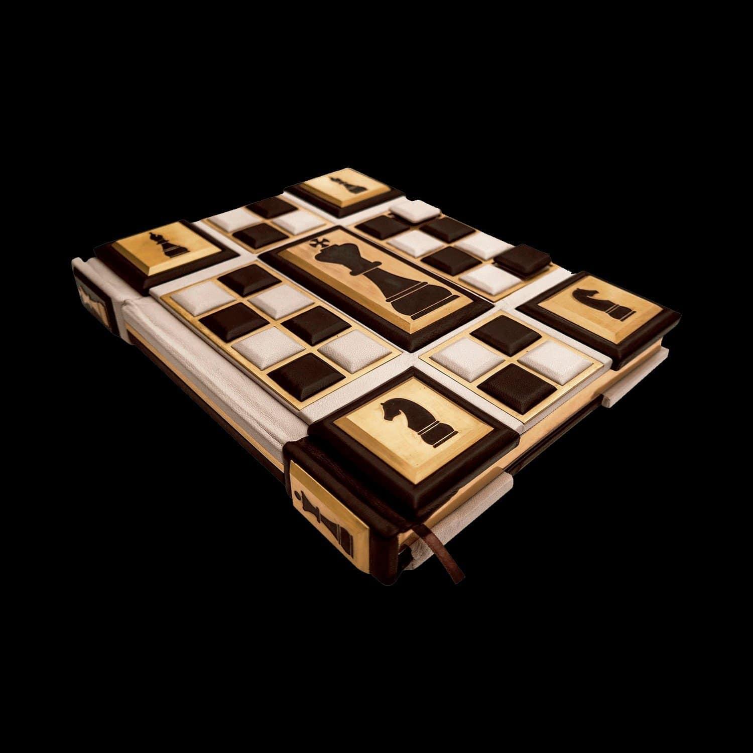 Книга предлагает обобщение современных исследований происхождения и распространения королевской игры, представляет основные вехи ее развития. В ней рассказано об индийской и арабской игре, о первых профессиональных шахматистах, о сути игры и роли каждой фигуры в ней, о национальных школах, о легендарных мастерах и их партиях. Оформление: Составной переплет «Брадель», ручной работы, выполнен из комбинации натуральных кож (кожа теленка «Robbat Parle», кожа «Marrone») производства итальянской кожевенной фабрики «Carisma». Двухуровневая обложка книги и подставка оформлена композицией художественного травления латуни. Составной форзац с фотопечатью, на кожаной слизуре. Кожаный каптал и шелковая лента-ляссе. Обрез книги вручную полирован и позолочен. Характеристики: Сертификат. Бархатный чехол. Количество страниц – 208 стр. (мелованная бумага, цветная печать, иллюстрации). Формат книги – 255х315х50 мм. Вес книги – 4,2 кг. Формат комплекта - 450х380х285 мм. Вес комплекта – 9,2 кг. .