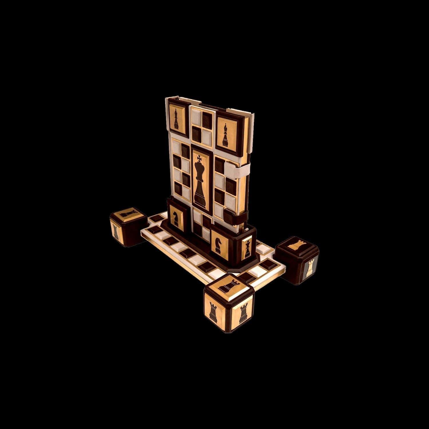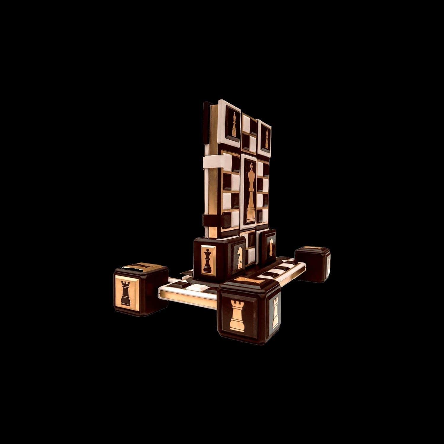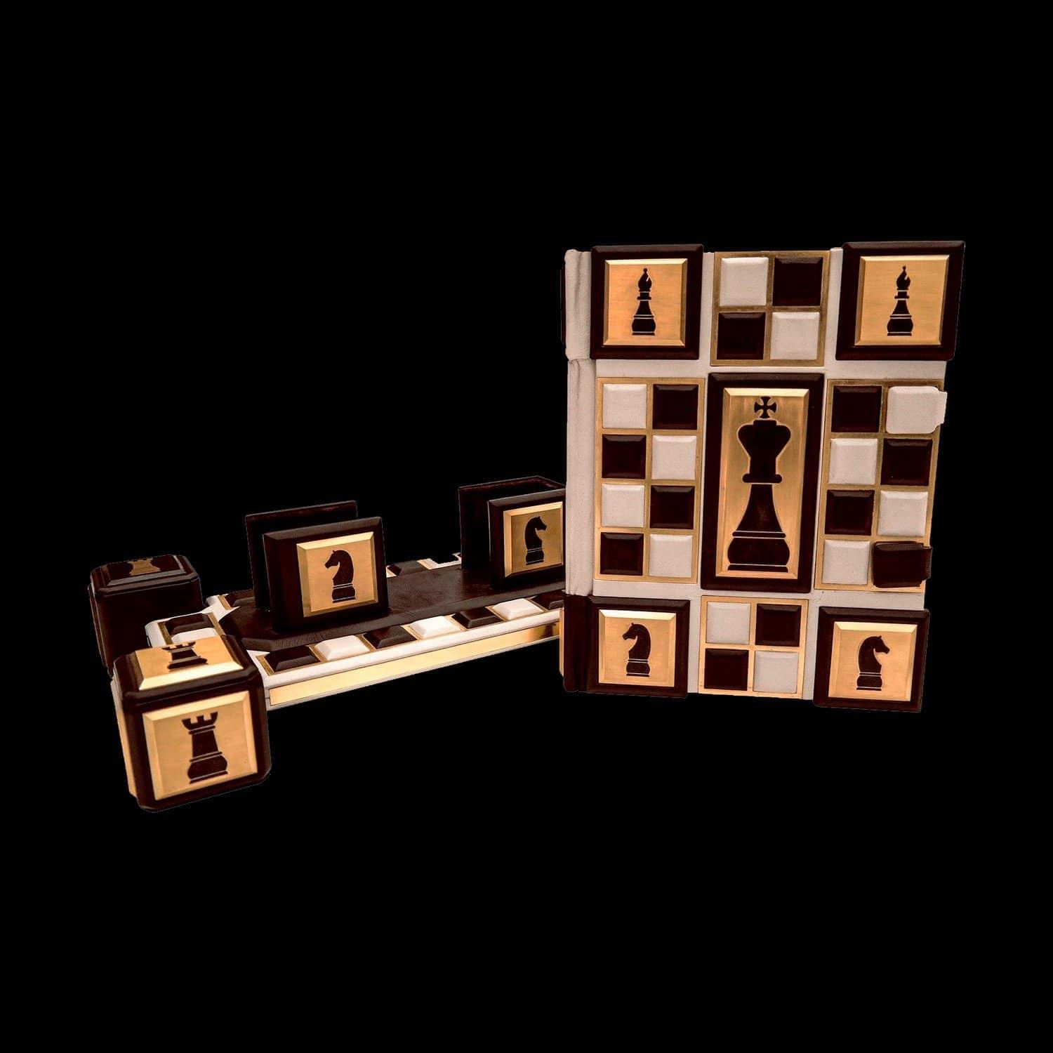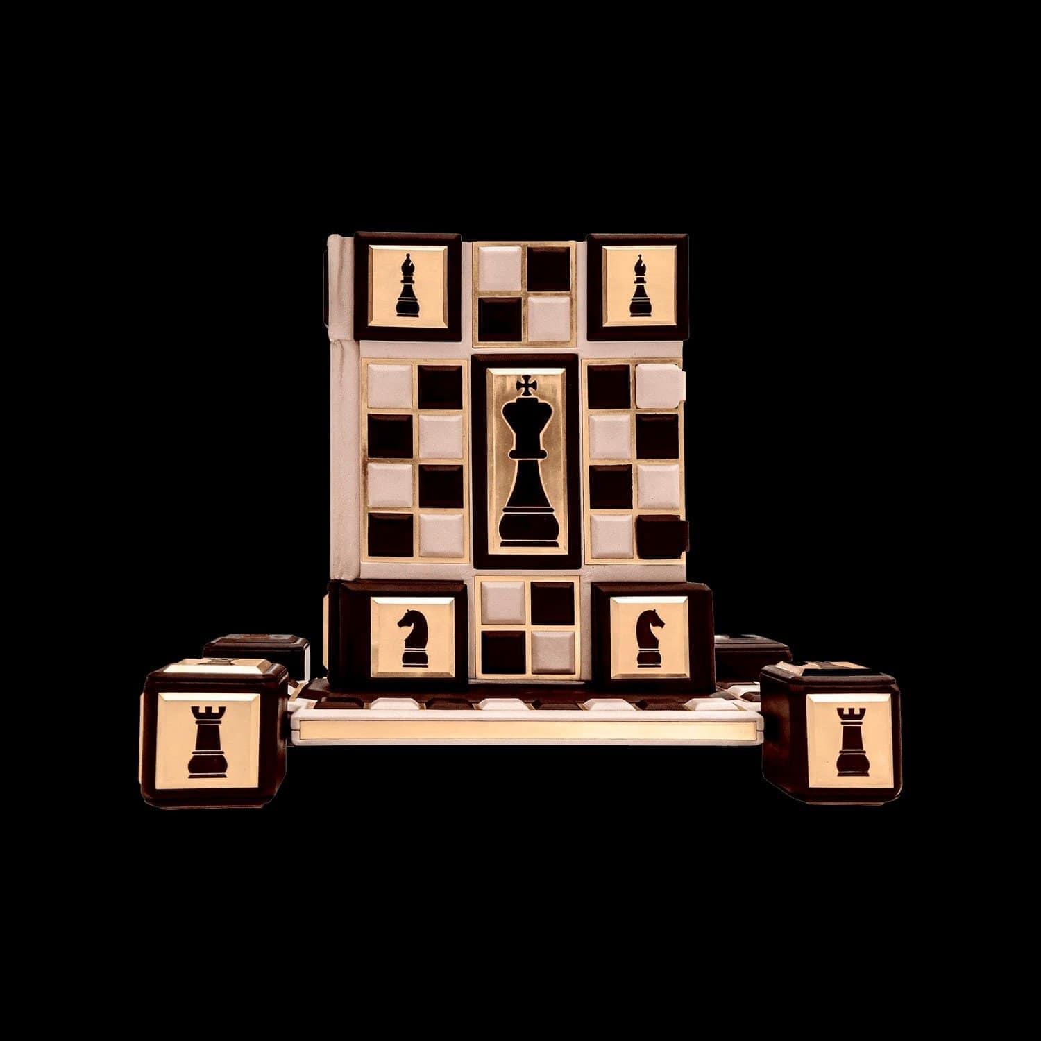 Книга предлагает обобщение современных исследований происхождения и распространения королевской игры, представляет основные вехи ее развития. В ней рассказано об индийской и арабской игре, о первых профессиональных шахматистах, о сути игры и роли каждой фигуры в ней, о национальных школах, о легендарных мастерах и их партиях. Оформление: Составной переплет «Брадель», ручной работы, выполнен из комбинации натуральных кож (кожа теленка «Robbat Parle», кожа «Marrone») производства итальянской кожевенной фабрики «Carisma». Двухуровневая обложка книги и подставка оформлена композицией художественного травления латуни. Составной форзац с фотопечатью, на кожаной слизуре. Кожаный каптал и шелковая лента-ляссе. Обрез книги вручную полирован и позолочен. Характеристики: Сертификат. Бархатный чехол. Количество страниц – 208 стр. (мелованная бумага, цветная печать, иллюстрации). Формат книги – 255х315х50 мм. Вес книги – 4,2 кг. Формат комплекта - 450х380х285 мм. Вес комплекта – 9,2 кг. .