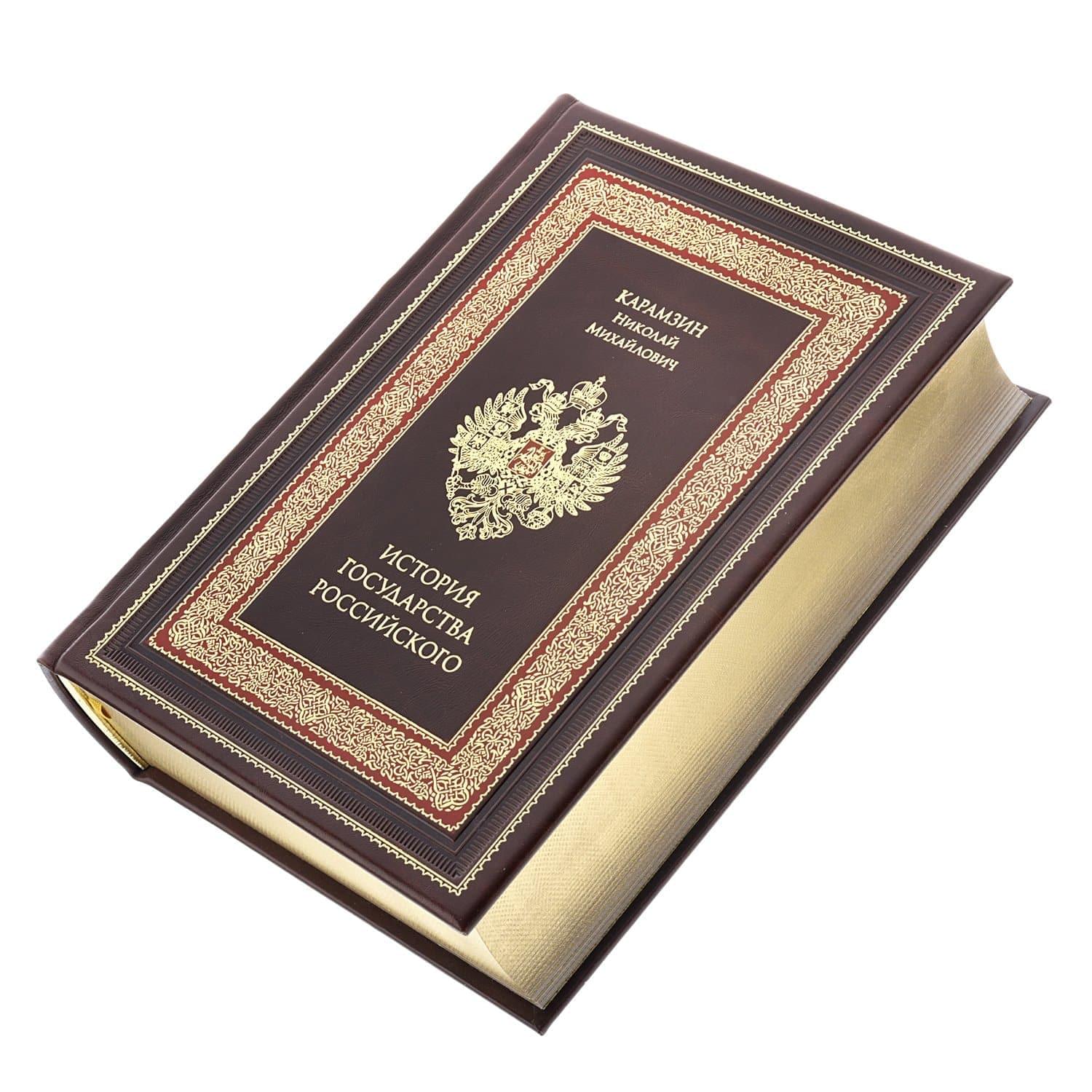 С гербом России на лицевой стороне кожаного переплета книга представляет собой высококлассный образец современной полиграфии. Выпущена ограниченным тиражом. Из книги русского писателя эпохи сентиментализма, историка Николая М. Карамзина Вы узнаете о развитии России с древнейших времен. Издание содержит различные сведения о народах России, а также информацию о конфликтах славян с варягами. Легендарный труд историка Карамзина напечатан на дорогостоящей мелованной бумаге и оформлен в красивый и износостойкий кожаный переплет, декорированный в традиционной технике тиснения по коже с использованием позолоты. Корешок имеет декоративные элементы бинты. Торшированный обрез защищает страницы от повреждений и пыли. .