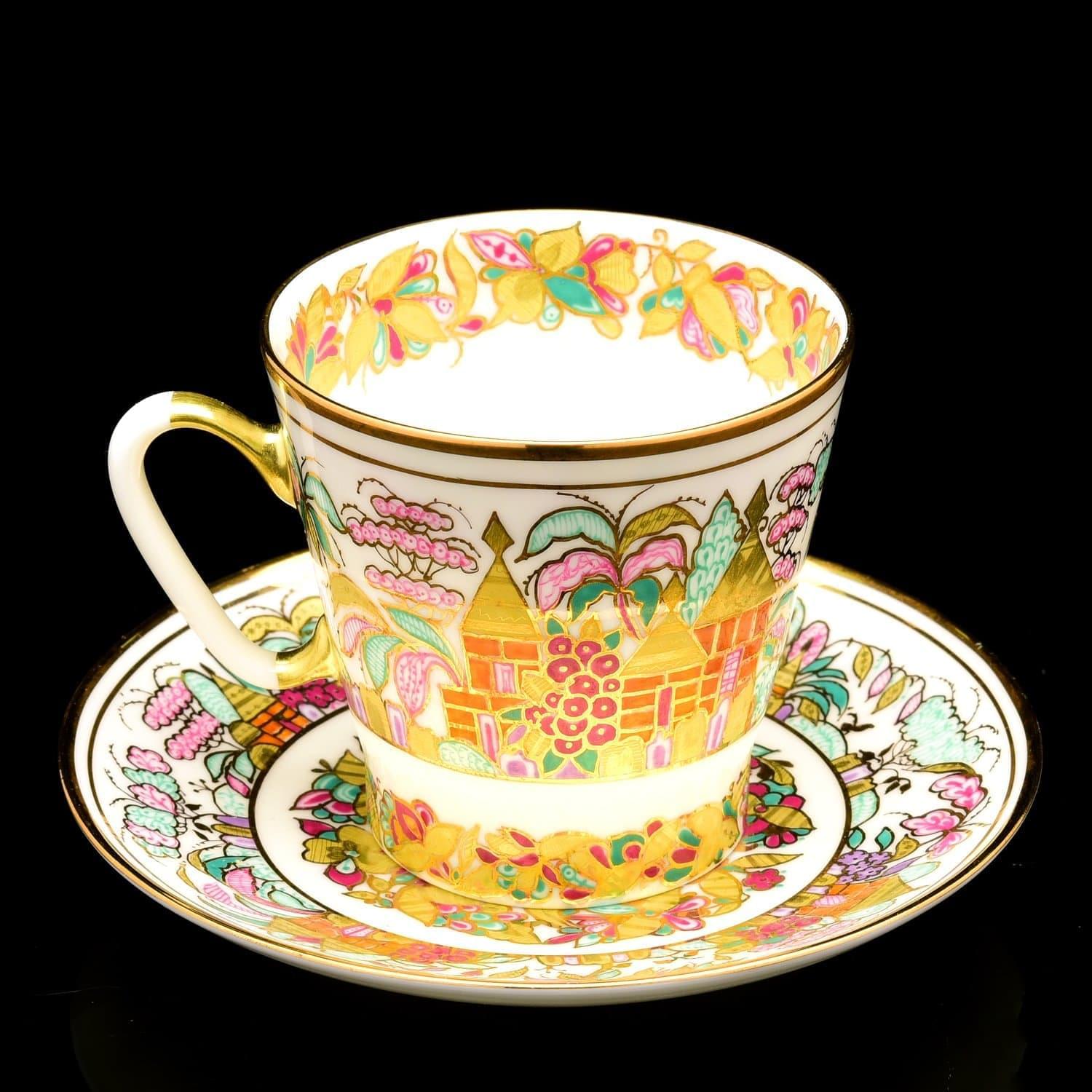 В комплекте представлена чашка и  блюдце. Их корпуса  оформлены  из "русского белого золота" - тонкостенного костяного фарфора - в соответствии с формой "Яблочко".  Композиция  отличается множеством деталей. Она воссоздана на поверхностях на чашке и блюдце в технике надглазурной росписи. Для декора посуды использована супер-краска, которая готовится на основе  золота.