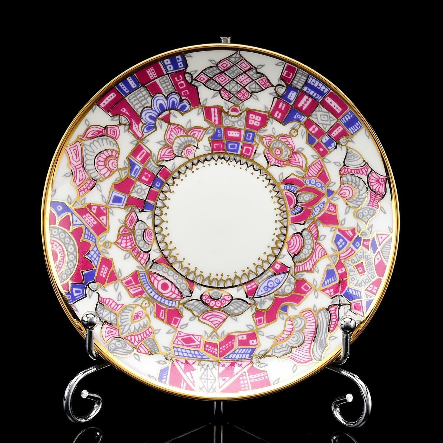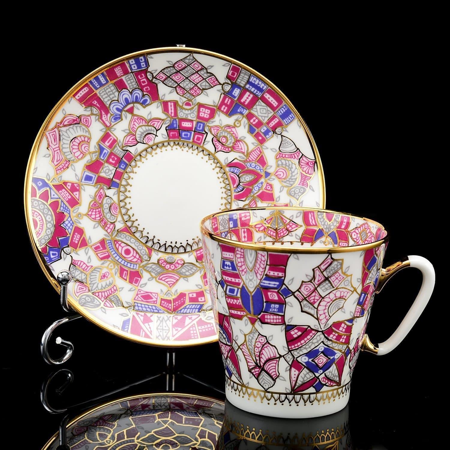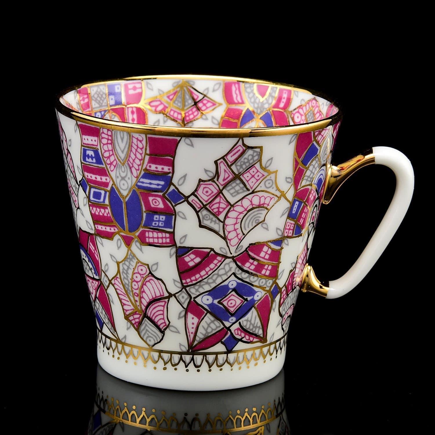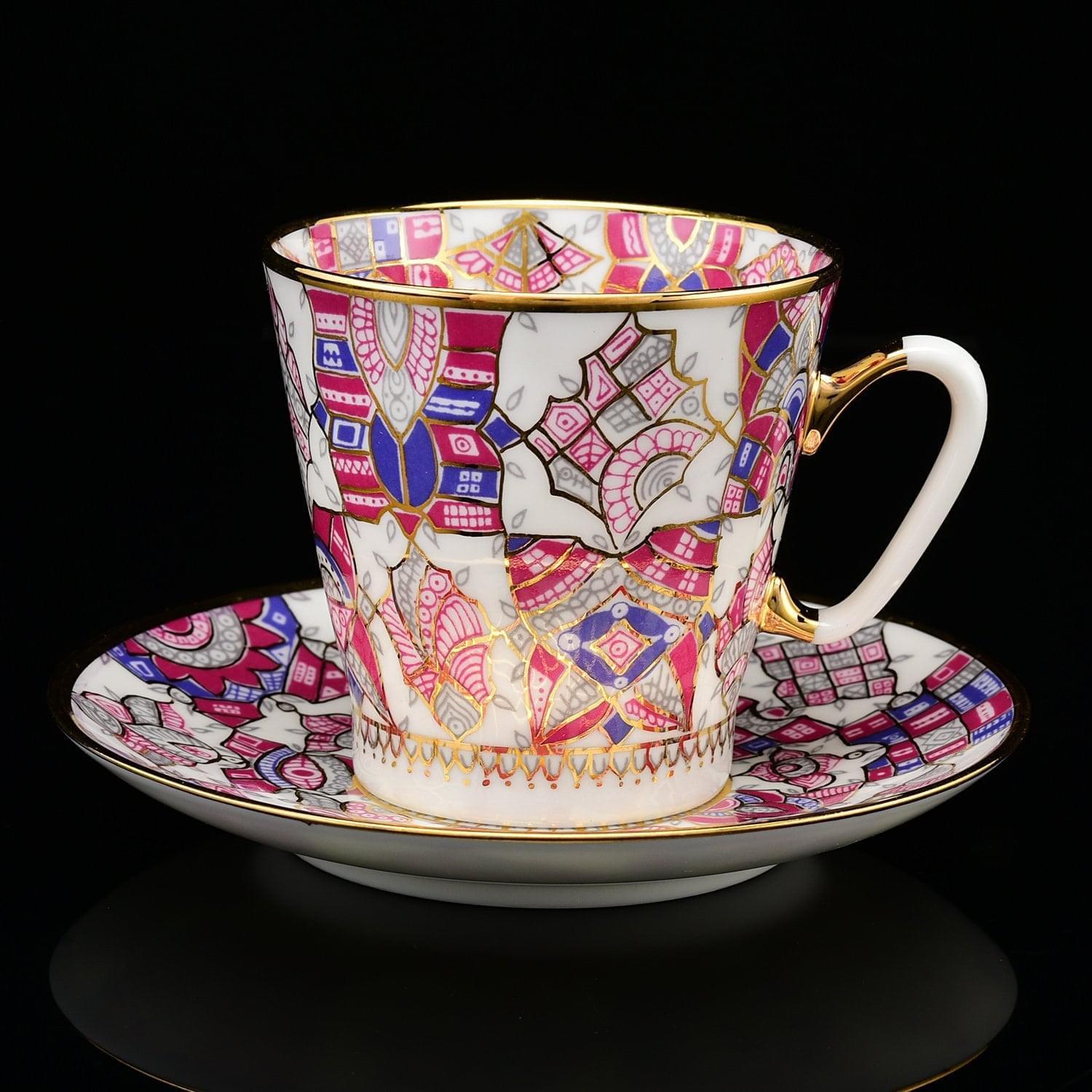 Роспись выполнена в подглазурной технике и покрыта защитными слоями прозрачной стеклянной глазури. Позолота нанесена в технике надглазурной росписи. Золото нанесено тонкой кистью в технике надглазурной росписи. Авторская работа, кофейная пара "Розовые узоры" ИФЗ - это вариант яркого, стильного и практичного подарок для женщины на День рождения, именины, новоселье, общий или личный праздник.