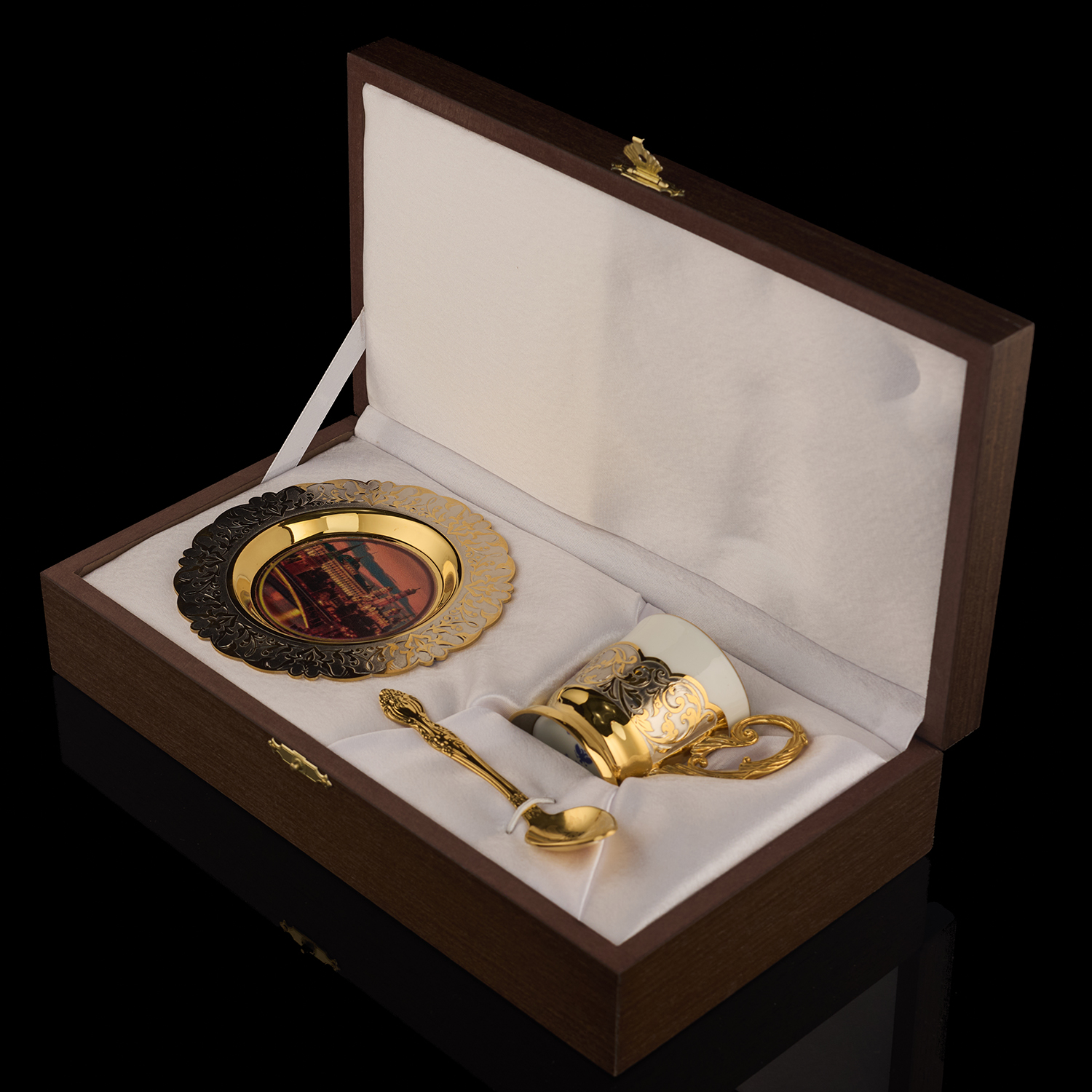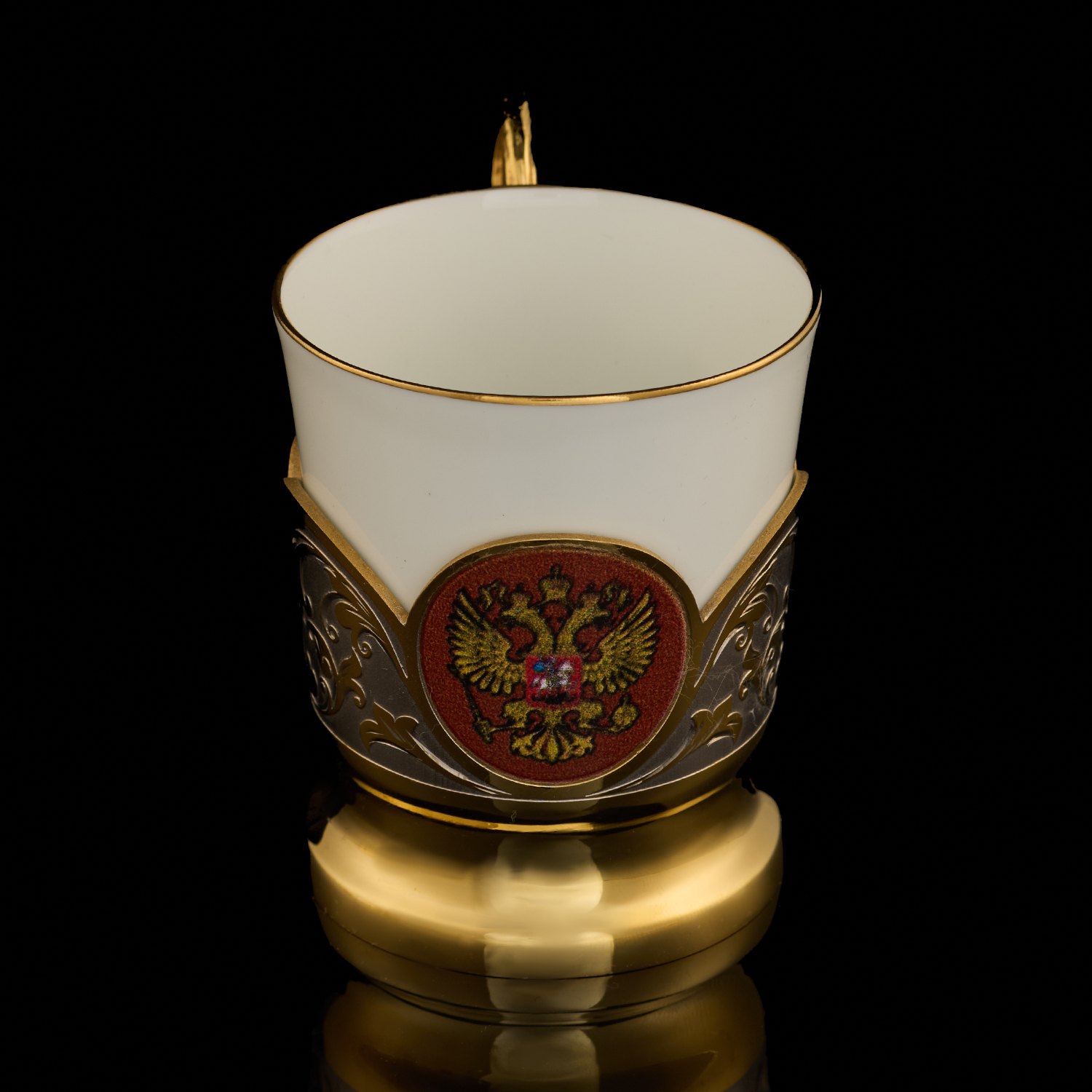 Кофейная пара "Москва". Златоуст.Материалы: латунь, никель, золото 999,9*, эмаль, костяной фарфор.