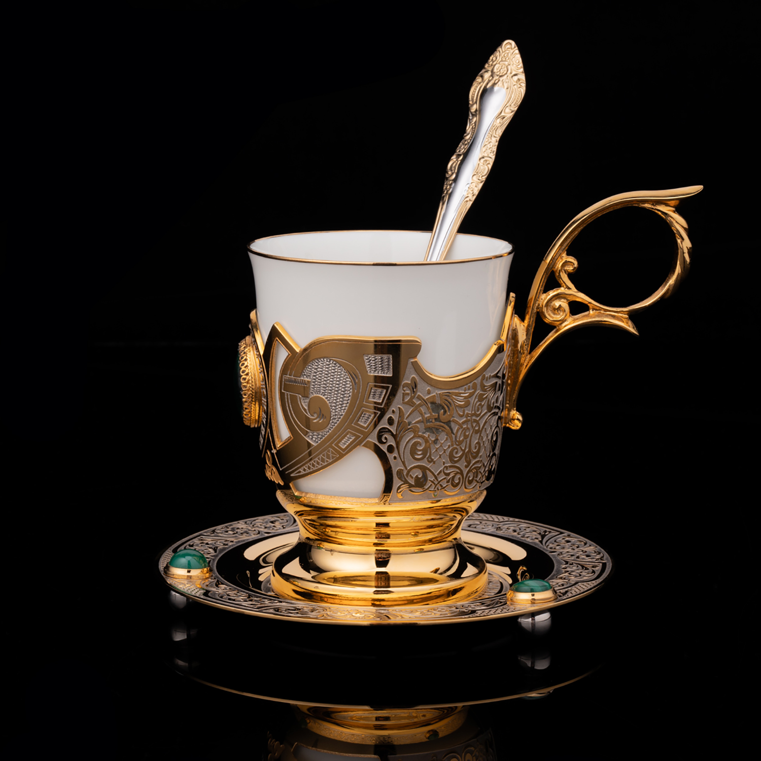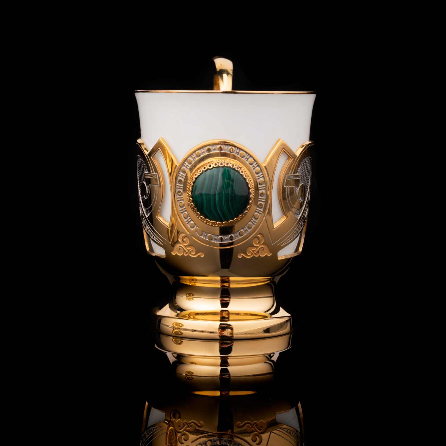 Русские подарки и сувениры → Посуда → Кофейные пары → Кофейная пара с позолотой и малахитом. Златоуст