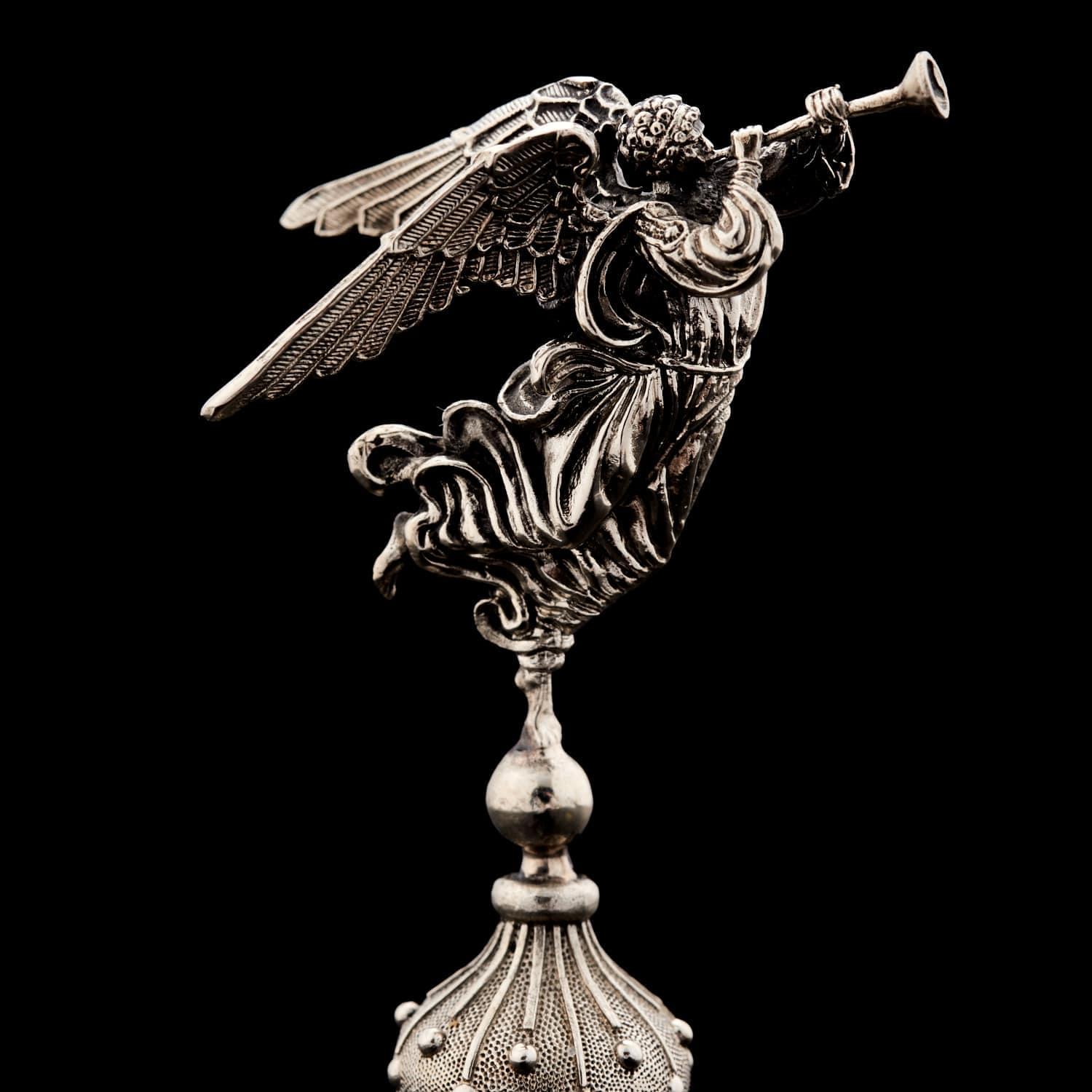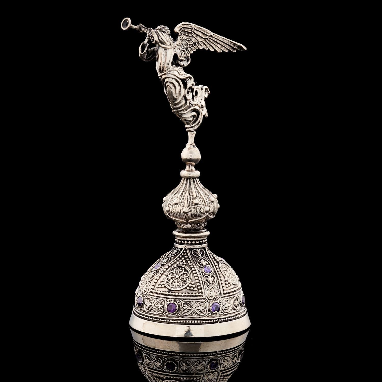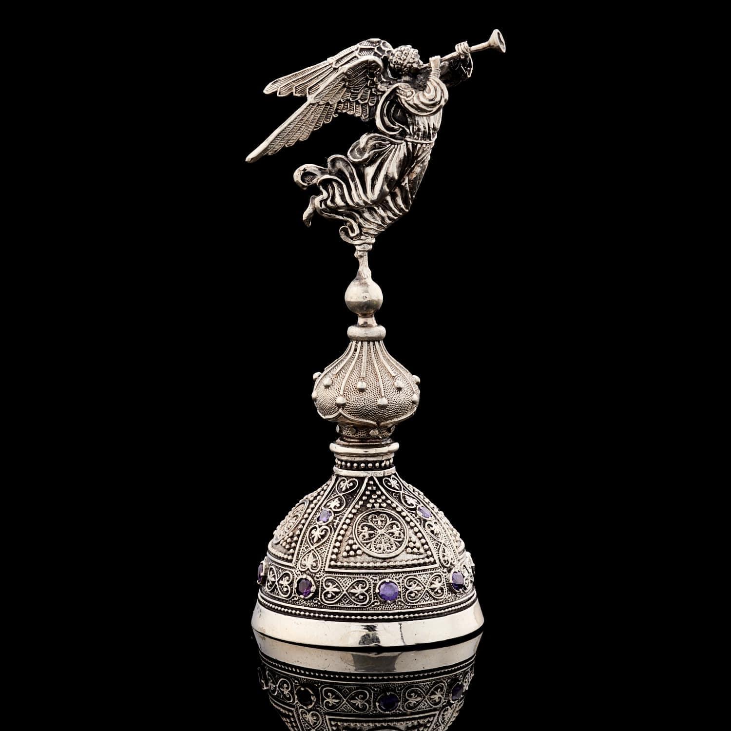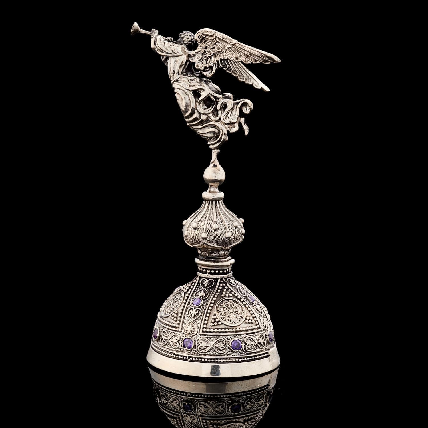 Вашему вниманию - дизайнерский элемент декора и образец ювелирного промысла, авторский колокольчик с "туловом" в форме купола и ручкой, которая представлена в виде скульптуры Ангела. Сделан вручную в техниках металлического литья, резьбы, гравировки из драгоценного металла-самородка, серебра. Изделие отличается коллекционной и художественной ценностью.Издавна маленький колокол представлял собой чудодейственный оберег для дома. На Руси каждый человек носил при себе колокольчик ручной работы, уникальный звон которого отгонял злых духов, дурные мысли и помогал принять важные решения. Немудрено, что стараниями российских художников по металлу и мастеров металлического литья колокольчик стал ходовым сувениром, вариантом символичного подарка на счастье и удачу.