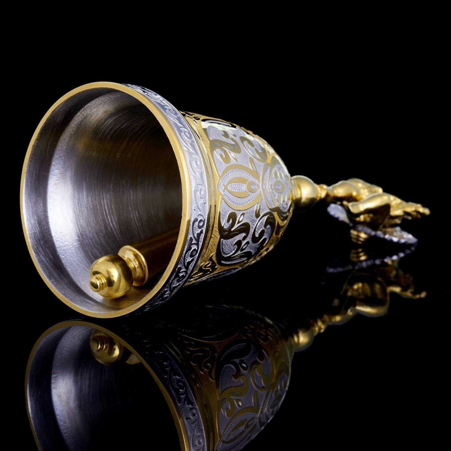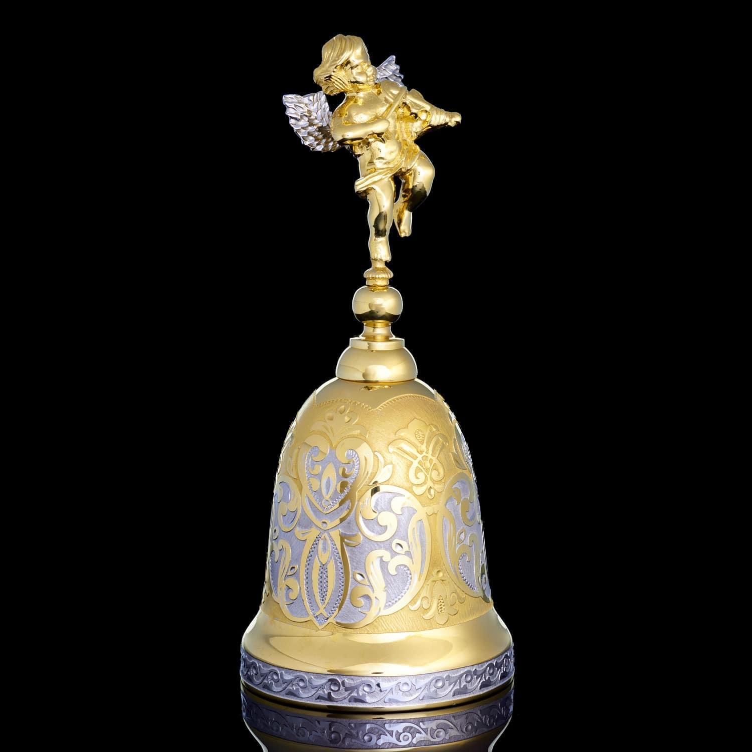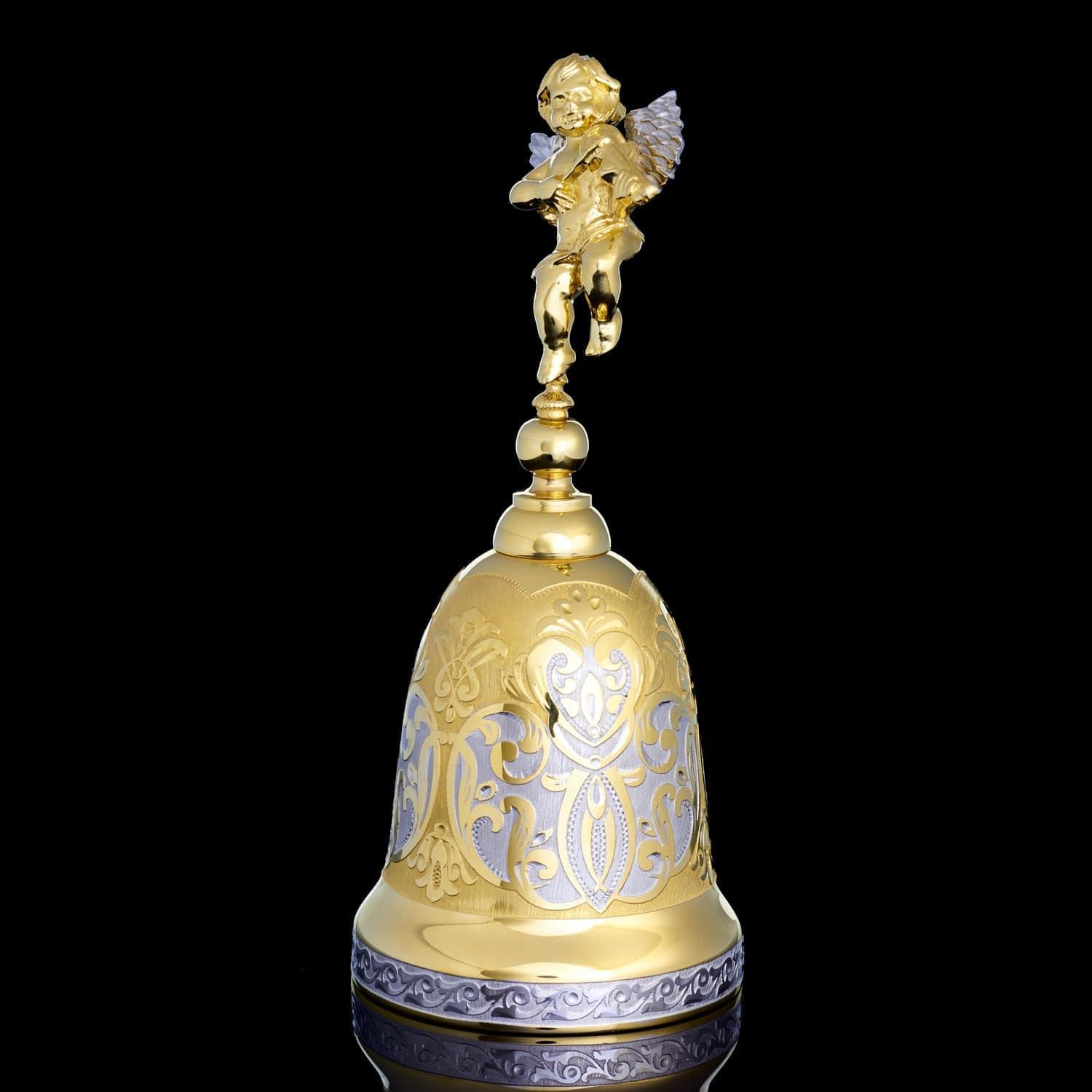 С давних времен колокольчик в подарок считался проявлением хорошего тона, символом удачи и везения. Наши предки верили, что колокольный звон отпугивает злых духов и приманивает счастье. Эксклюзивный колокольчик со Златоустовской гравюрой оформлен в строгом элегантном стиле. Юбка расписана орнаментальным рисунком и покрыта позолотой. Навершие выполнено в виде дивного золотого ангелочка с луком в руках. Ангел (с древнегреческого - «вестник, посланец»), в авраамических религиях считается духовным, бесплотным существом, сообщающим волю Бога и обладающим сверхъестественными возможностями. В христианстве ангелы - служебные духи, сотворенные Богом прежде создания материального мира, над которым они отчасти властвуют. Они восславляют Бога, воплощают славу Его, исполняют Его поручения, волю. Ангелы как и люди имеют ум, более совершенный, чем человеческий. Они вечны, и их больше, чем людей. .