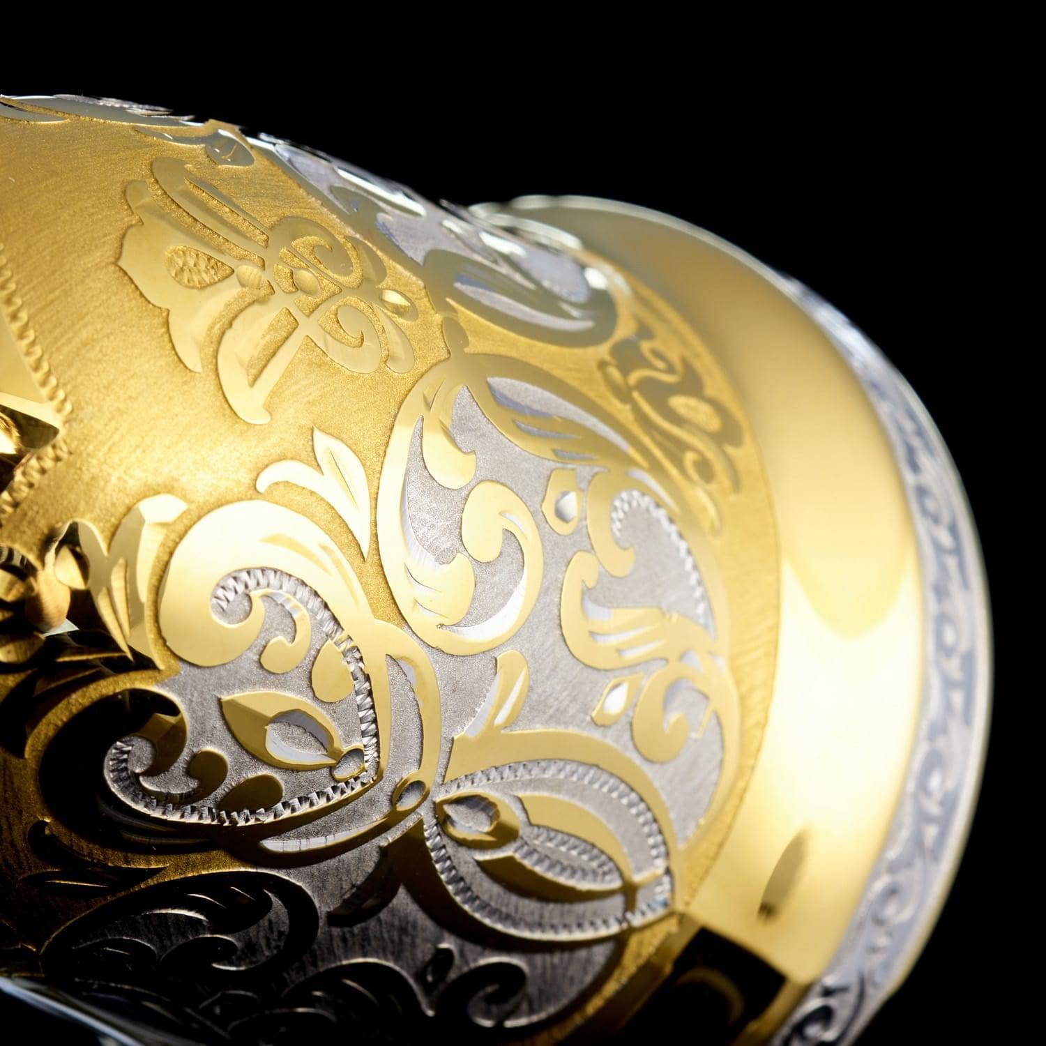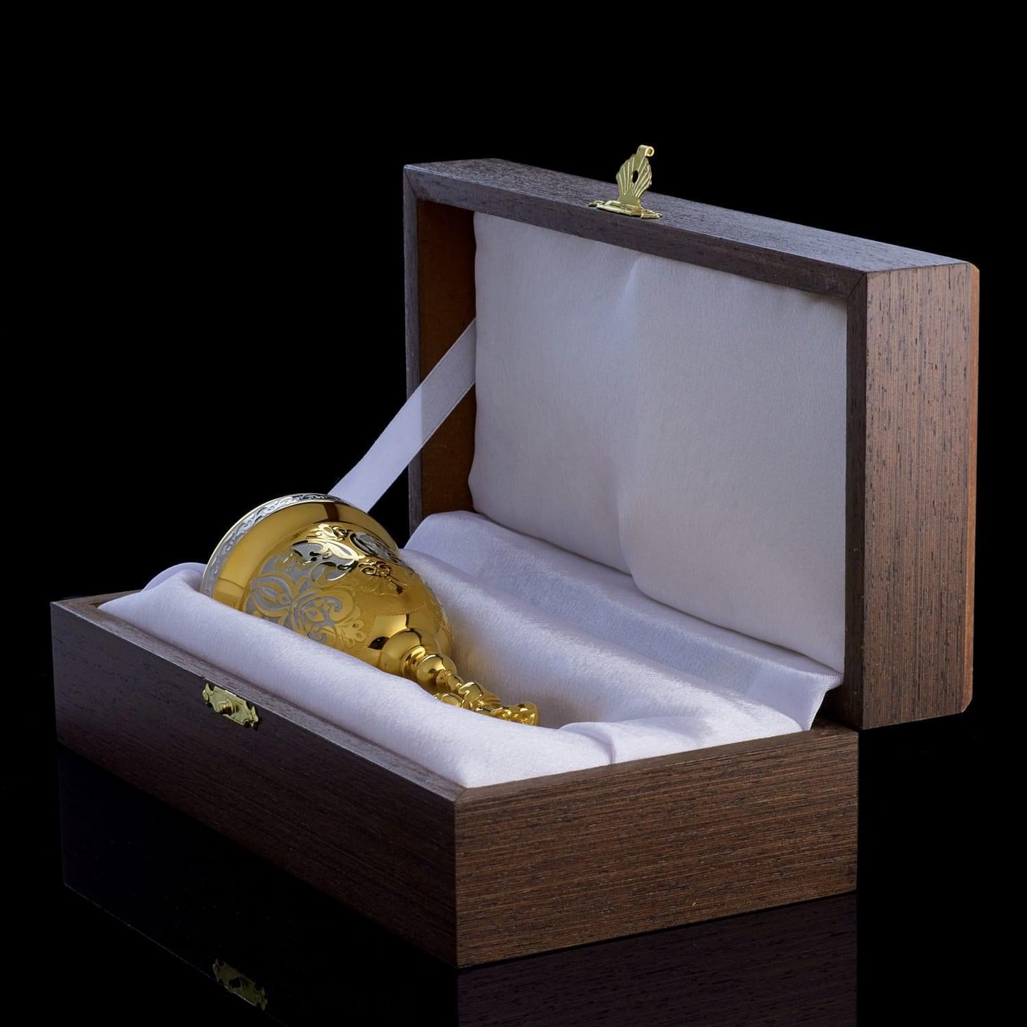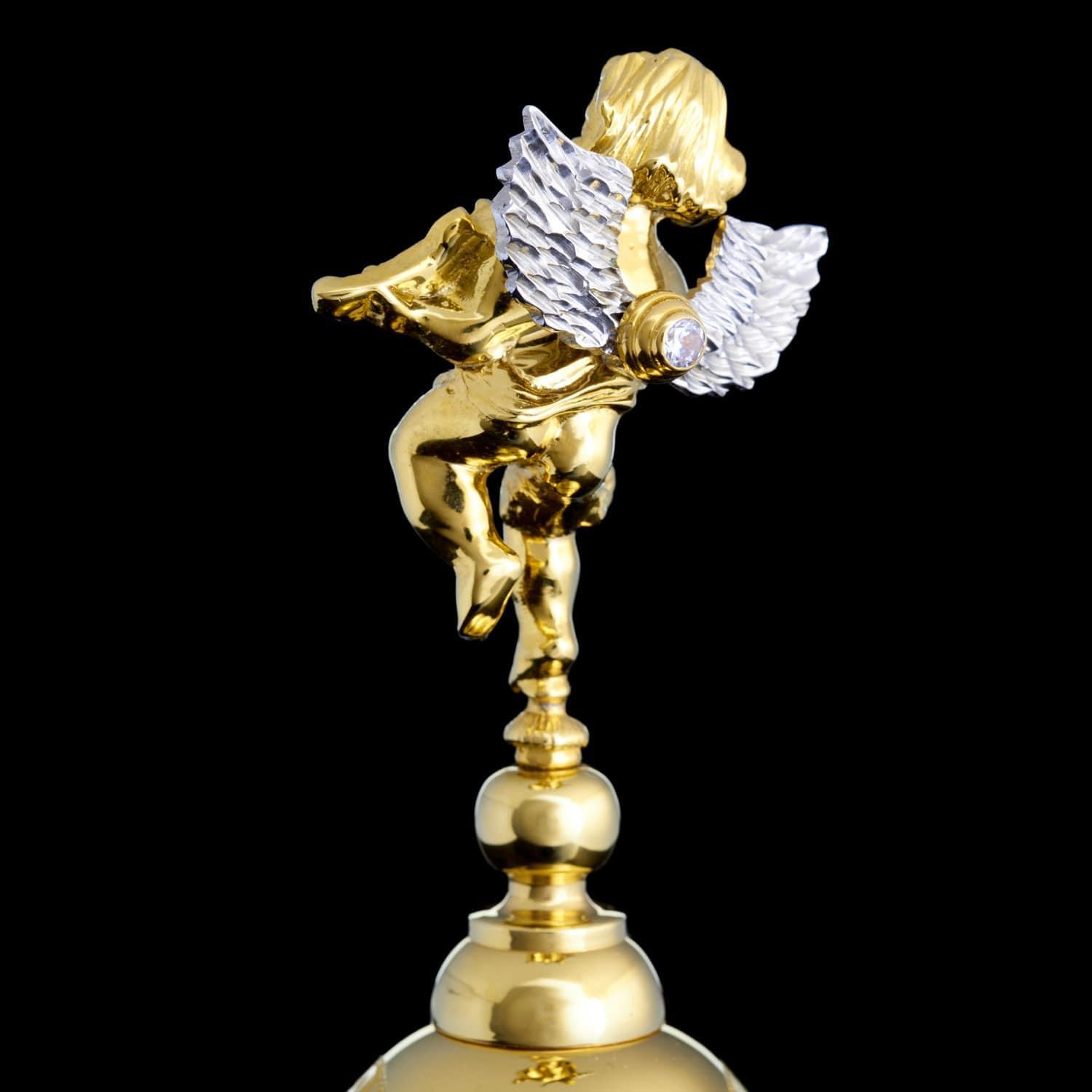 С давних времен колокольчик в подарок считался проявлением хорошего тона, символом удачи и везения. Наши предки верили, что колокольный звон отпугивает злых духов и приманивает счастье. Эксклюзивный колокольчик со Златоустовской гравюрой оформлен в строгом элегантном стиле. Юбка расписана орнаментальным рисунком и покрыта позолотой. Навершие выполнено в виде дивного золотого ангелочка с луком в руках. Ангел (с древнегреческого - «вестник, посланец»), в авраамических религиях считается духовным, бесплотным существом, сообщающим волю Бога и обладающим сверхъестественными возможностями. В христианстве ангелы - служебные духи, сотворенные Богом прежде создания материального мира, над которым они отчасти властвуют. Они восславляют Бога, воплощают славу Его, исполняют Его поручения, волю. Ангелы как и люди имеют ум, более совершенный, чем человеческий. Они вечны, и их больше, чем людей. .