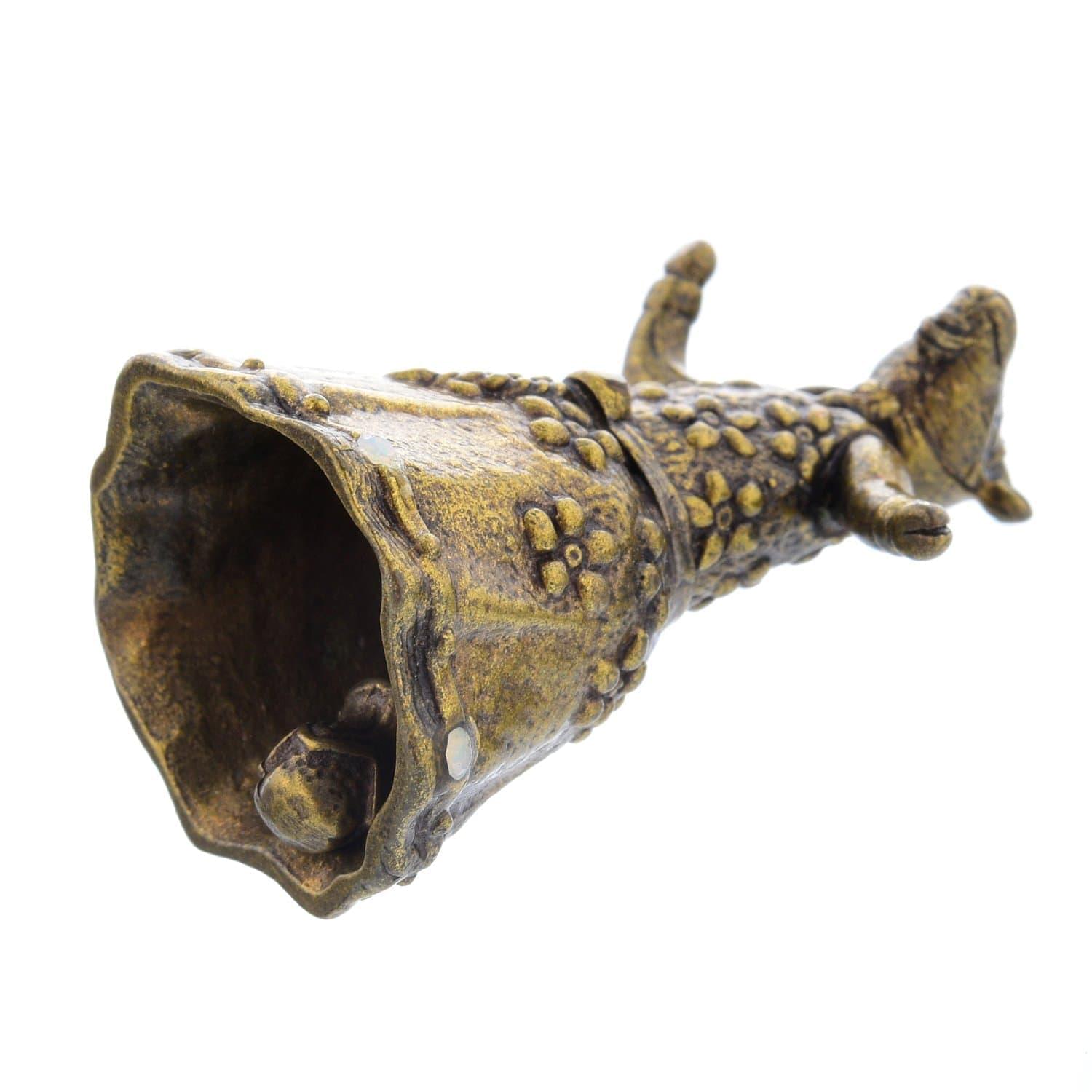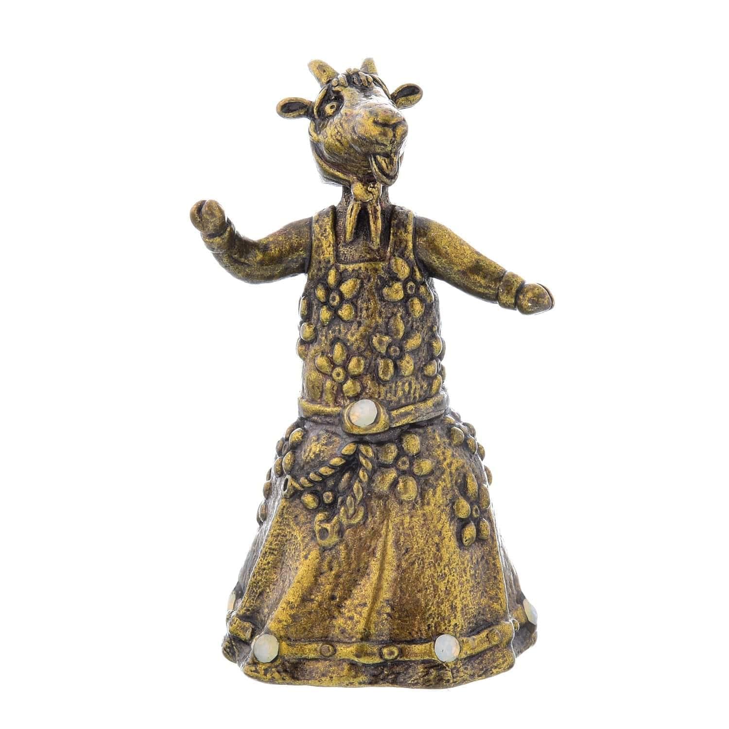 Колокольчик с корпусом в виде анималистической скульптуры. В ней воплощен образ русской козы в сарафане. Сувенир с голосом, колокольчик послужит подарком на счастье и удачу. Предмет силы для обладателя. Сделан из литейной латуни. Колокольчик объединяет народы и культуры всего мира. Он широко использовался в быту древних египтян, римлян, скифов, этрусков, греков, китайцев и славян. Самые древние колокольчики, которые найдены археологами, относятся к 23-11 векам до нашей эры. Вот почему колокольчик стал ходовым сувениром, подарком на счастье и удачу. Этот колокольчик приятно взять в руки. Он очищает пространство своим присутствием. Звоном колокольчиков на Руси излечивали головные боли и даже избавлялись от похмелья. Каждый русский человек носил при себе колокольчик, отпугивающий злых духов и нечисть. ...