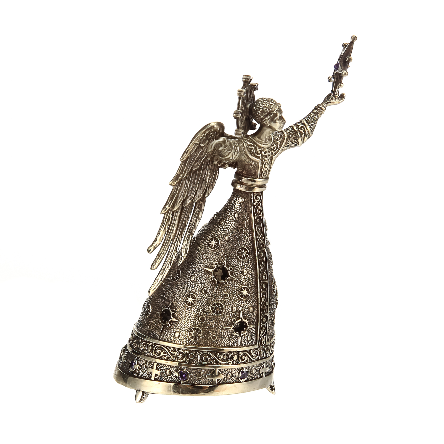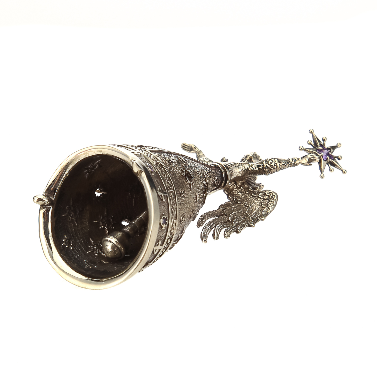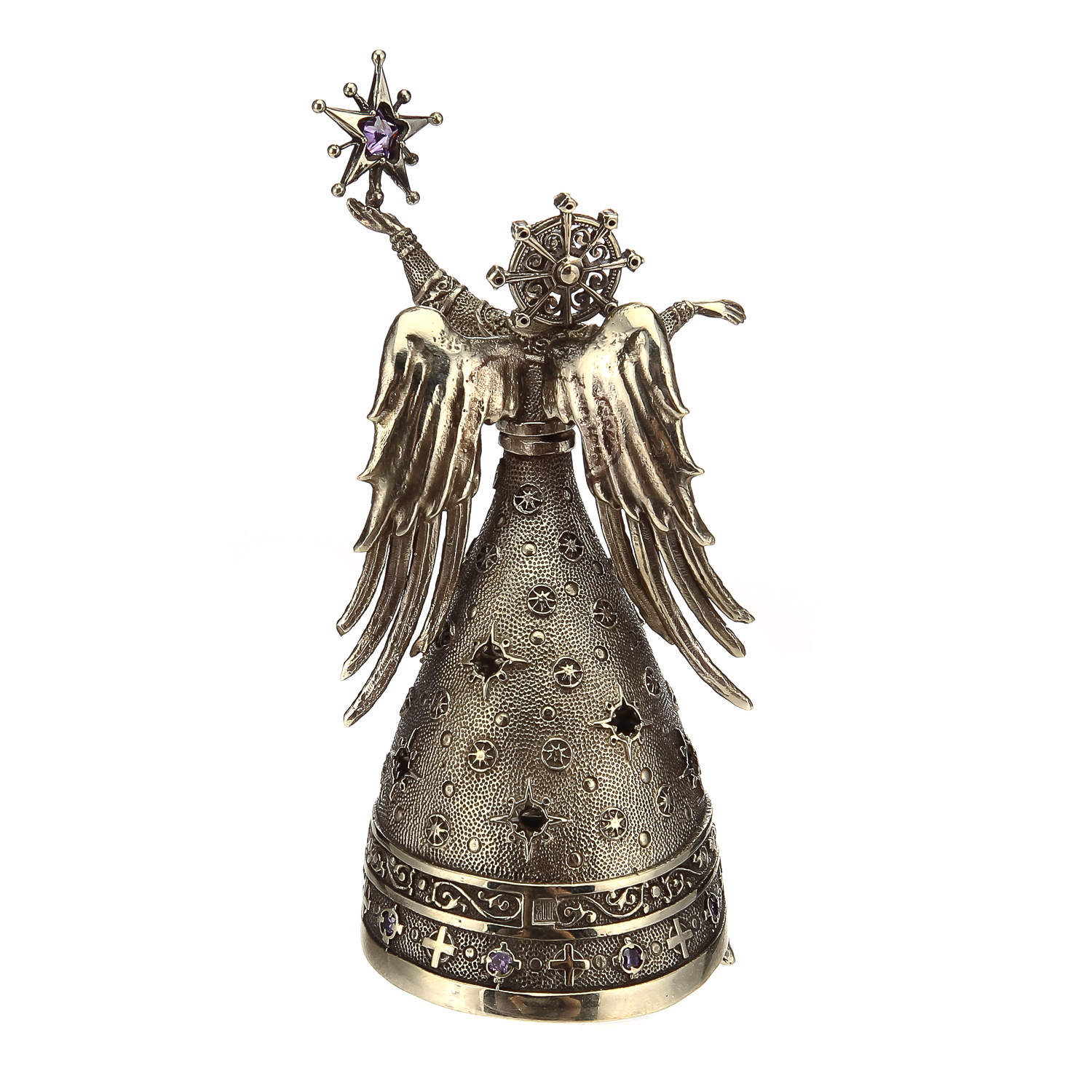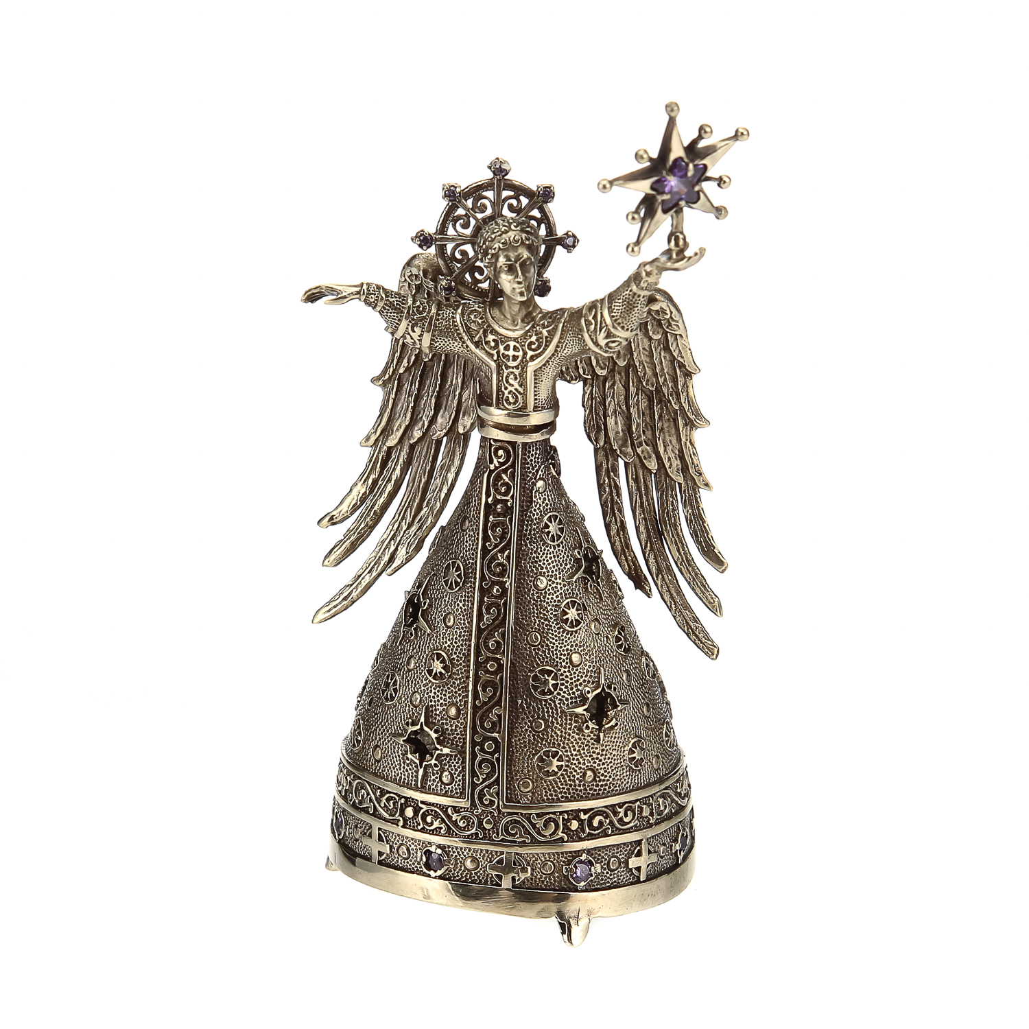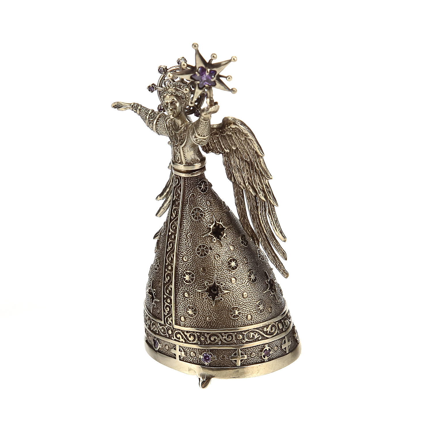 Этот колокольчик из бронзы имеет "тулово" и ручку в виде скульптуры ангела со звездой Рождества в руке, инкрустированное полудрагоценными камнями - сияющими фианитами. Он является чудесным образцом бронзового литья, единственным в своем роде.