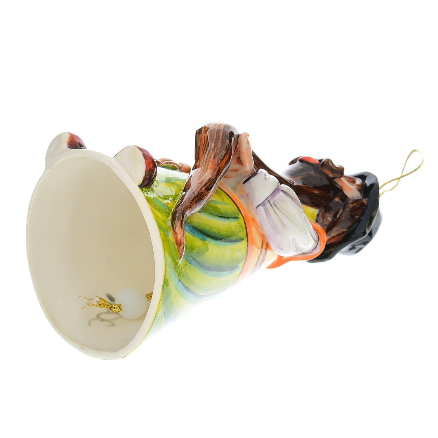 Карабас-Барабас - персонаж сказки про Золотой ключик Алексея Толстого. А колокольчик ручной работы со скульптурным образом обезьяны Карабаса-Барабаса - это дизайнерский сувенир, украшение интерьера. Перед Вами - штучный образец декоративного фарфора, колокольчик со скульптурным "туловом" из фарфора и яркой росписью, покрытой стеклянной глазурью.