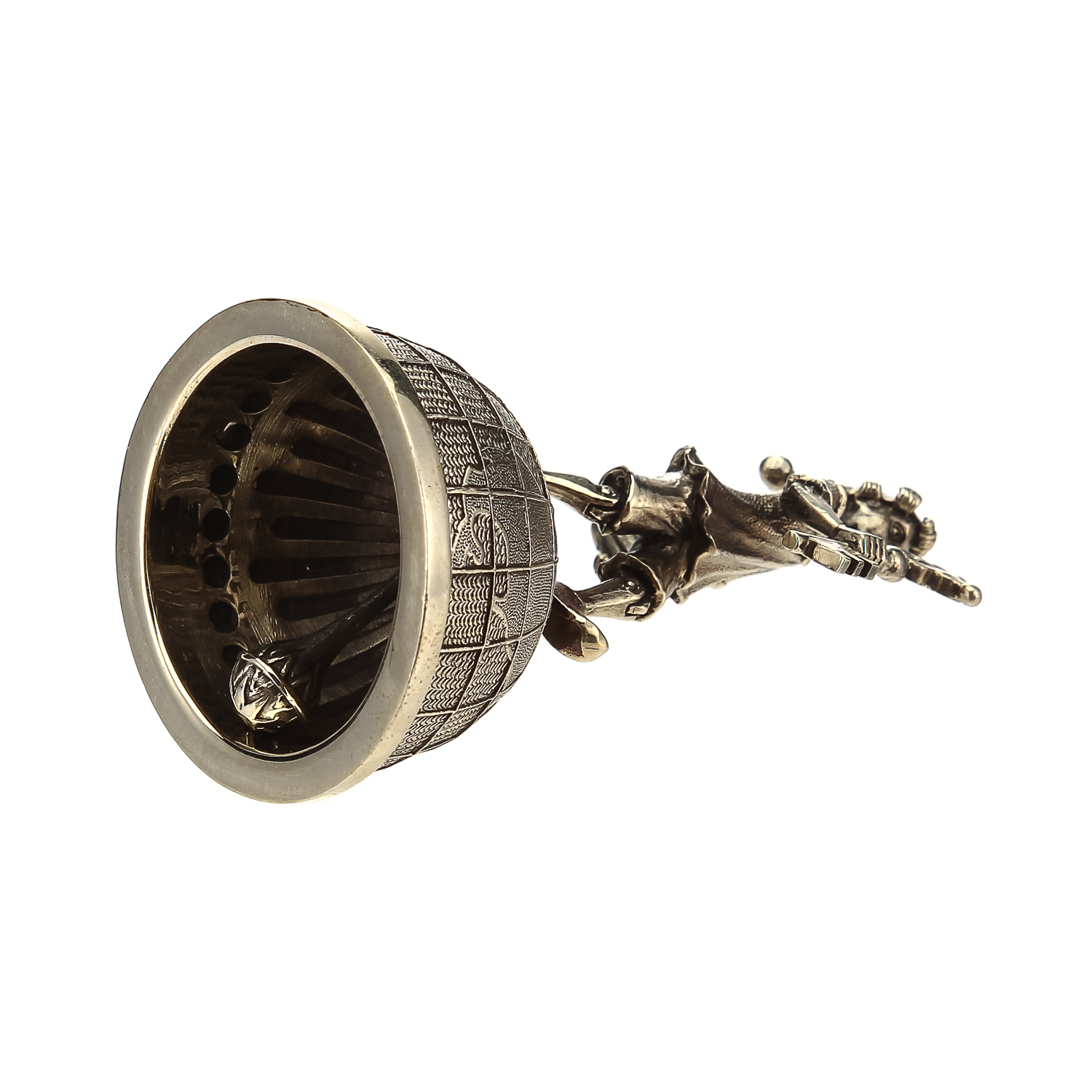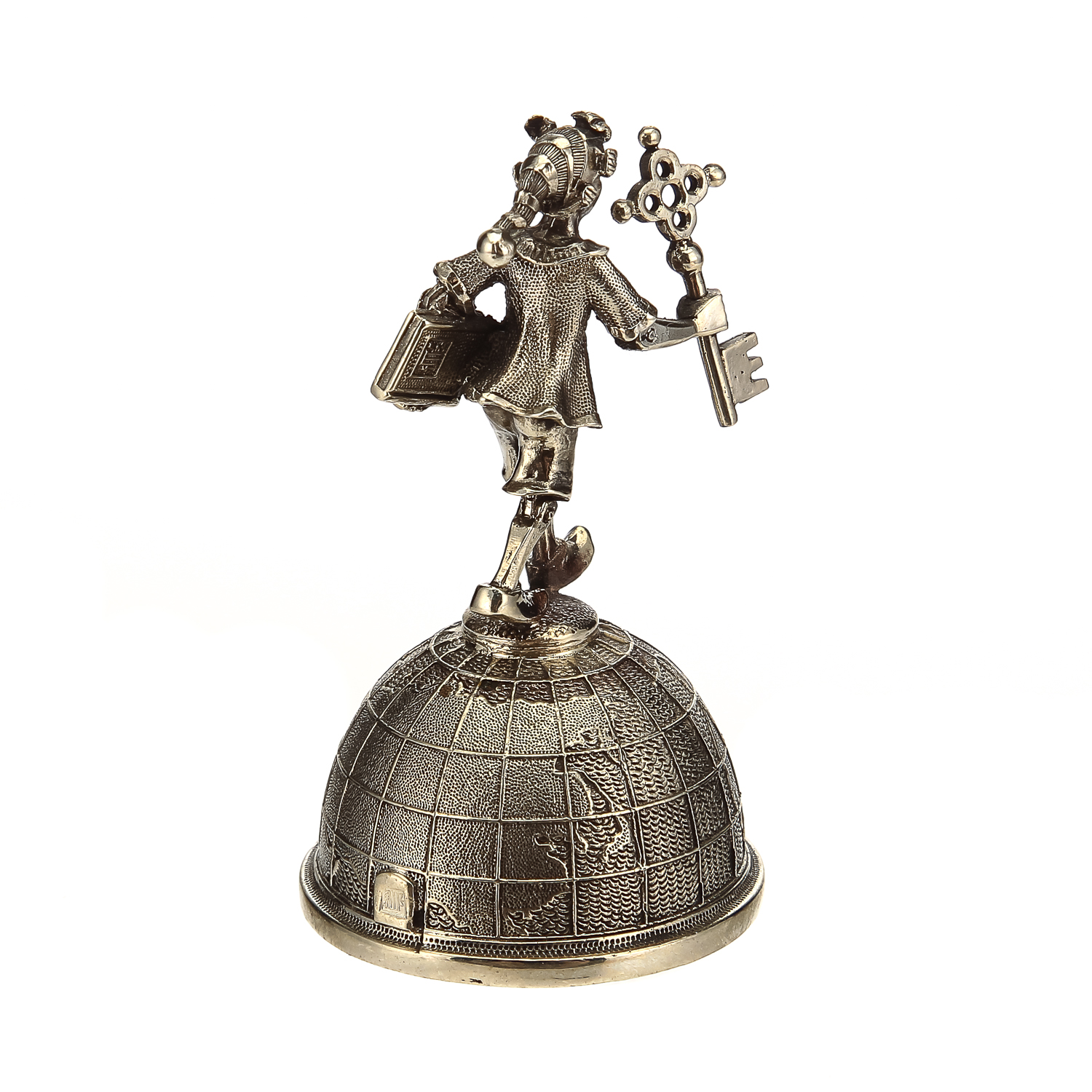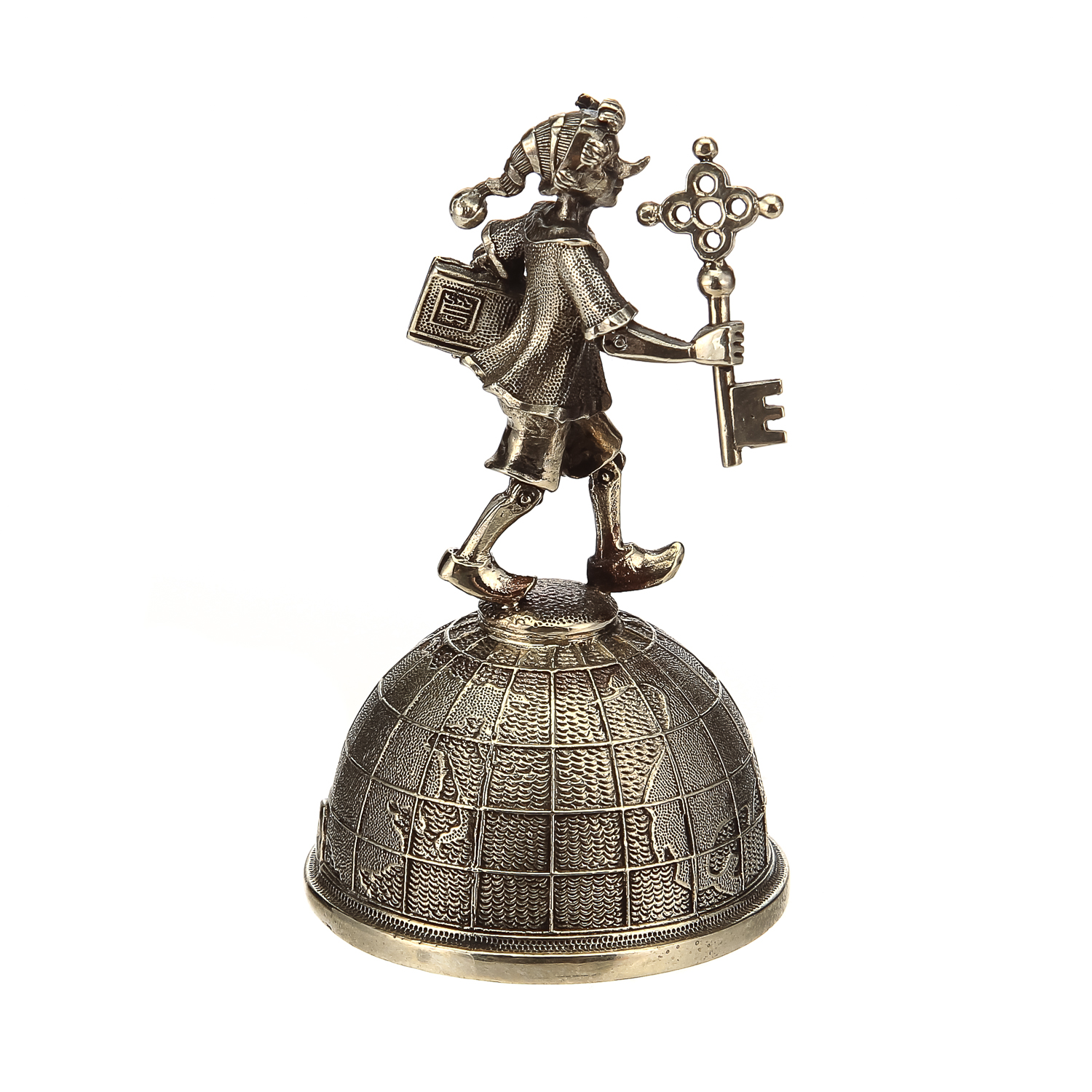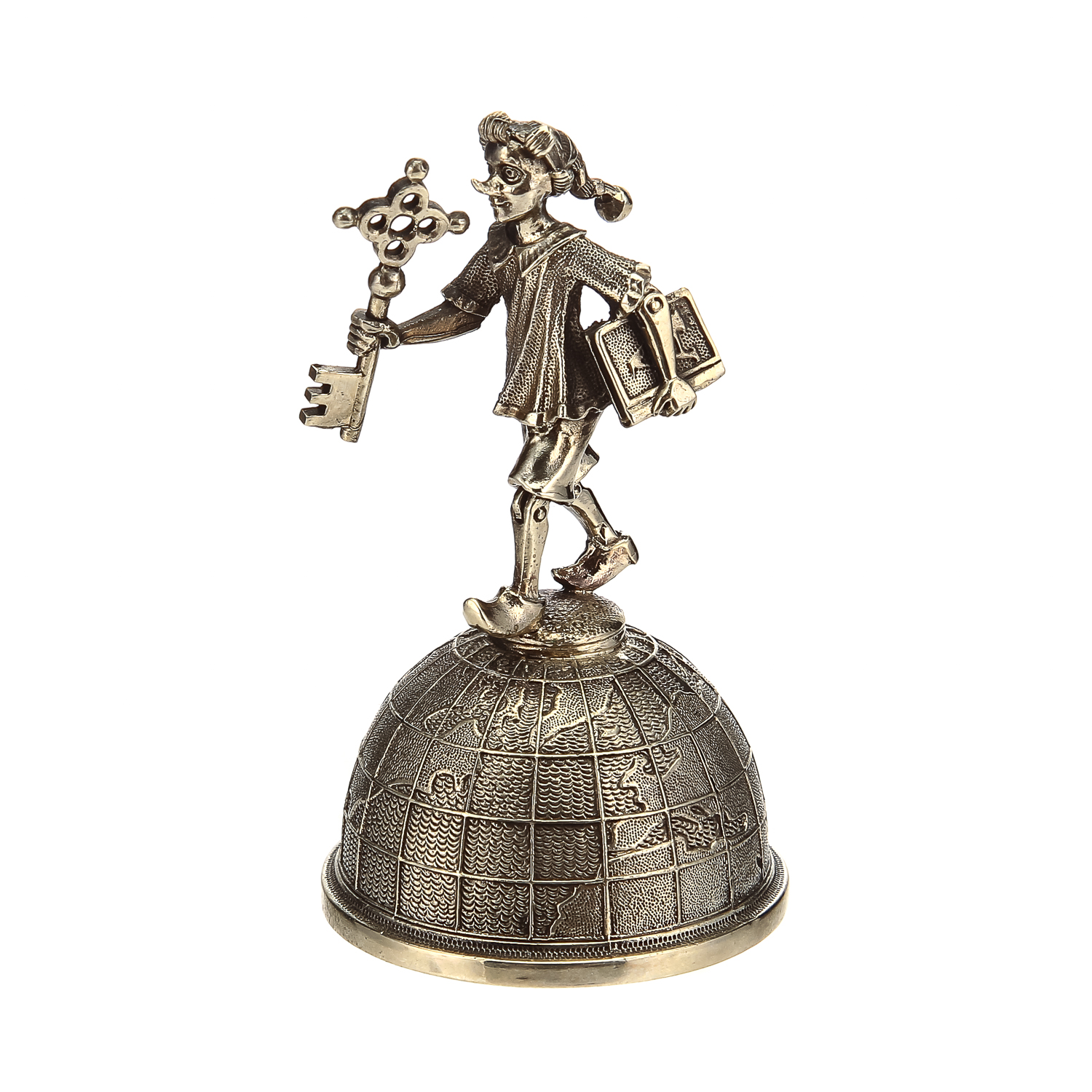 Предлагаемый колокольчик представлен в Галерее подарков как штучный образец предметного дизайна и металлического литья с художественной, коллекционной ценностью. "Тулово" колокольчик представлено художником по металлу в виде половины глобуса, на которой возвышается "ручка" в виде скульптуры, в которой воплощен  образ культового персонажа сказки Алексея Толстого про золотой ключик, любимца русских  детей, Буратино. Монолитный корпус  оформлен  из  бронзы в соответствии с оригинальным авторским эскизом.