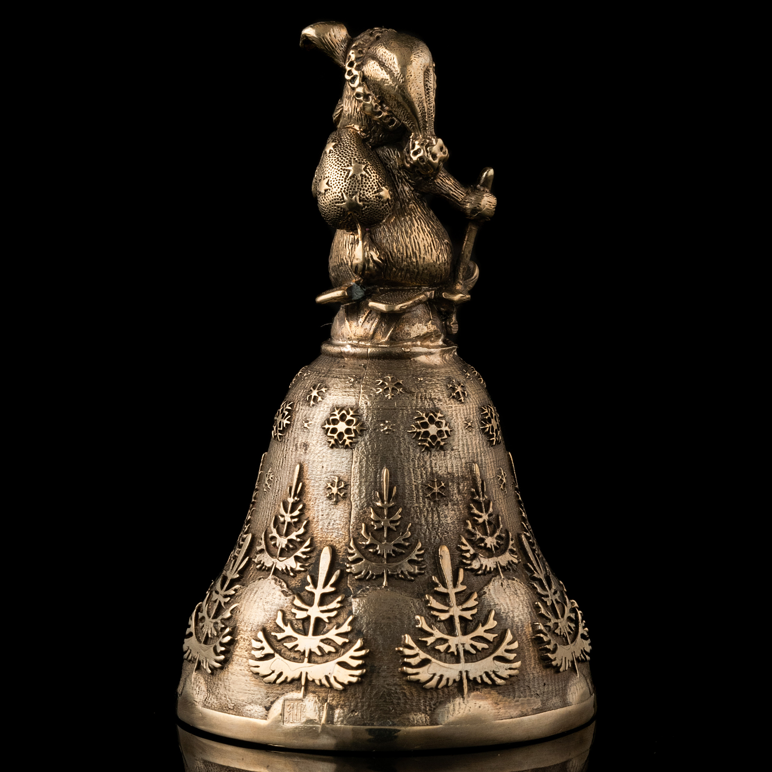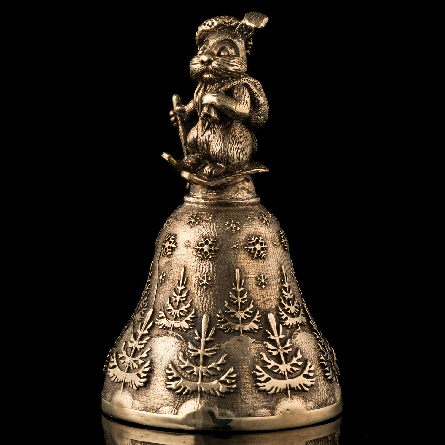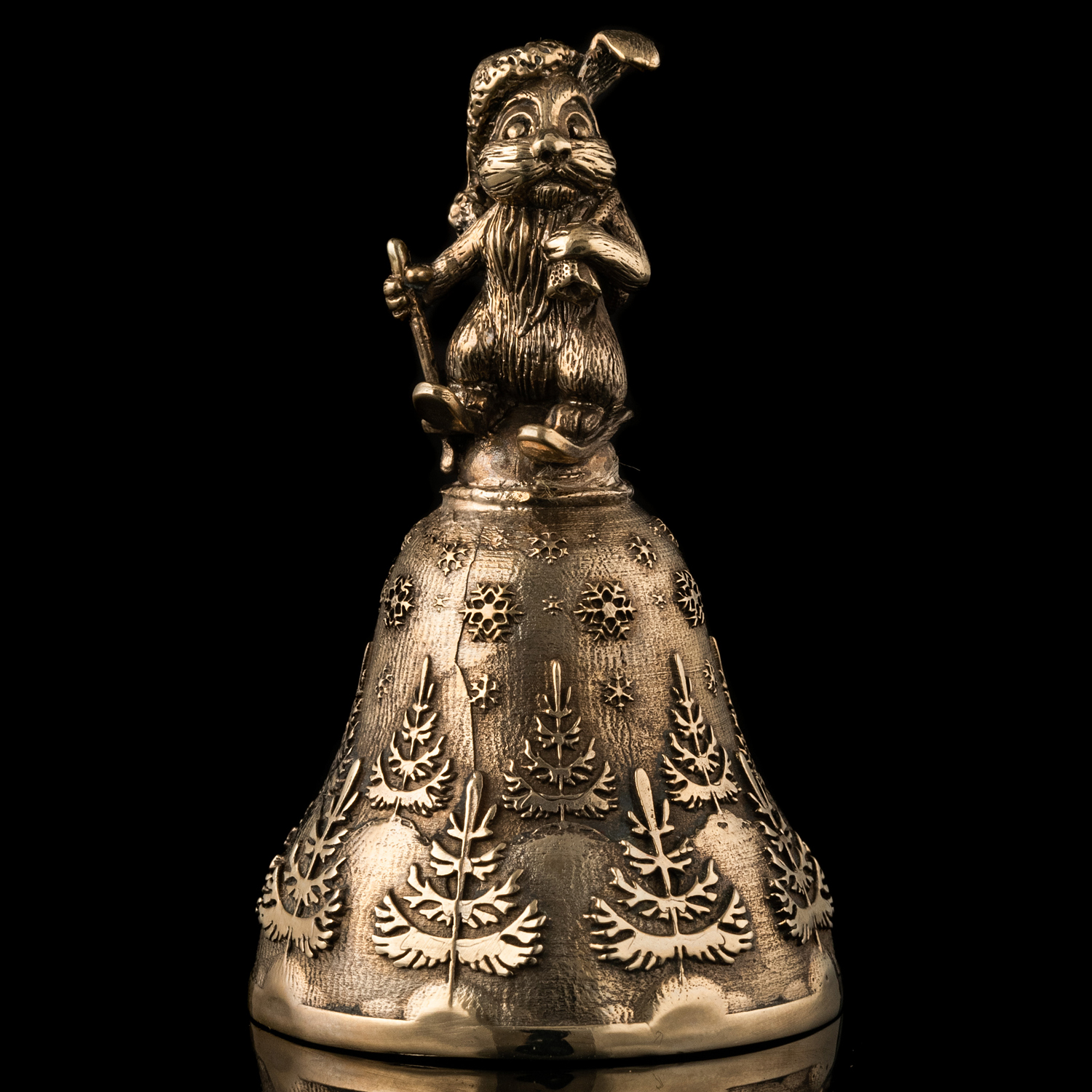 Миниатюрный бронзовый колокольчик создан методом художественного литья из красивой бронзы. Колокольчик примечателен прежде всего своим оформлением. Так его корона выполнена в виде фигурки очаровательного зайчишки с мешком подарков и на лыжах. Несмотря на малый размер фигурки мастерам удалось проработать внешность зайчика до мельчайших деталей. Юбка колокольчика оформлена «зимними» рисунками: заснеженными елочками и красивыми снежинками, кружащими в воздухе.