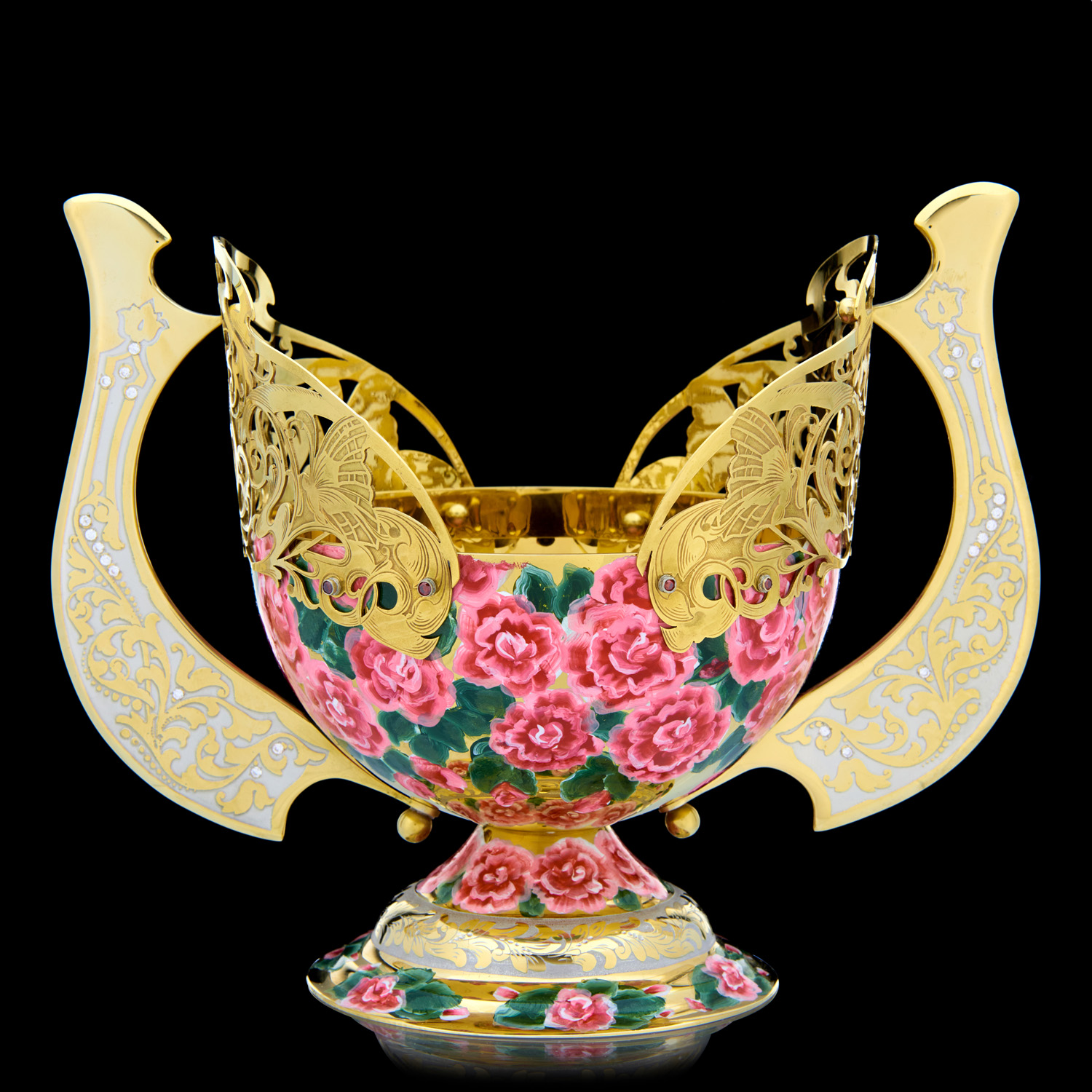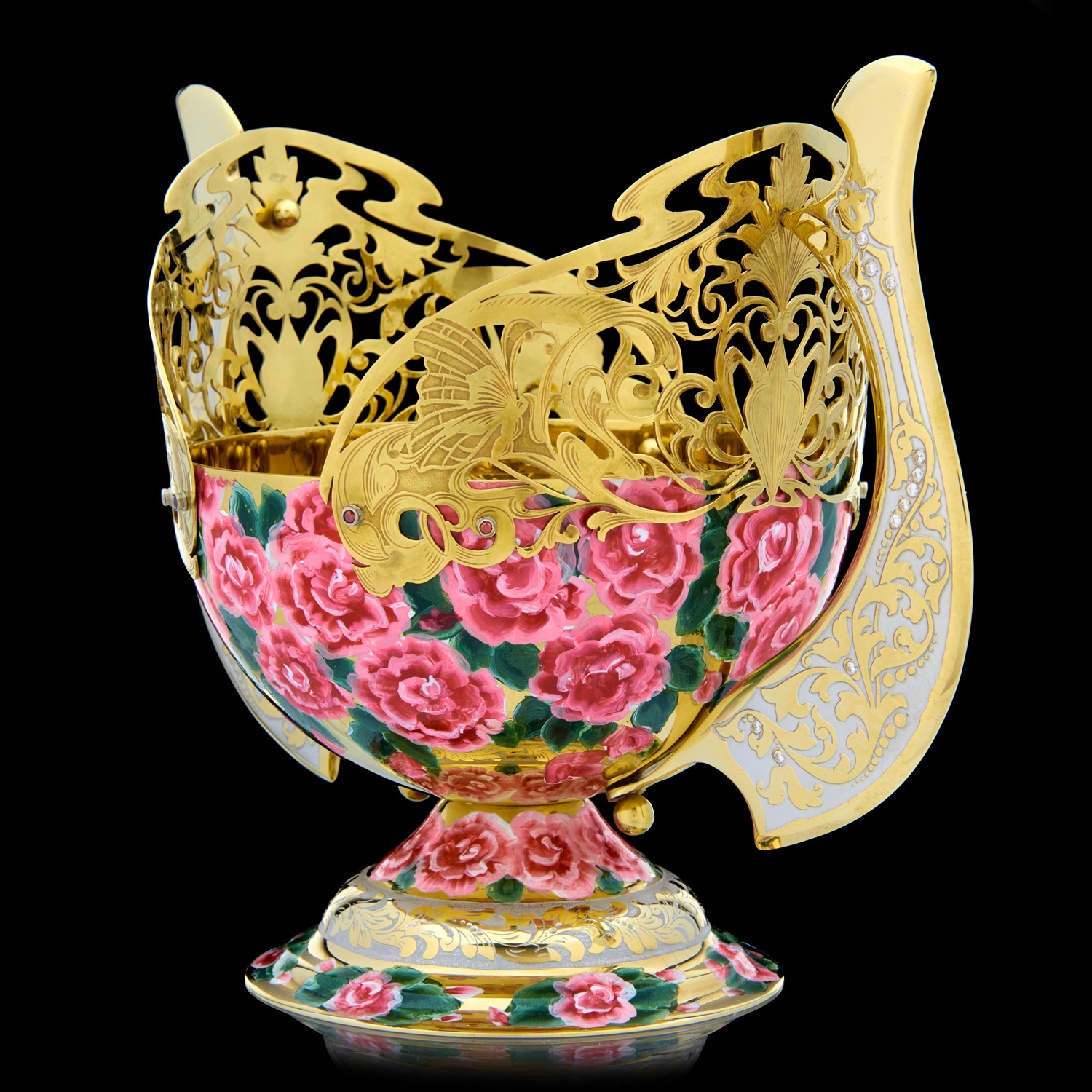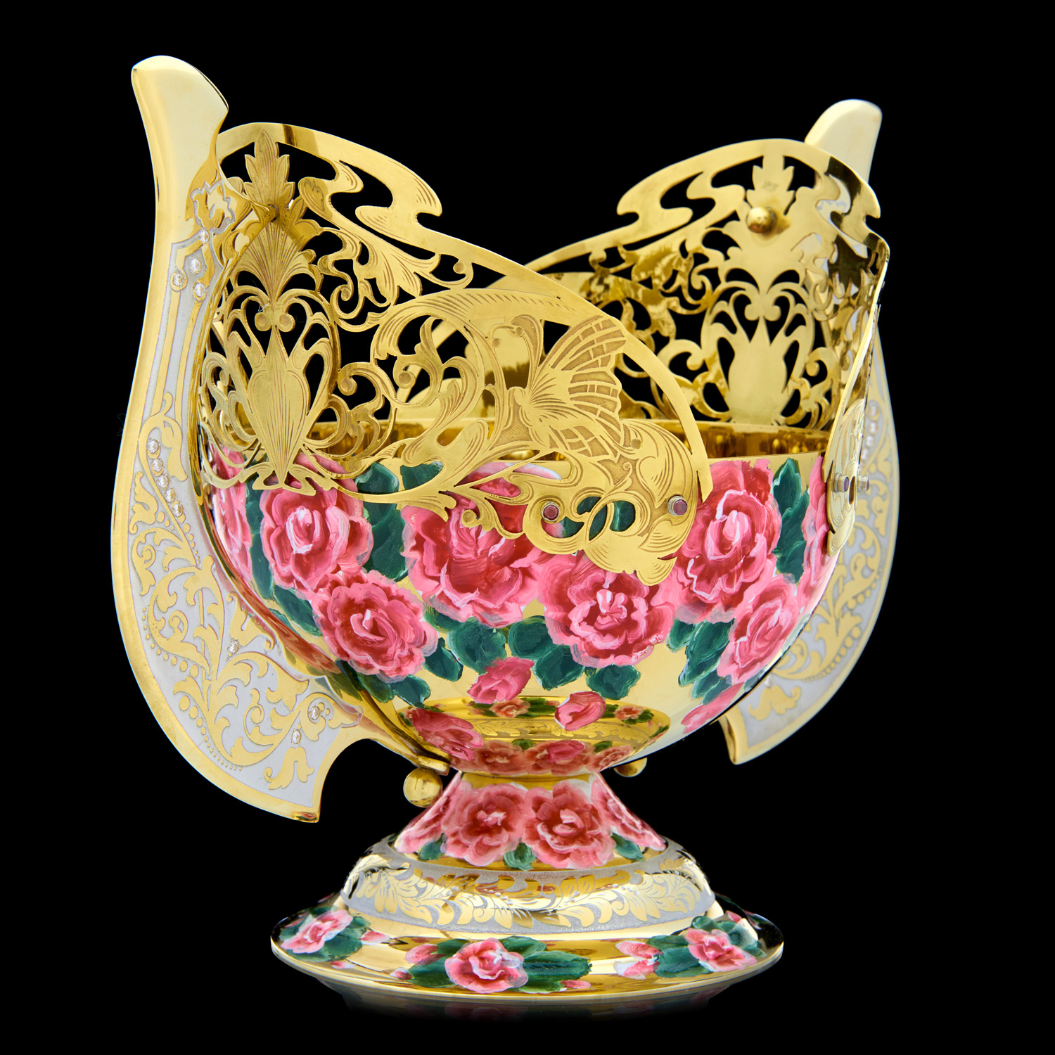 Конфетница из позолоченного кружева усыпана розовыми бутонами, созданными в технике цветной эмали.Розы символизируют любовь, нежность и счастье. В западной христианской традиции роза являлась символом Богородицы, хотя в Библии роза почти не упоминается. В восточной христианской традиции символизирует Богородицу лилия. В эпоху Реформации роза стала символом лютеранства (Роза Лютера).