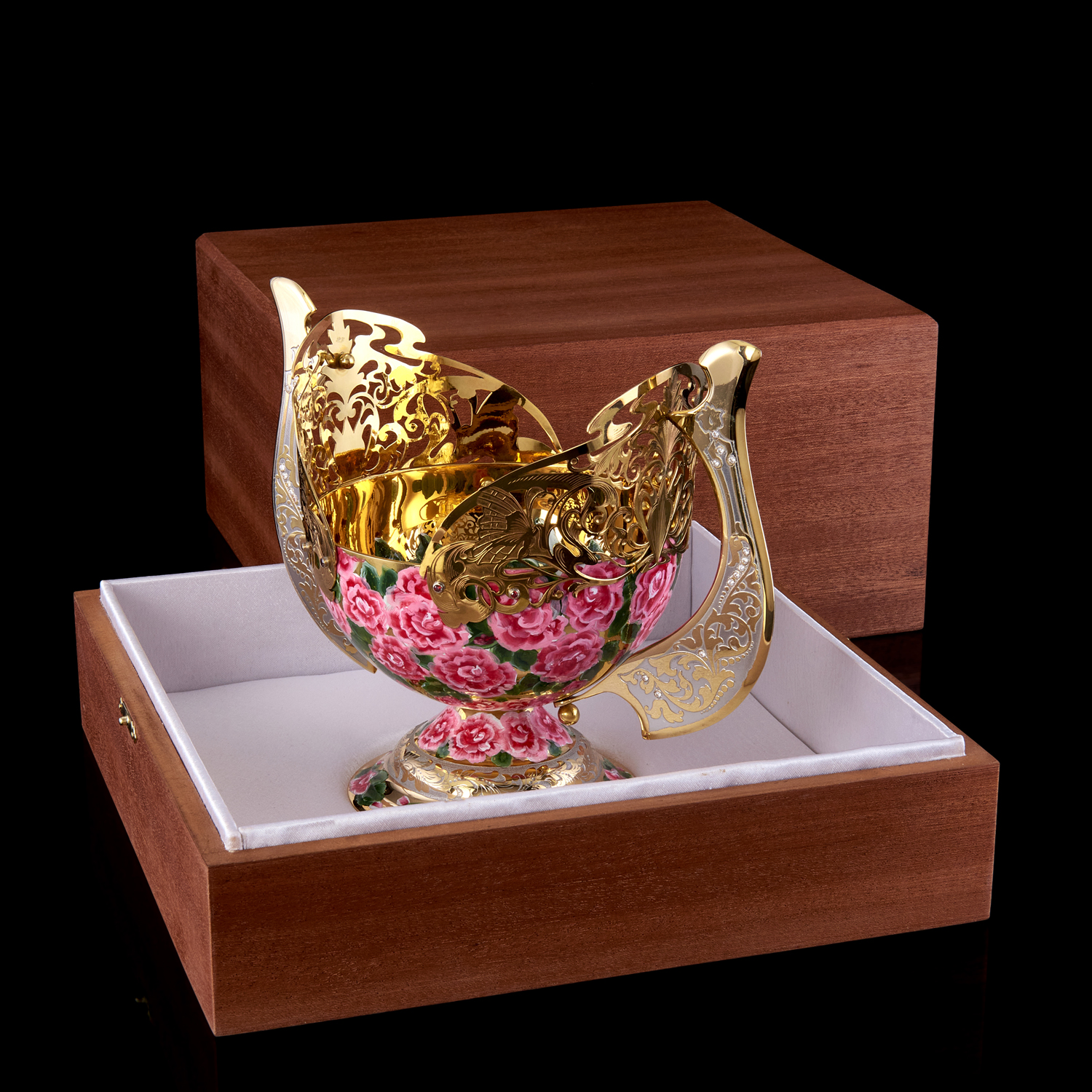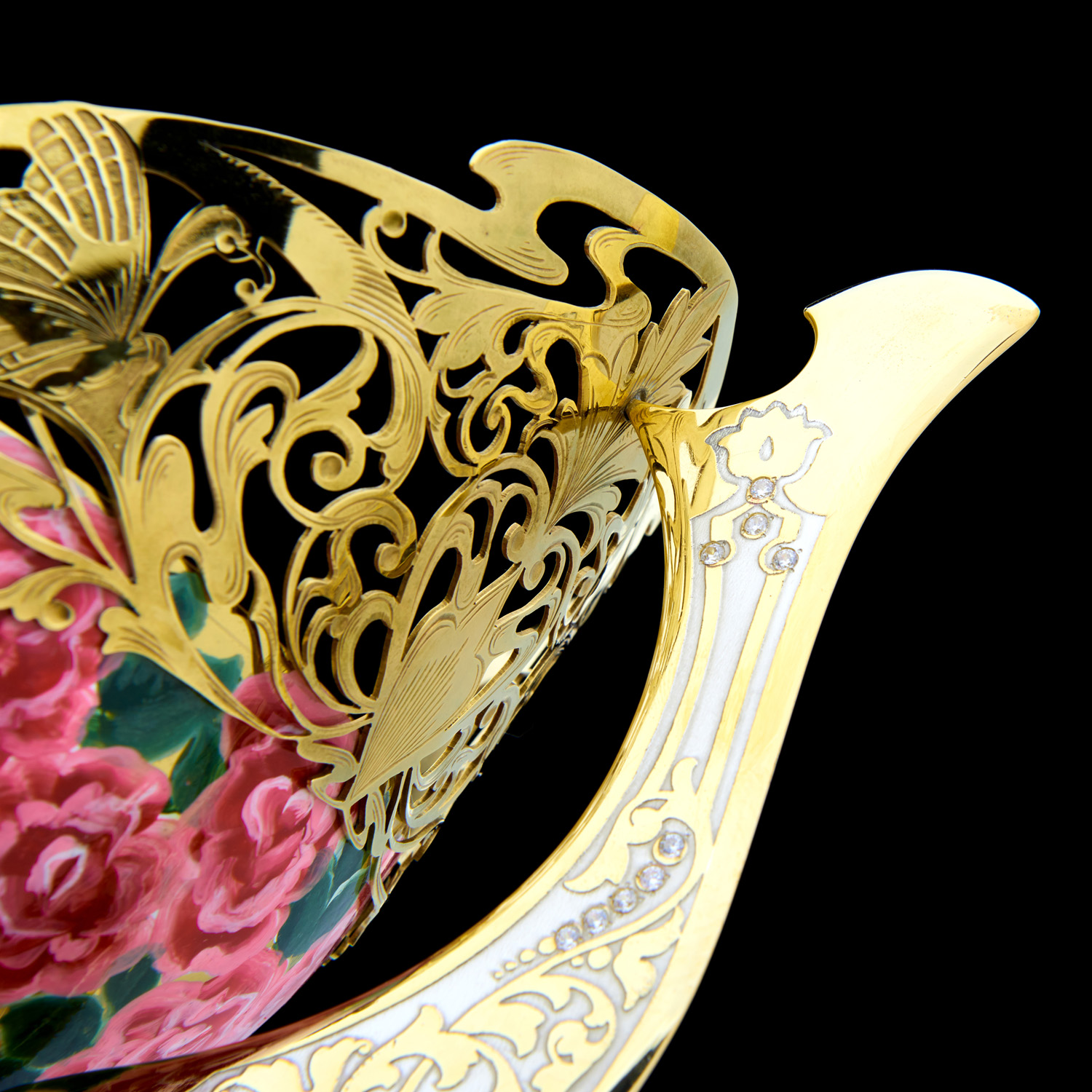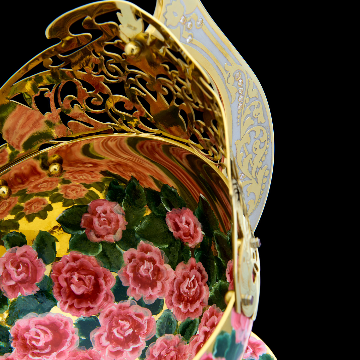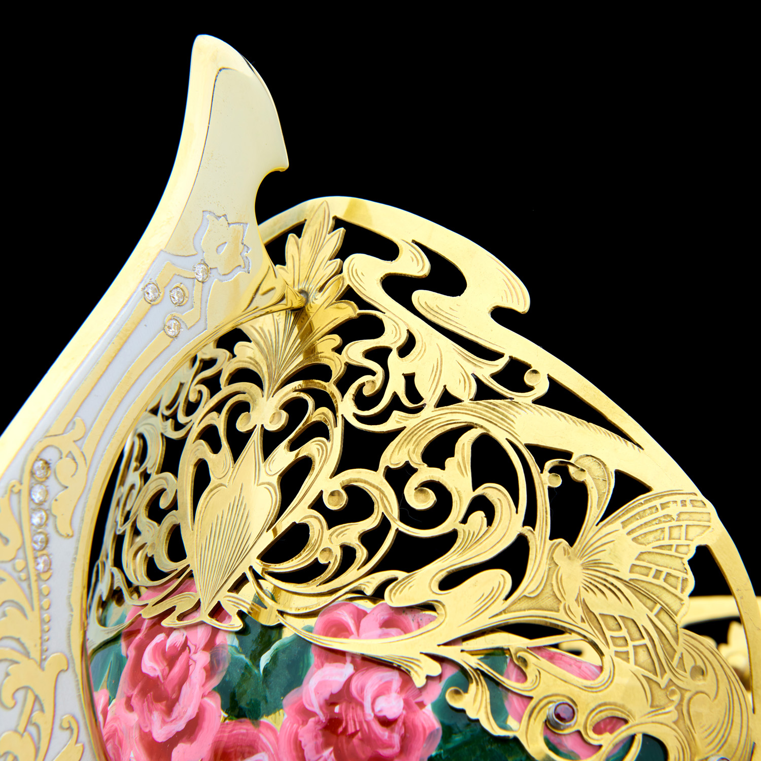 Конфетница из позолоченного кружева усыпана розовыми бутонами, созданными в технике цветной эмали.Розы символизируют любовь, нежность и счастье. В западной христианской традиции роза являлась символом Богородицы, хотя в Библии роза почти не упоминается. В восточной христианской традиции символизирует Богородицу лилия. В эпоху Реформации роза стала символом лютеранства (Роза Лютера).