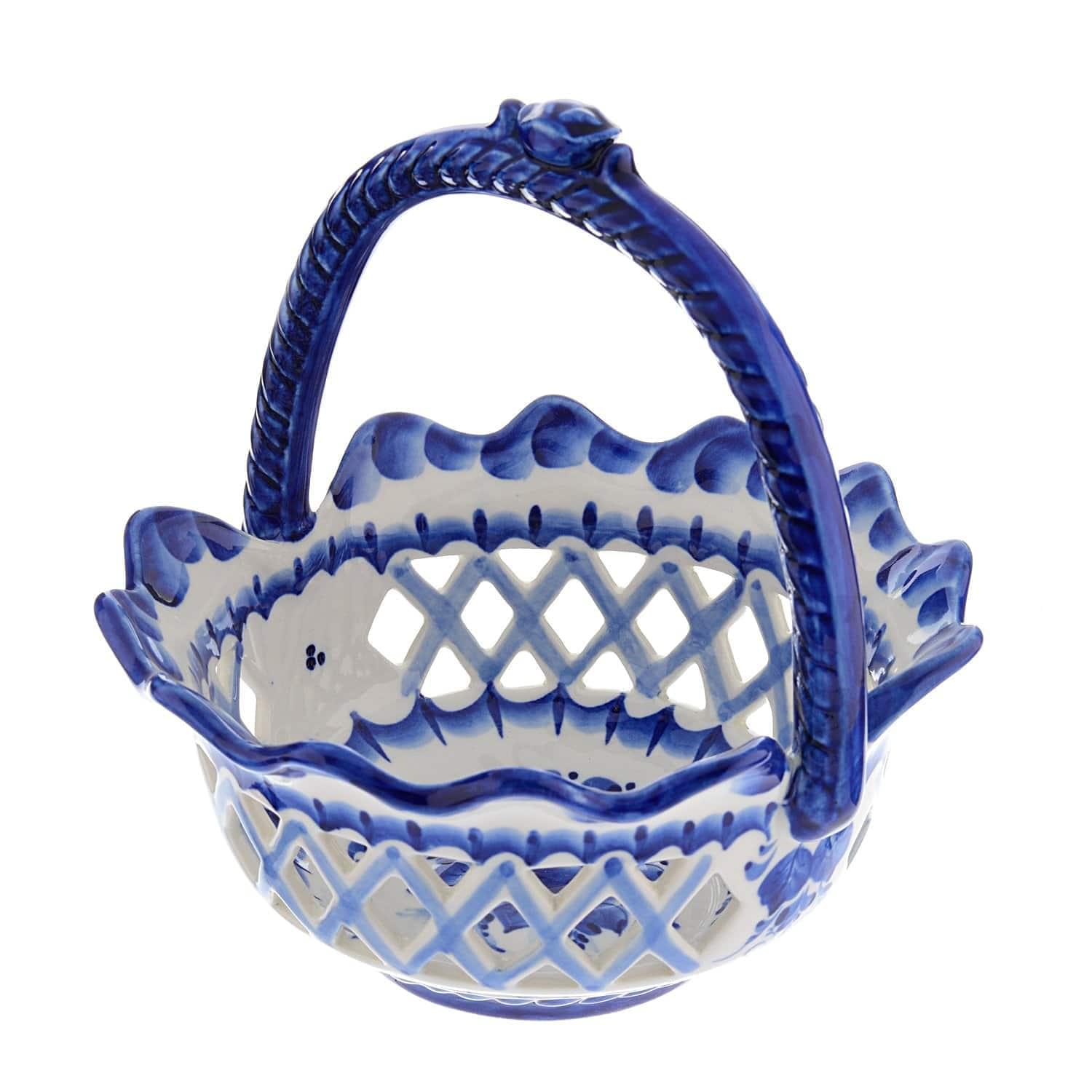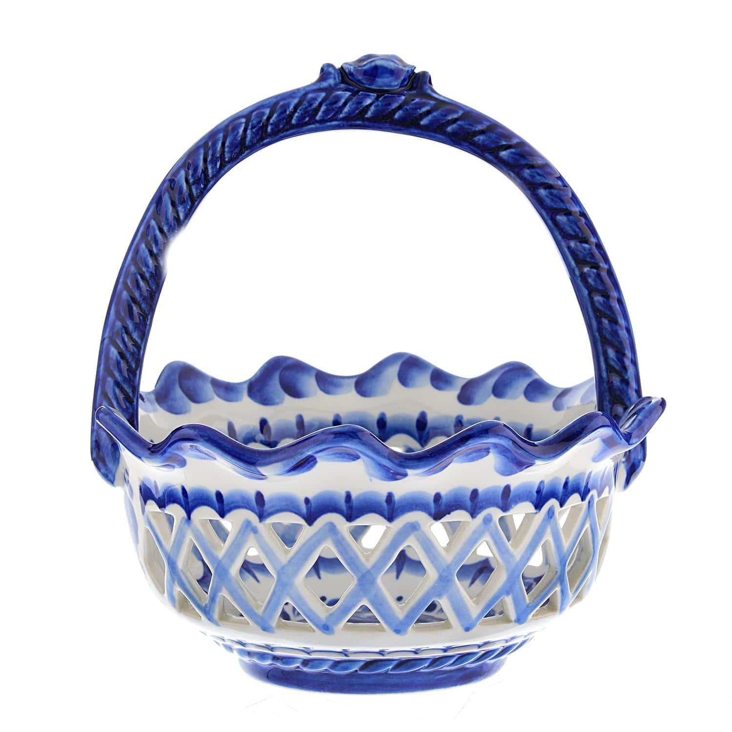 Вашему вниманию - образец авторской утвари для сервировки стола в русском стиле, дизайнерская конфетница ручной работы. Ее корпус с прорезями оформлен гончаром из твердого фарфора и расписан им же вручную. Это штучный образец гжельского промысла, процветающего на территории двух бывших уездов, Бронницкого и Богородского, богатых особой глиной...