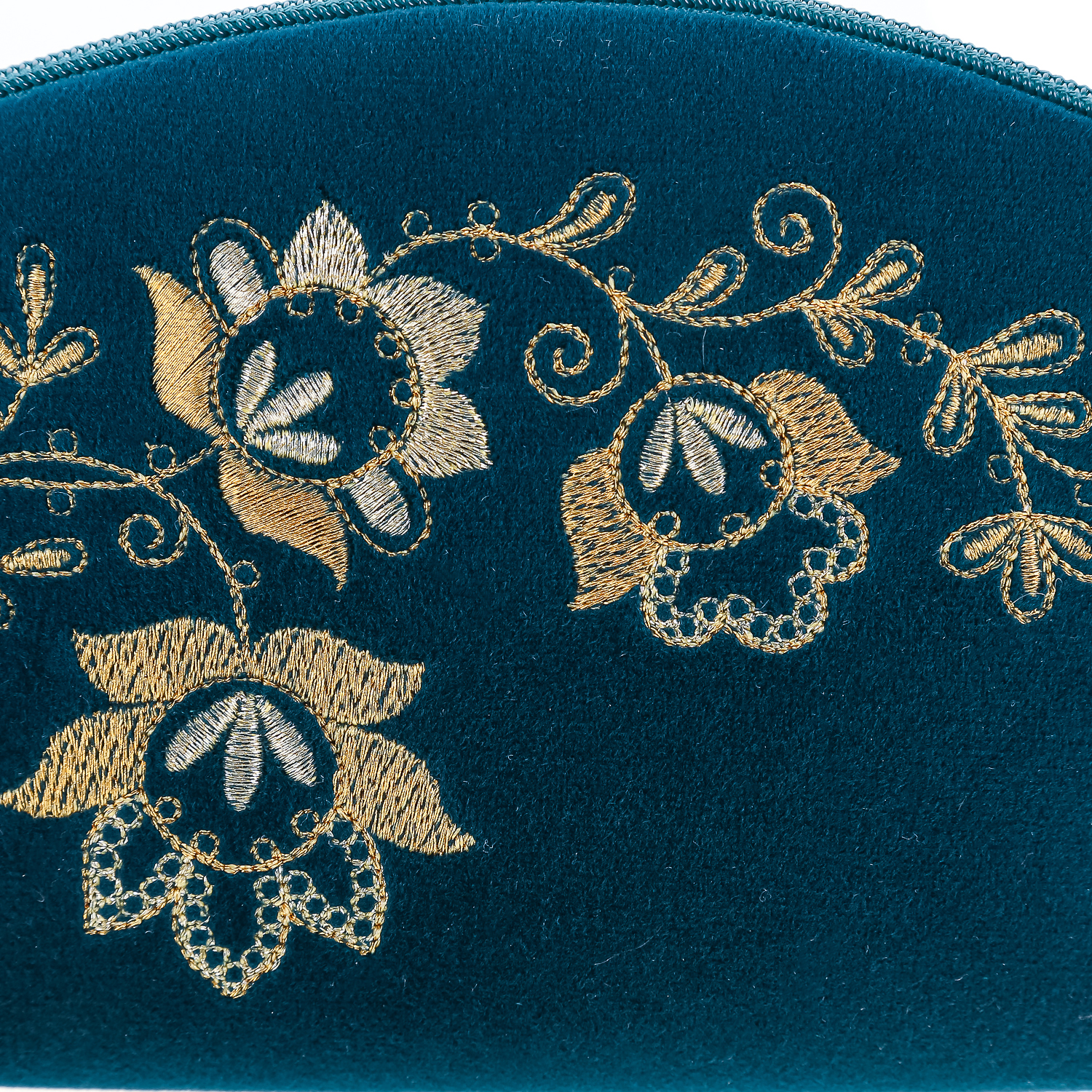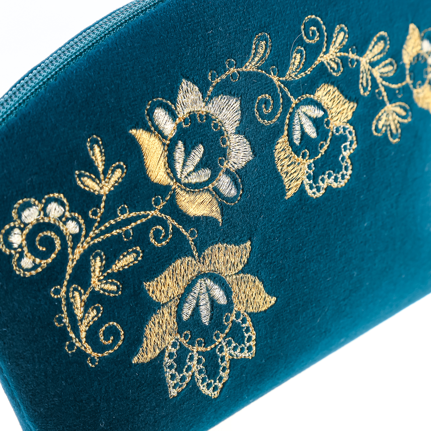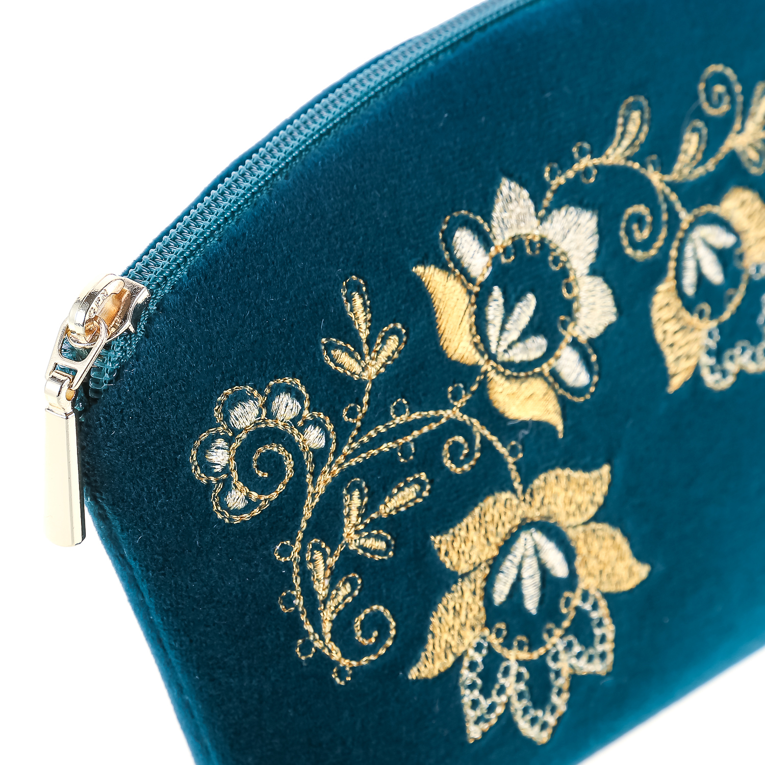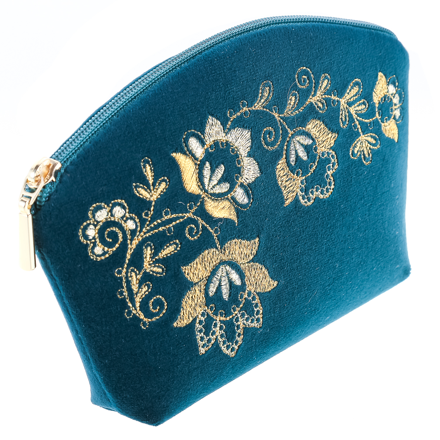 Косметичка бархатная "Весеннее настроение". Морская волна с золотой вышивкой