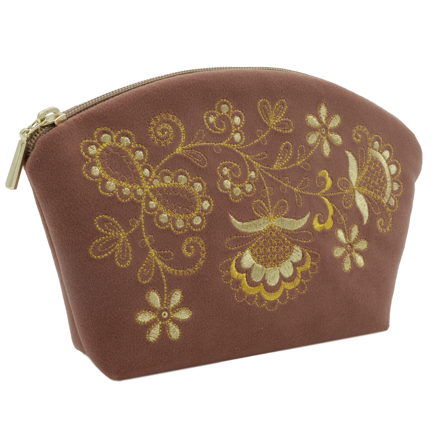 Косметичка "Цветы". Темно-розовая с вышивкой.Материалы: велюр, полиэстер.