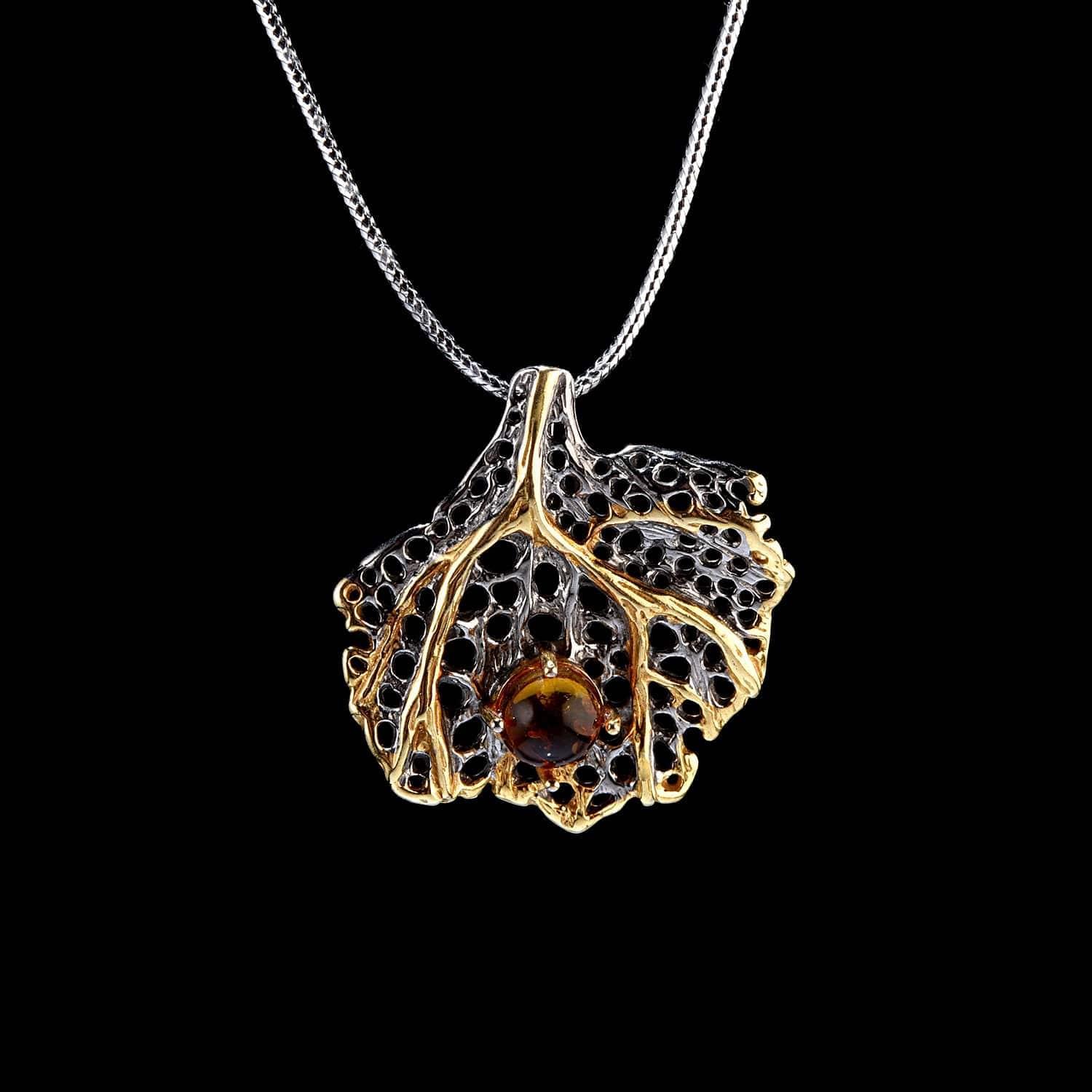 Украшение для ношения на цепочке авторского дизайна из драгоценного металла с актуальным на сегодняшний день родиевым покрытием украшено вставкой из солнечного камня янтаря, усиливающего энергетику. Этот кулон в виде листка с камнем из темного янтаря выглядят на груди таинственно и притягательно...