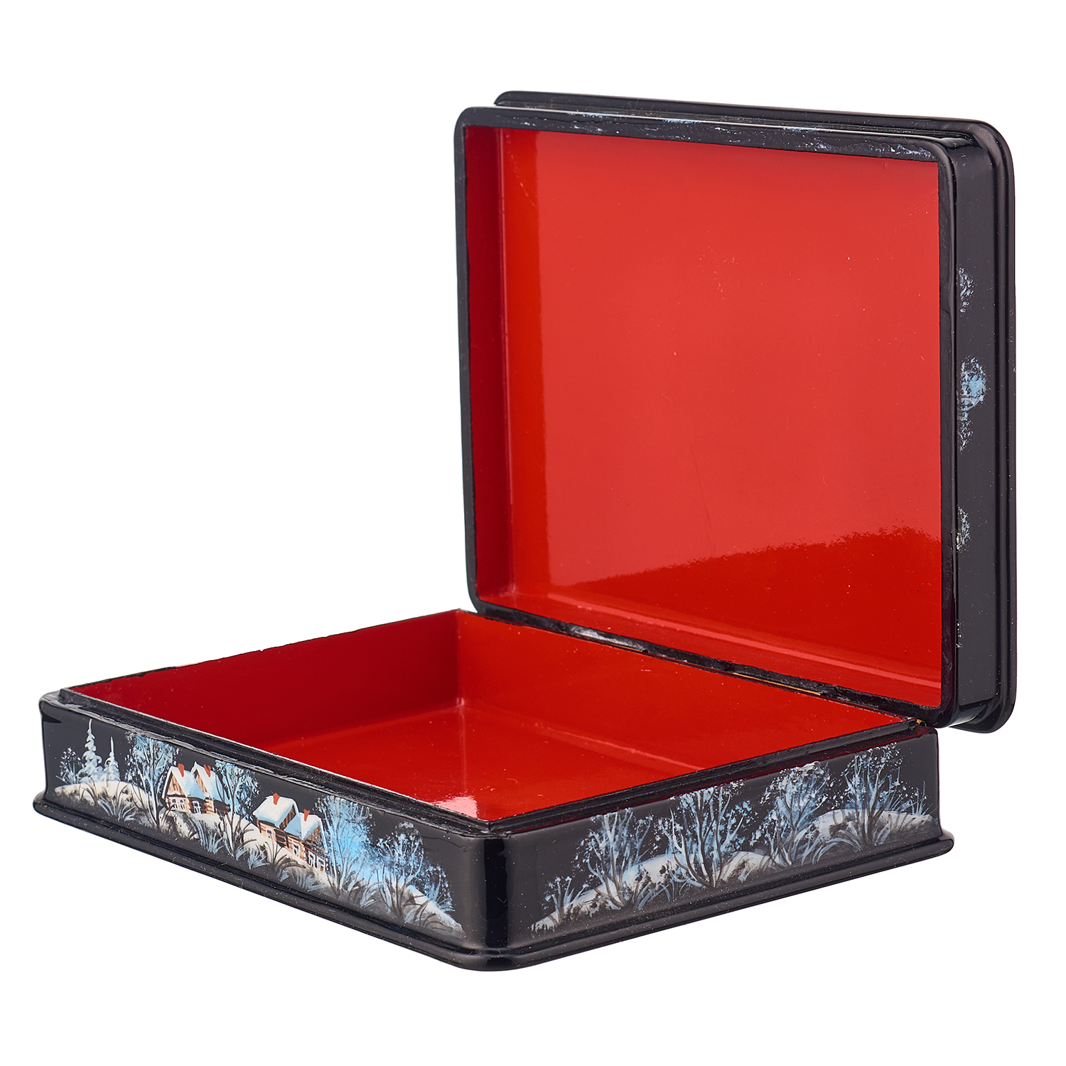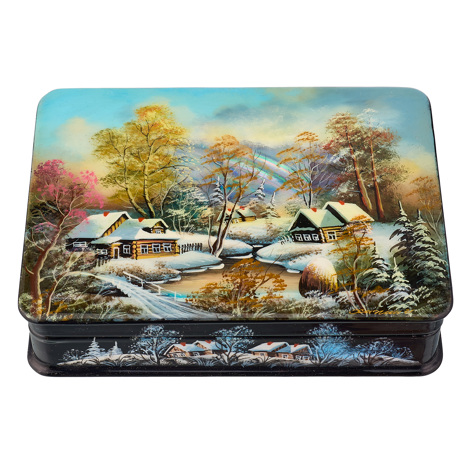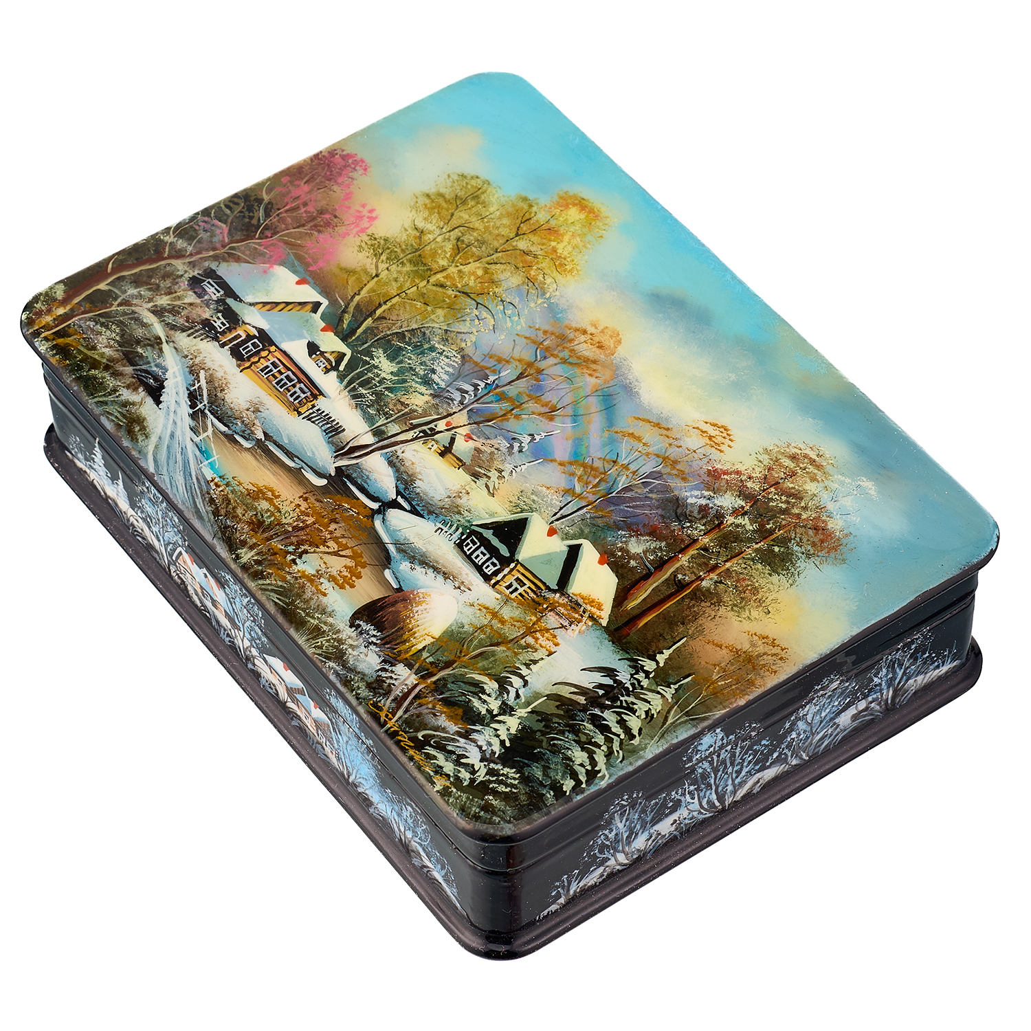 Русские подарки и сувениры → Шкатулки → Лаковая миниатюра → Шкатулка из папье-маше с художественной росписью "Зима в деревне"