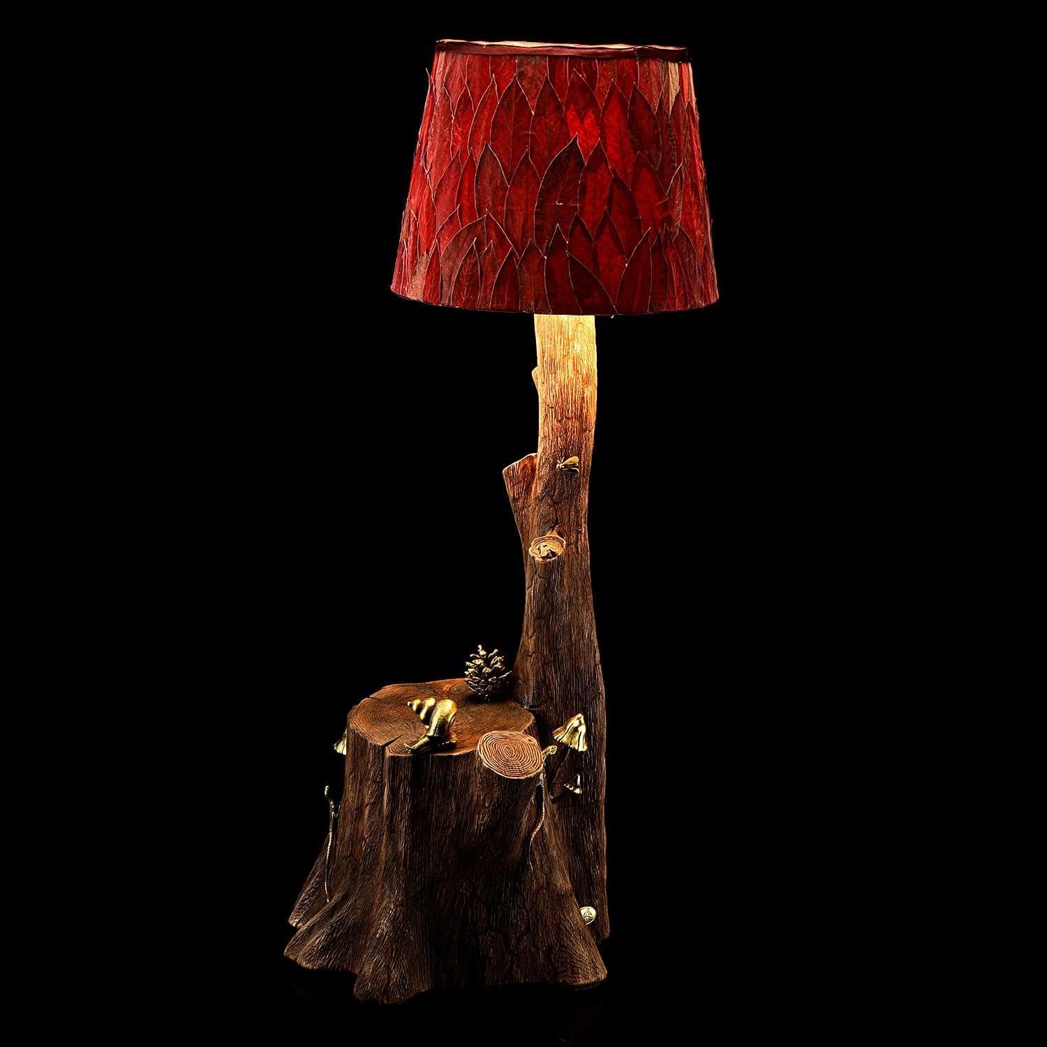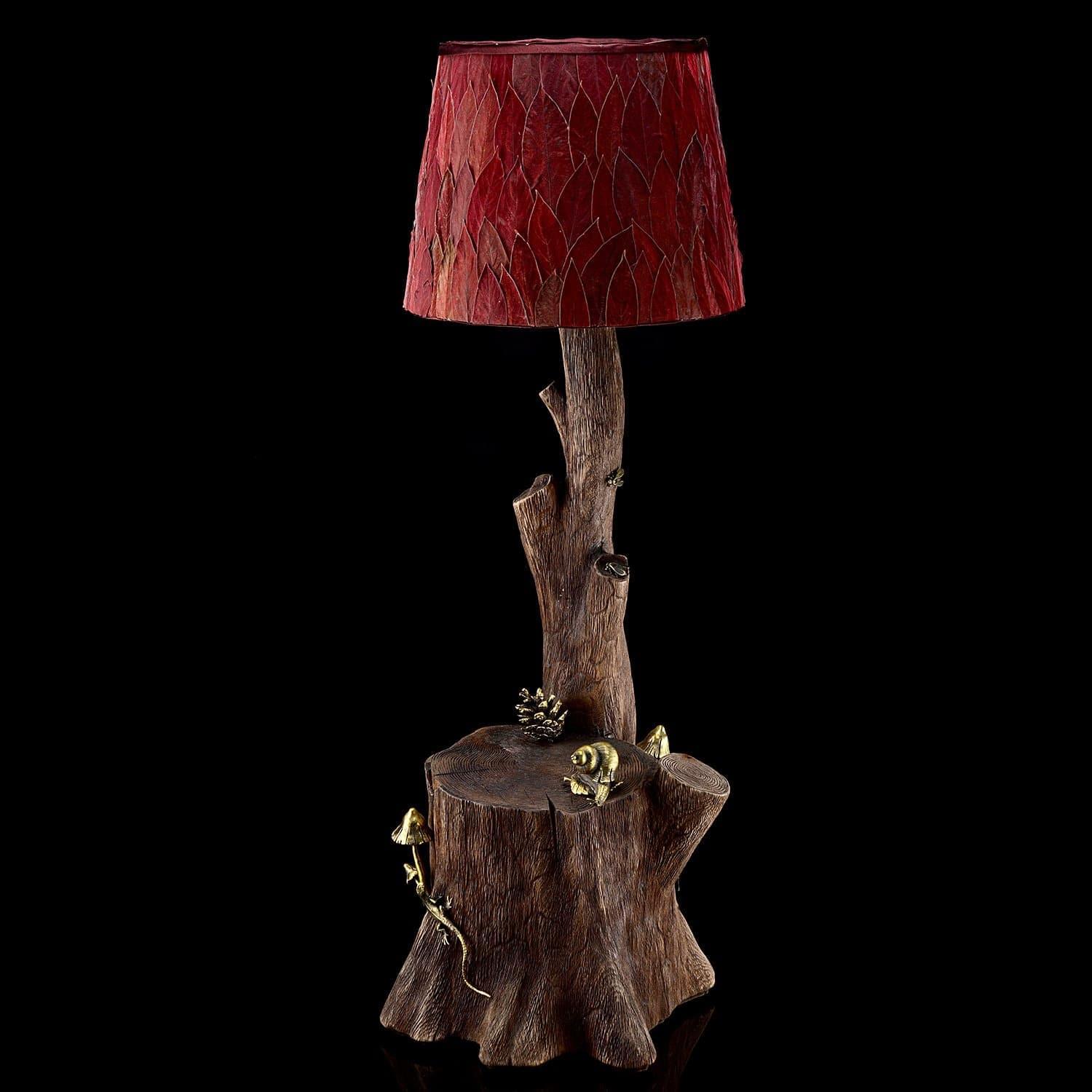 Корпус светильника представляет композицию из дерева с образцами бронзового литья. Абажур обтянут красной тканью, рассеивающей и, одновременно, приглушающей свет. Улитка, грибы, ящерица, сосновая шишка оформлены из бронзы. Корпус светильника сделан из фрагмента дерева. Лампа призвана украсить напольную или мебельную поверхности. Предварительный эскиз для каждой скульптуры выполнен с вниманием к мельчайшим деталям. Каждый корпус тонирован позолотой и патиной. Найдете ли Вы еще такую лампу? Однозначно, нет! .