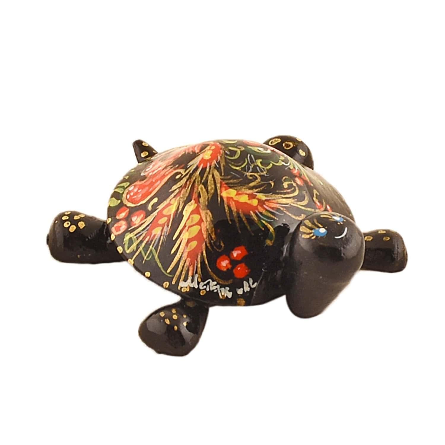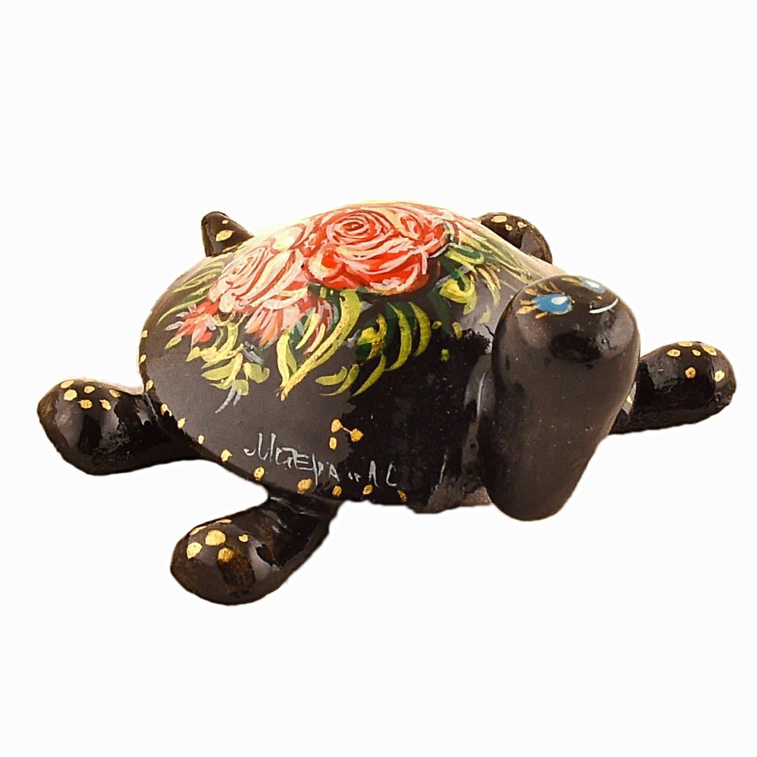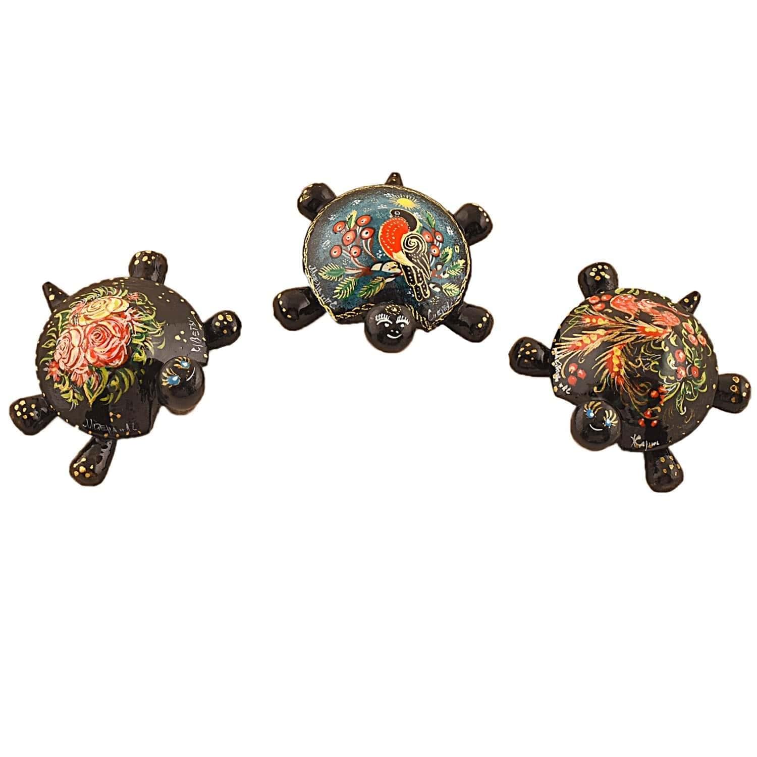 Эти самые ходовые сувениры, магнитики изготовлены из дерева в виде черепашек - символов долголетия, мудрости, защиты и неуязвимости. Оформлены они также вручную тонкой кисточкой и разноцветными красками в технике палехской росписи, истоки которой - в иконописи. Роспись покрыта защитными слоями лака. Чудесный образец хэндмейда и подарок в русском стиле на счастье и удачу для друга!