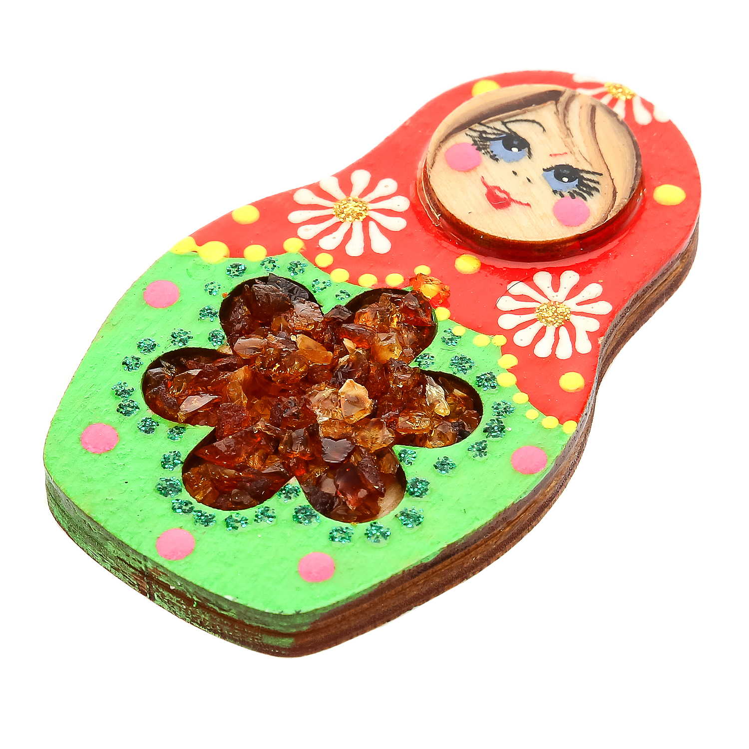 Магнит с янтарной вставкой "Матрешка".Материалы: магнит, дерево, янтарная крошка, краски, лак.