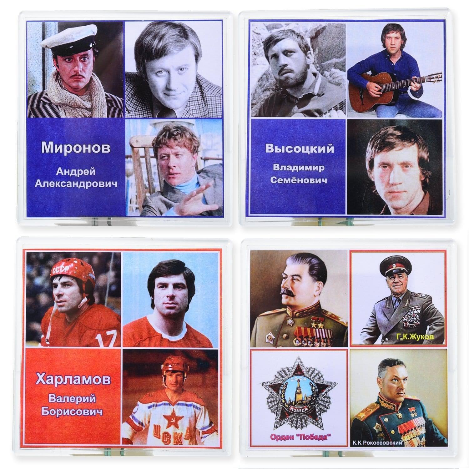 Эта серия ходовых сувениров, магнитов посвящена культовым личностям СССР. Миронову и Высоцкому, Харламову. Четвертый магнит украшен фото верховного главнокомандующего и великих полководцев, повлиявших на ход мировой истории. В коллажном стиле на магните из пластика квадратной формы размещены фото, надписи с ФИО и орден... ....