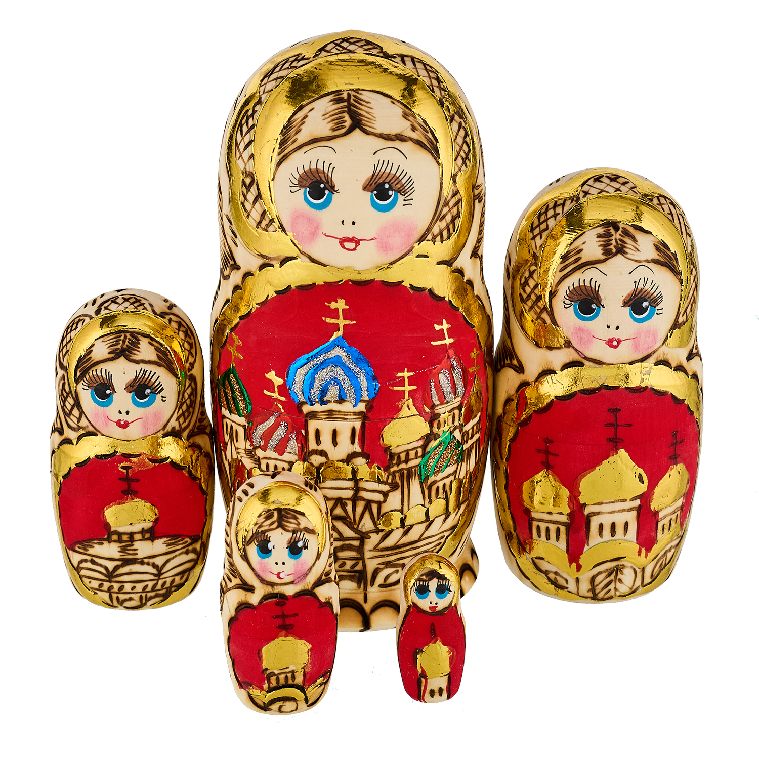 Матрешка с выжиганием "Храм Василия Блаженного" 5 мест.Материалы: дерево, краски, лак.