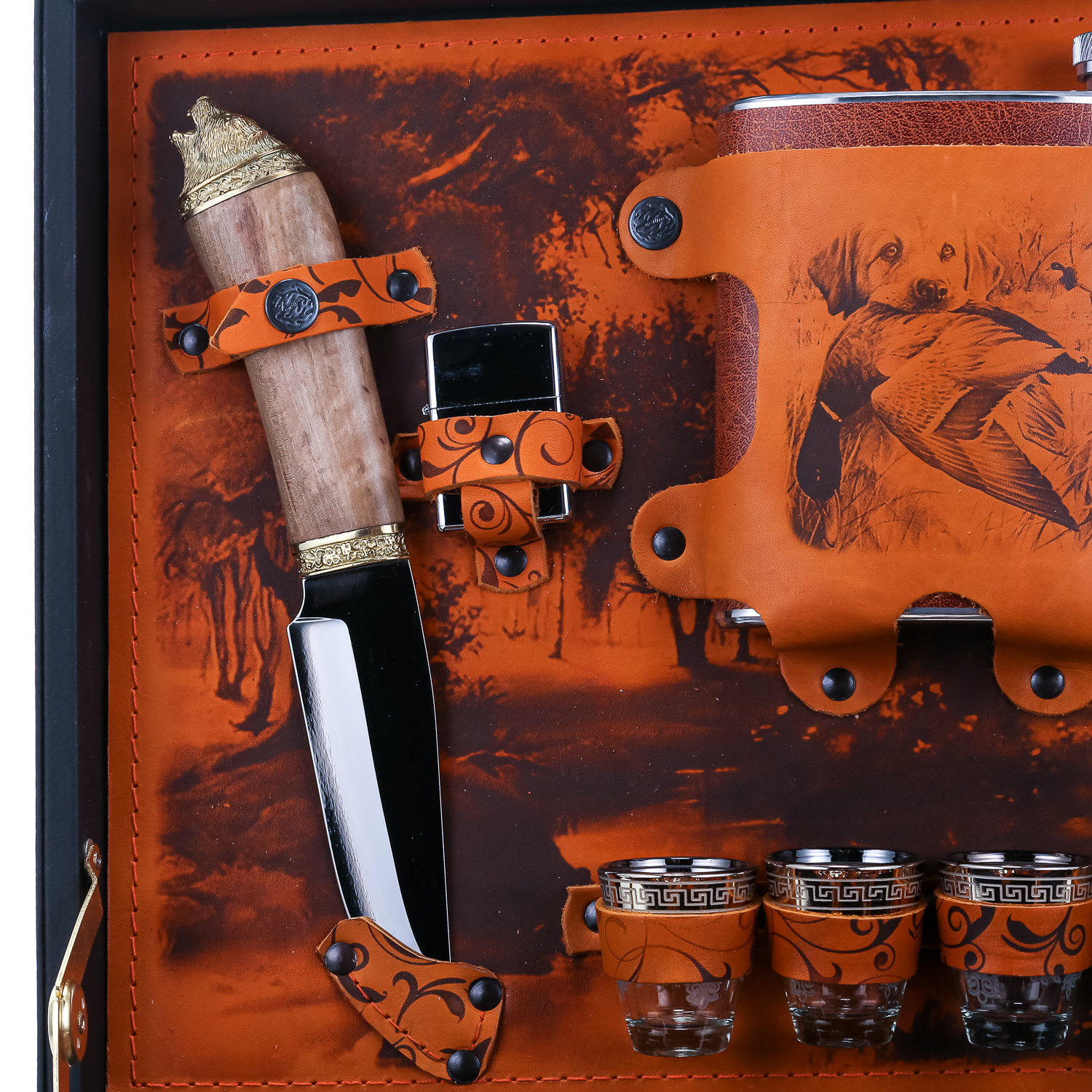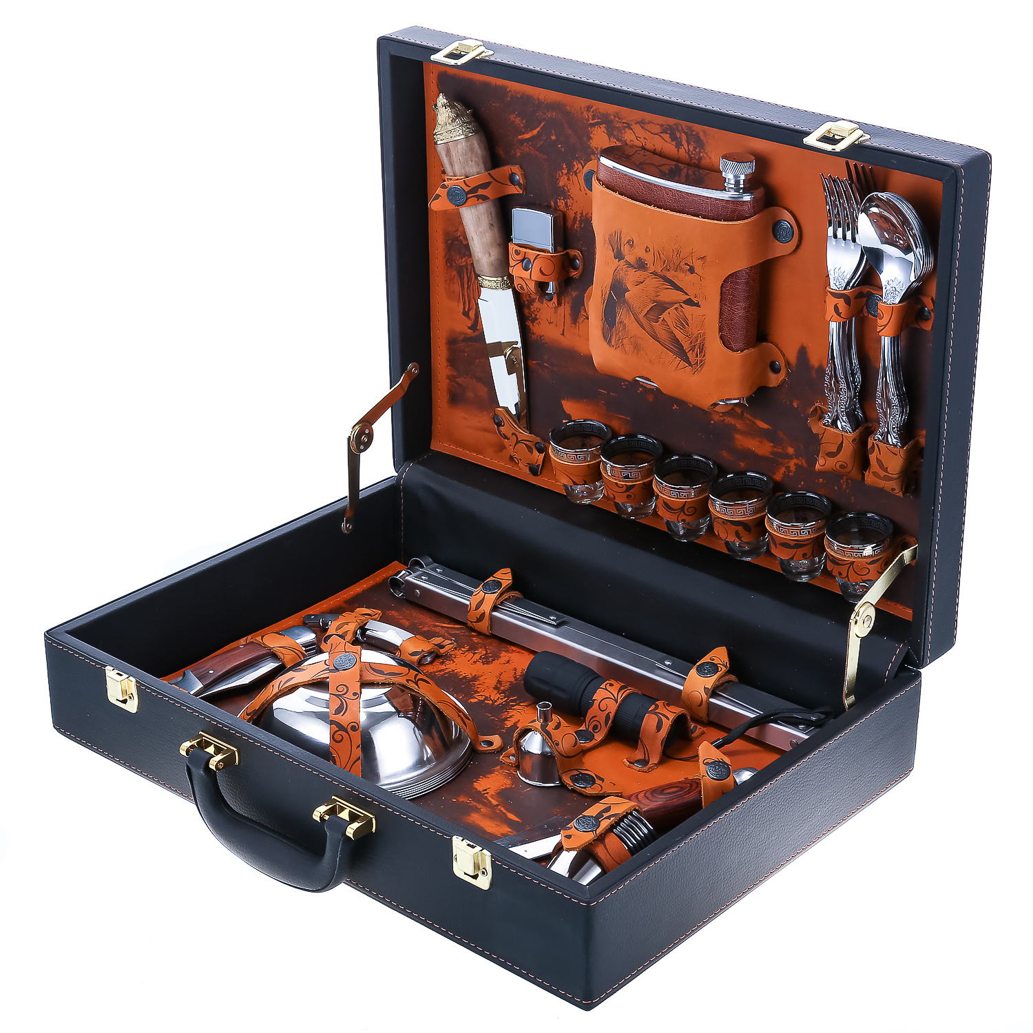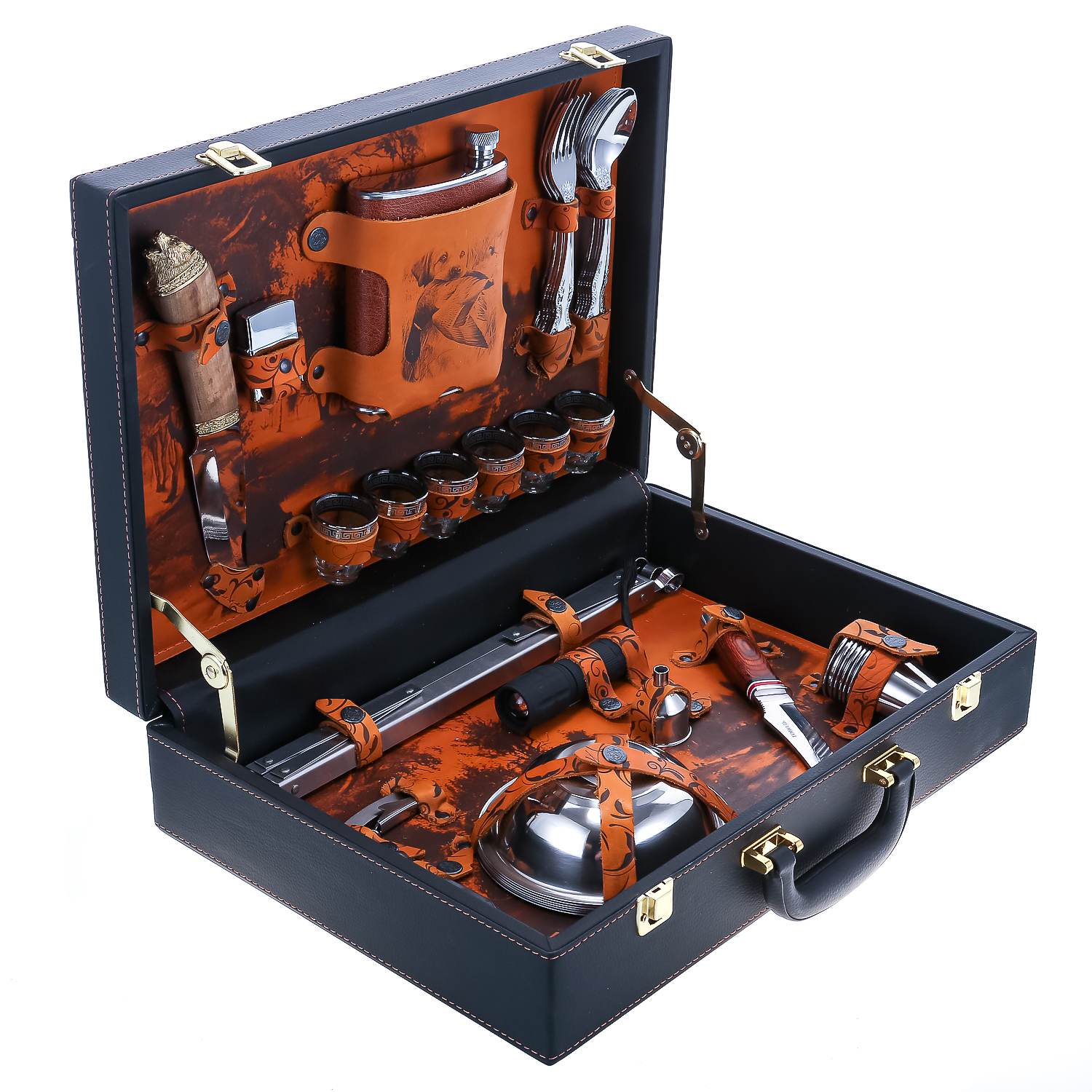 Набор для пикника на 6 персон "Подарочный".Комплектация: фляга, стопка 6 шт., вилка 6 шт., ложка 6 шт., нож 3 шт., зажигалка, мангал, фонарь, воронка, стакан 6 шт., тарелка 6 шт., штопор.