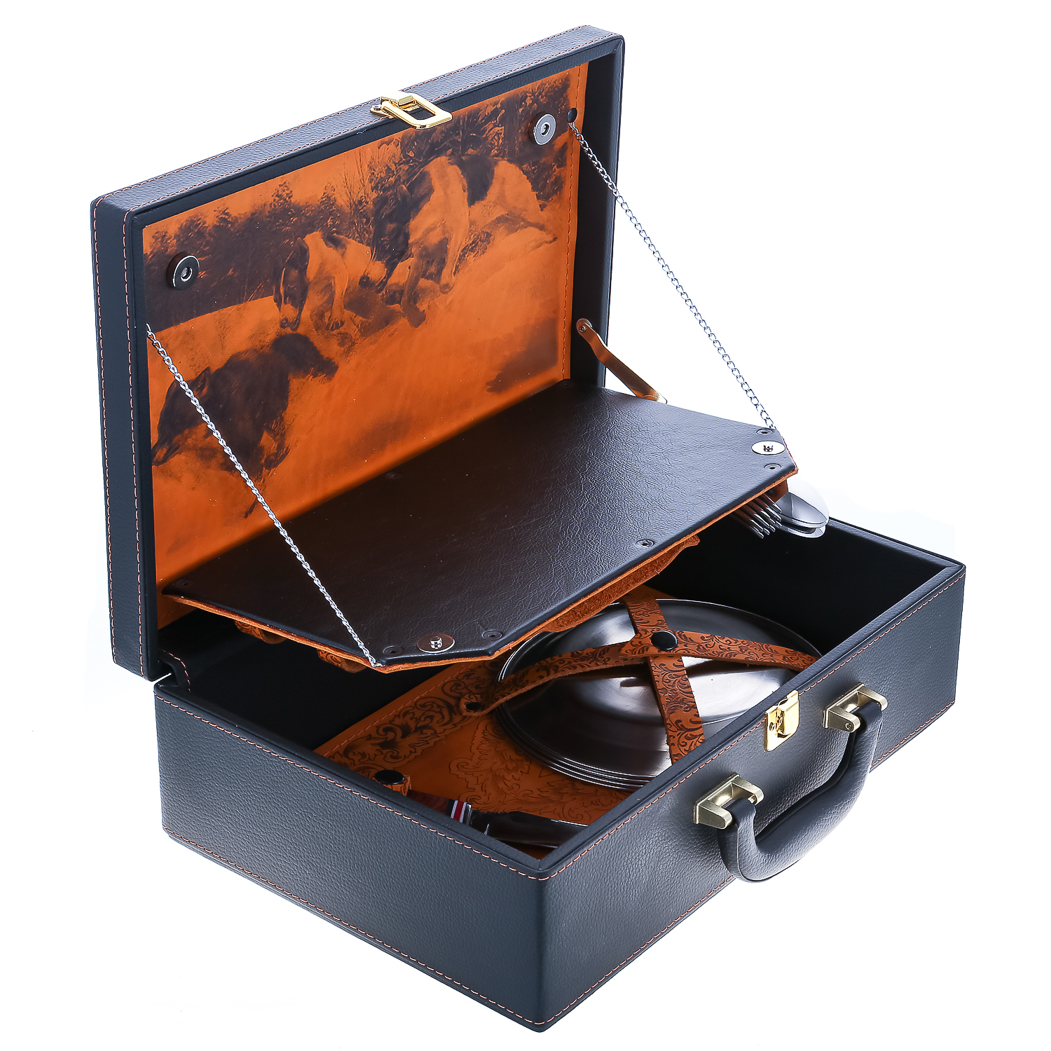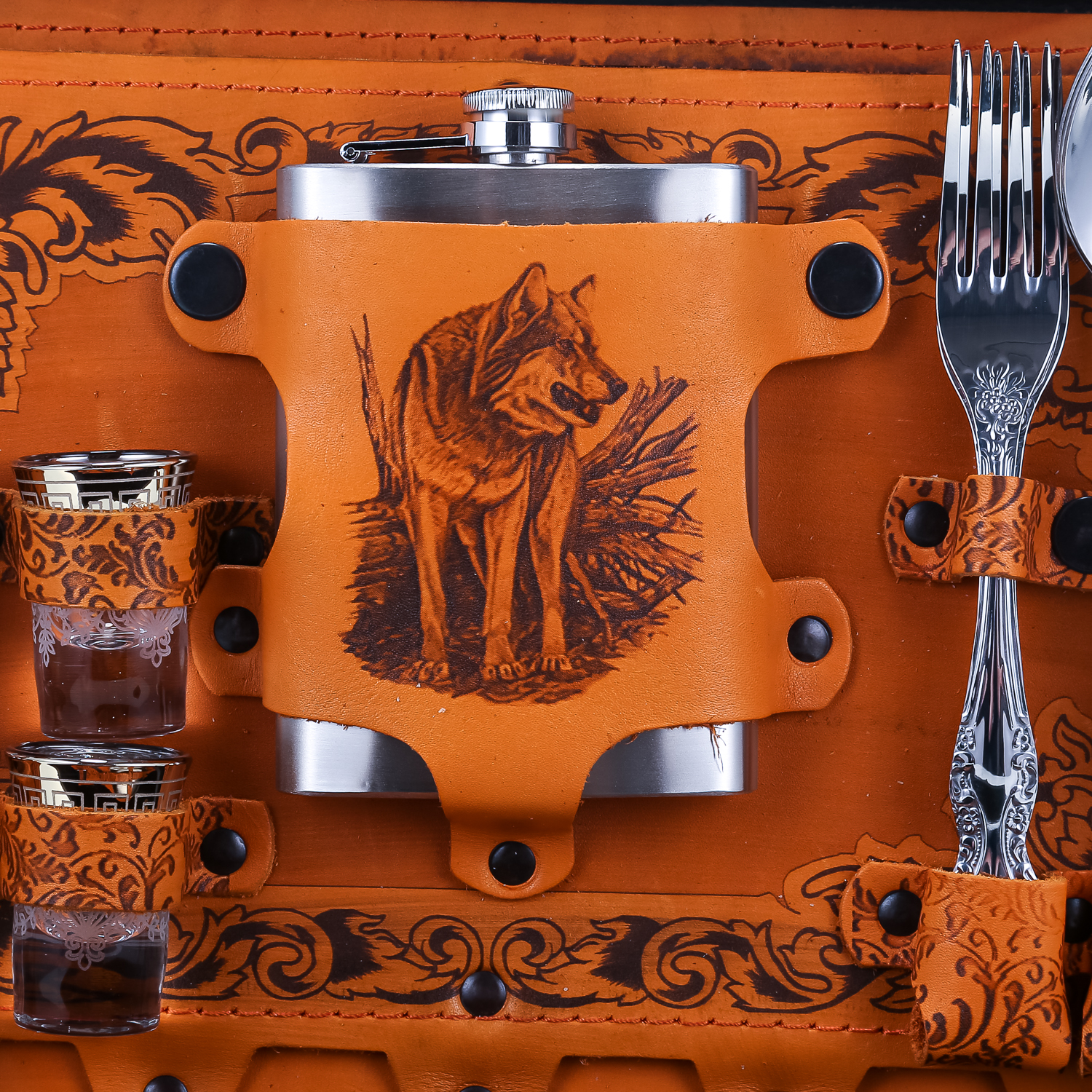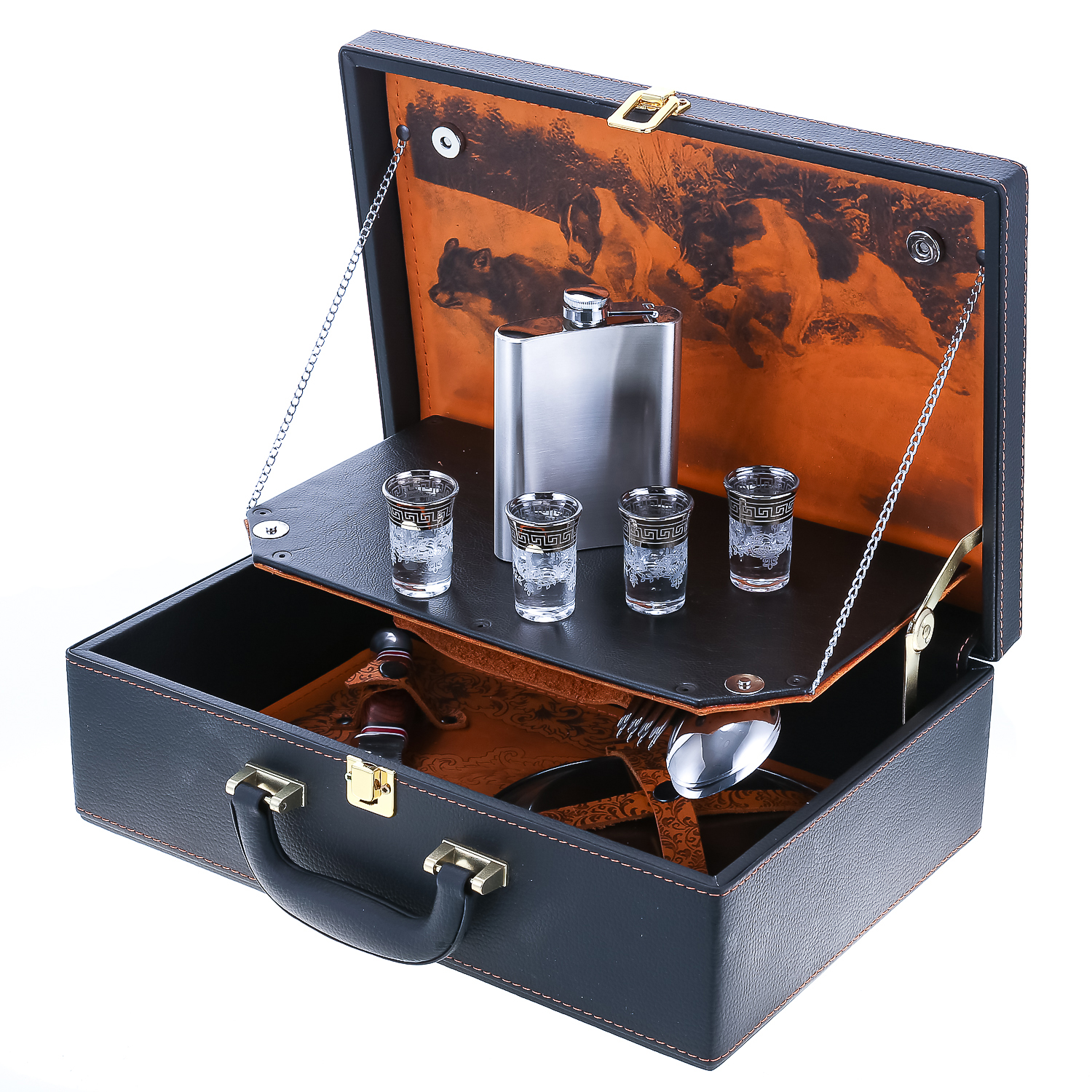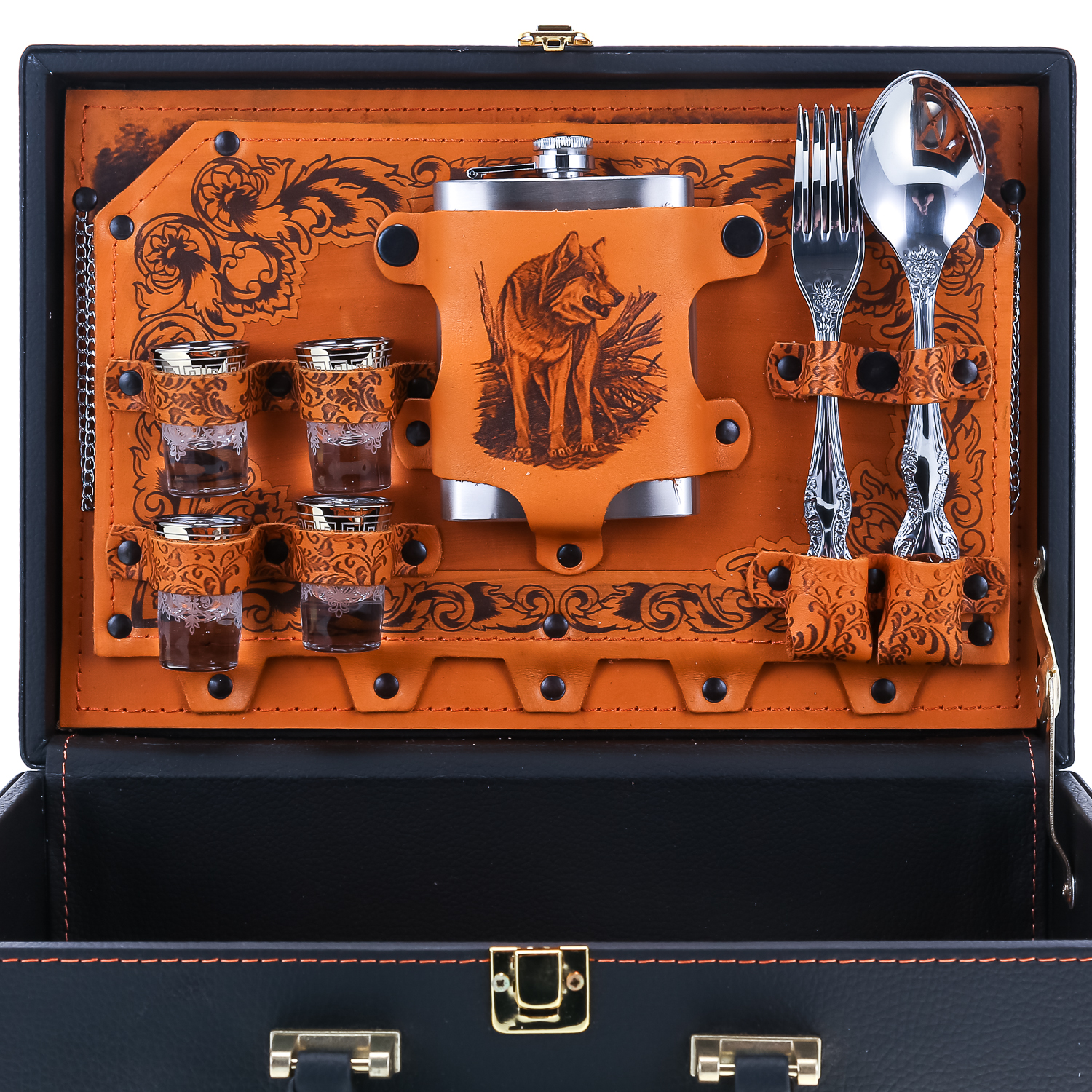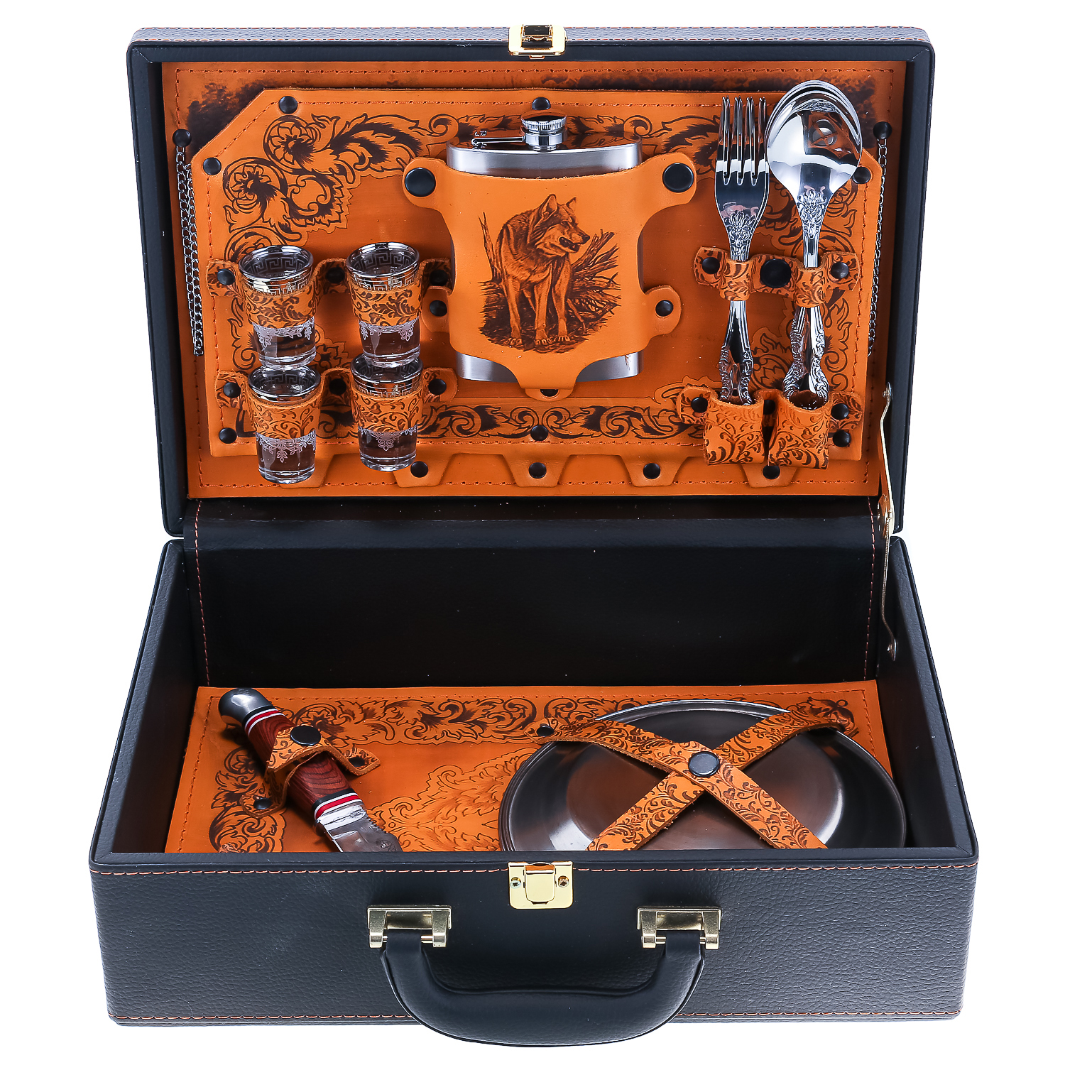 Набор для пикника на 4 персоны "Подарочный".Комплектация: фляга, стопка 4 шт., вилка 4 шт., ложка 4 шт., тарелка 4 шт., нож, зажигалка
