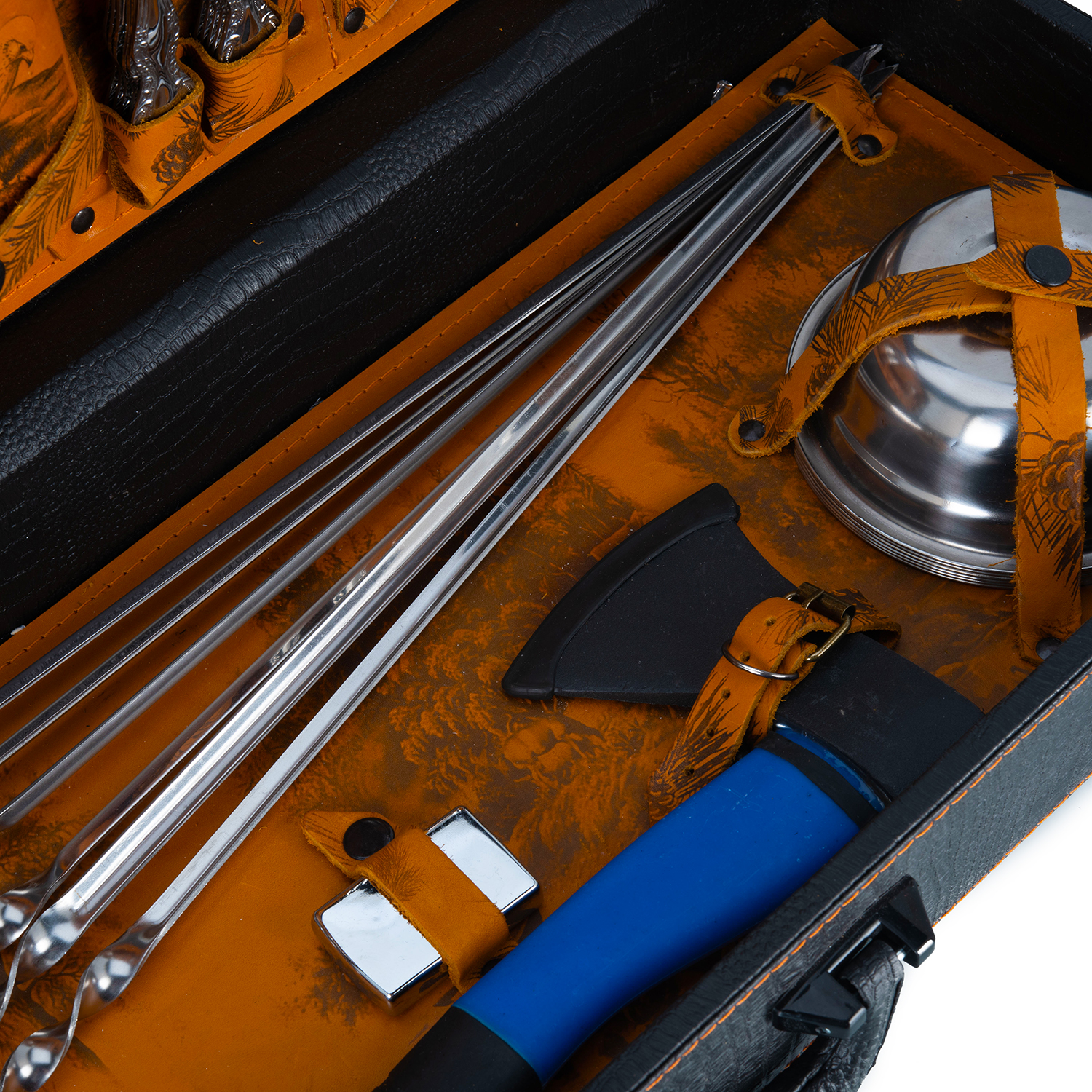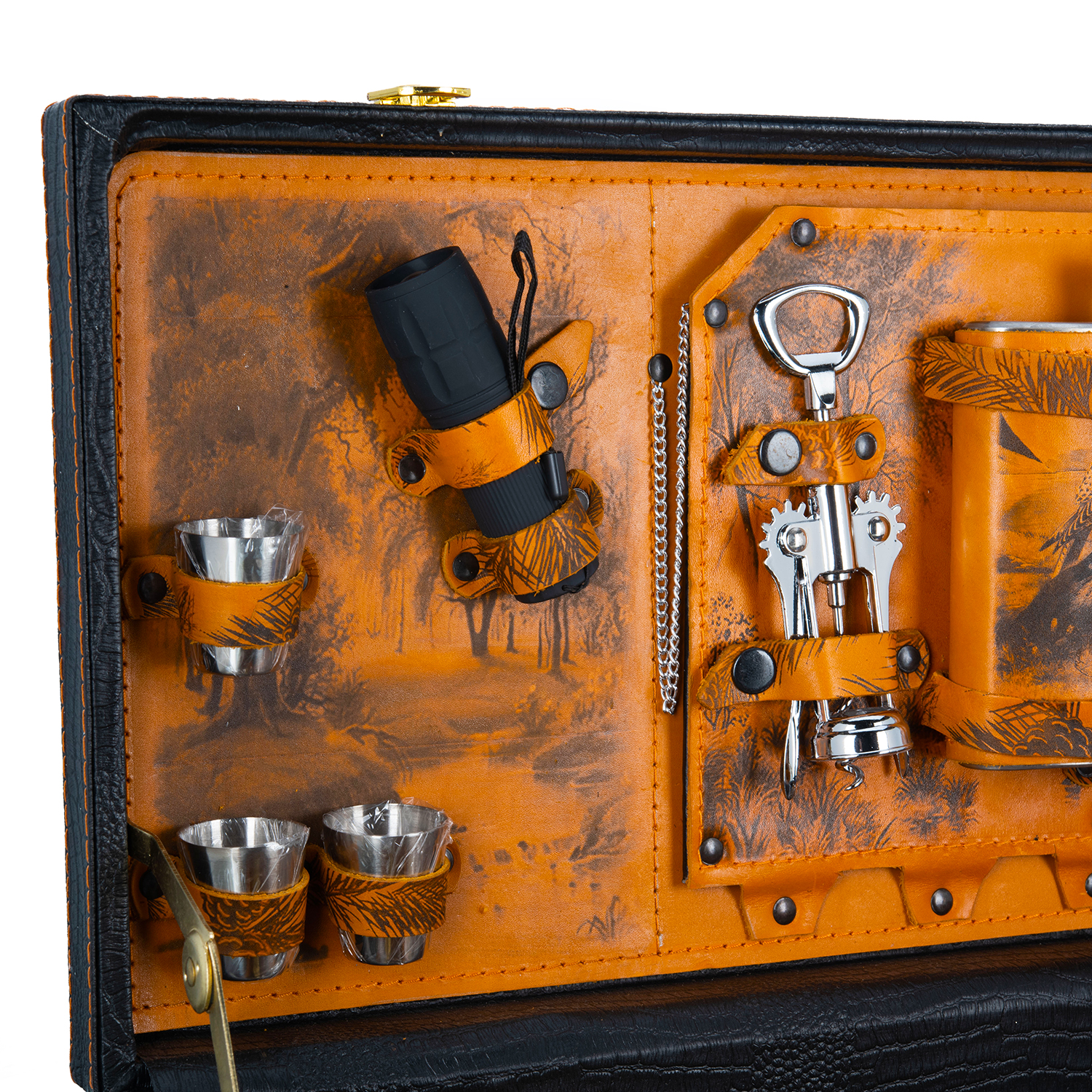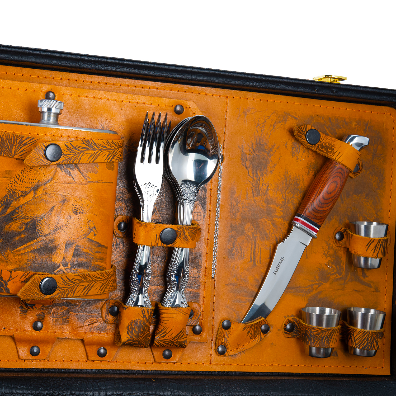 Комплектация: фляга 1 шт., стопка 6 шт., вилка 6 шт., ложка 6 шт., фонарь 1 шт., нож 1 шт., шампур 6 шт., топор 1 шт., зажигалка 1 шт., тарелка 6 шт., штопор 1 шт.