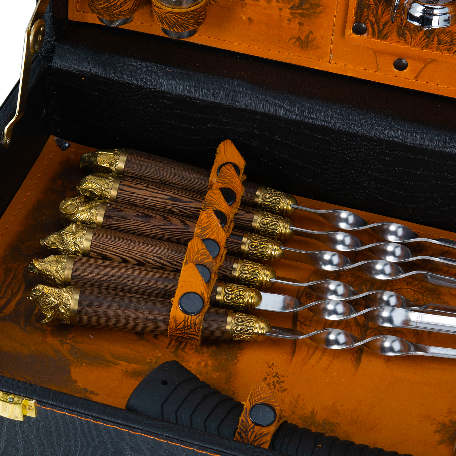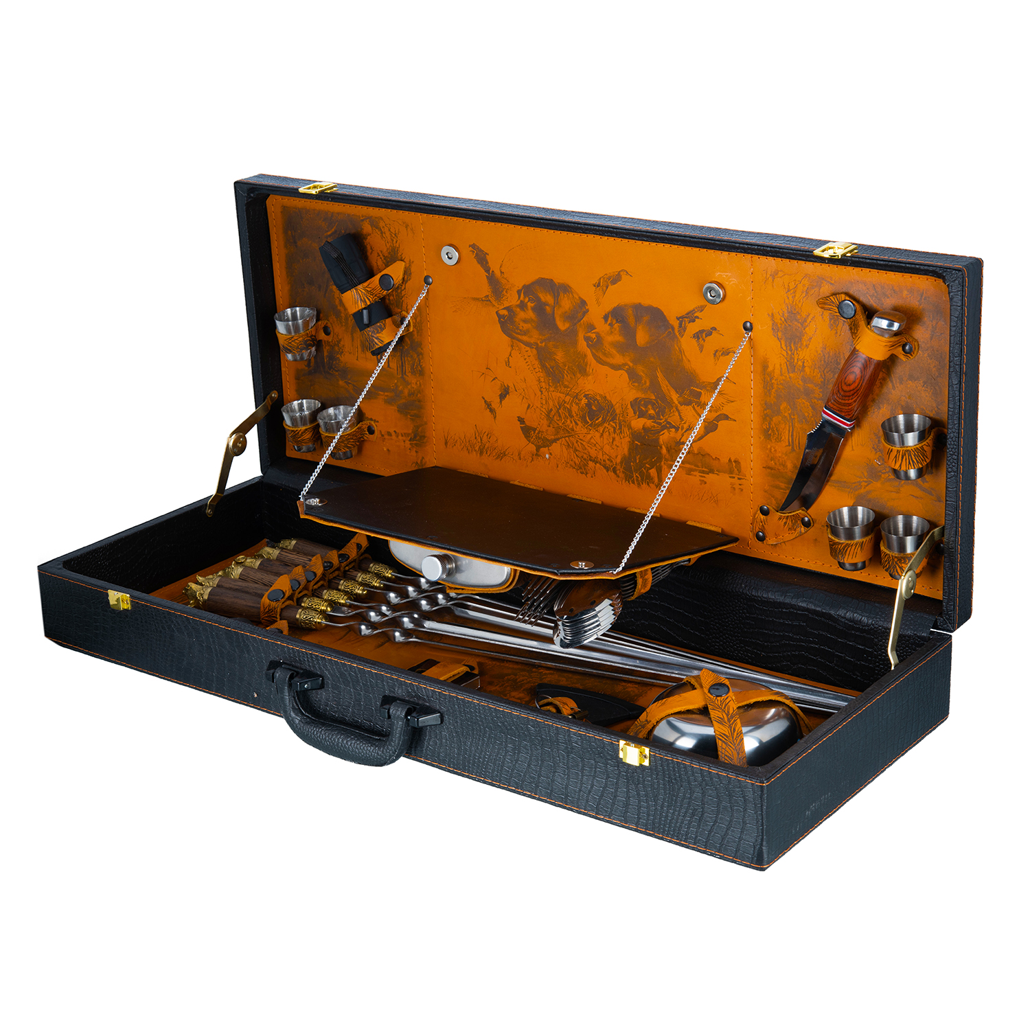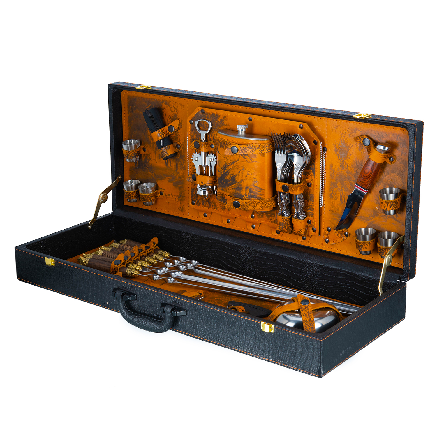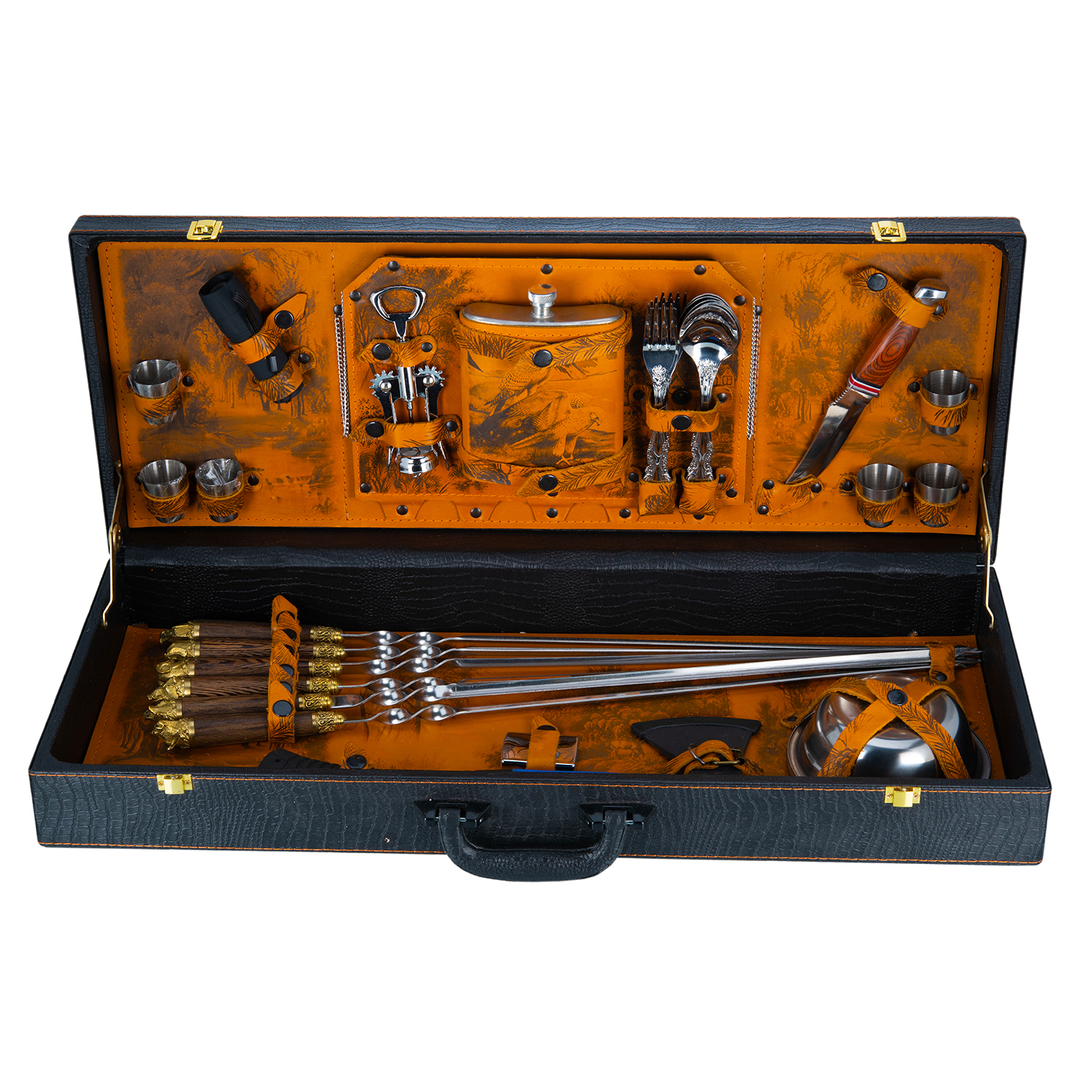 Комплектация: фляга 1 шт., стопка 6 шт., вилка 6 шт., ложка 6 шт., фонарь 1 шт., нож 1 шт., шампур 6 шт., топор 1 шт., зажигалка 1 шт., тарелка 6 шт., штопор 1 шт.