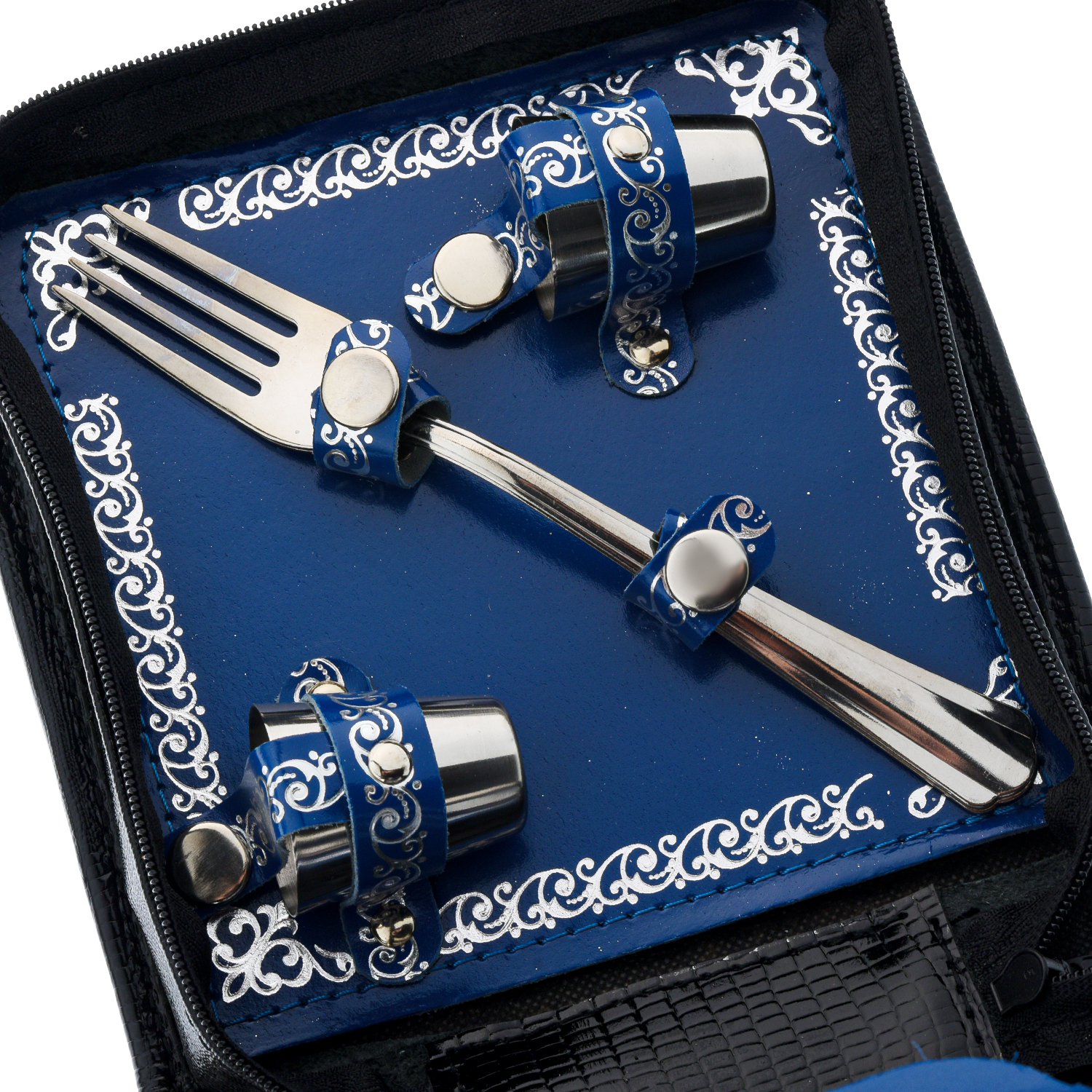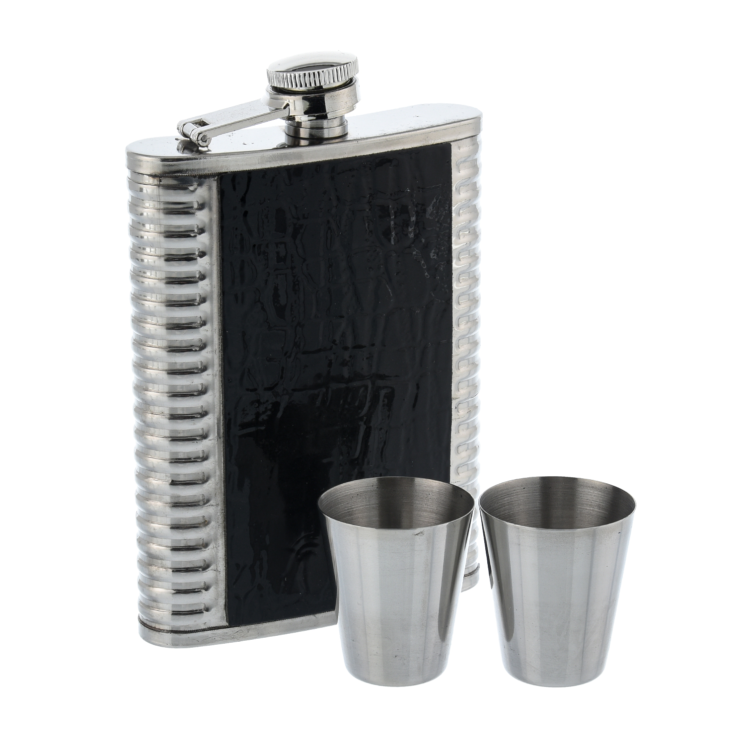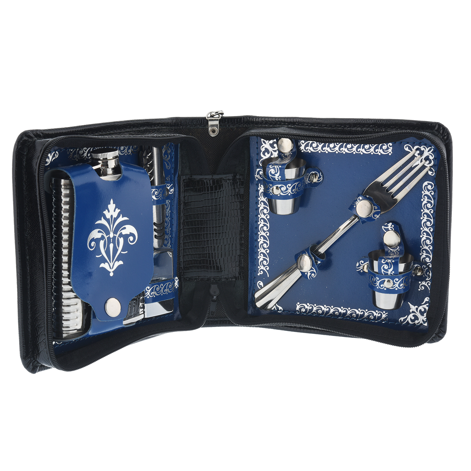 Комплектация: фляга 1 шт., стопка 2 шт., вилка 2 шт., складной нож 1 шт., зажигалка 1 шт.