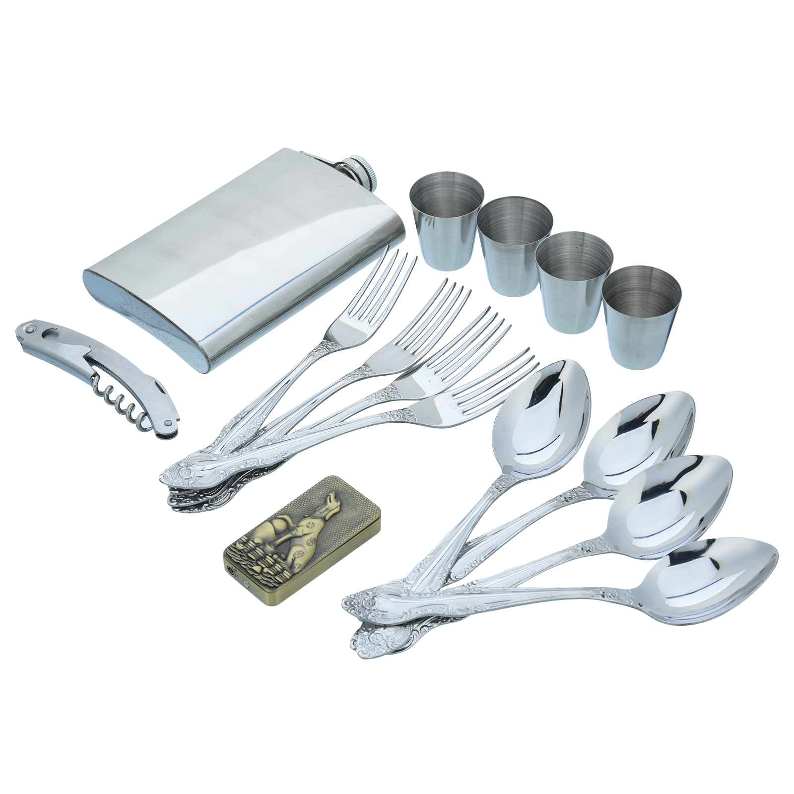 Комплектация: фляга 1 шт., штопор 1 шт., вилка 4 шт., ложка 4 шт., стопка 4 шт., зажигалка 1 шт.